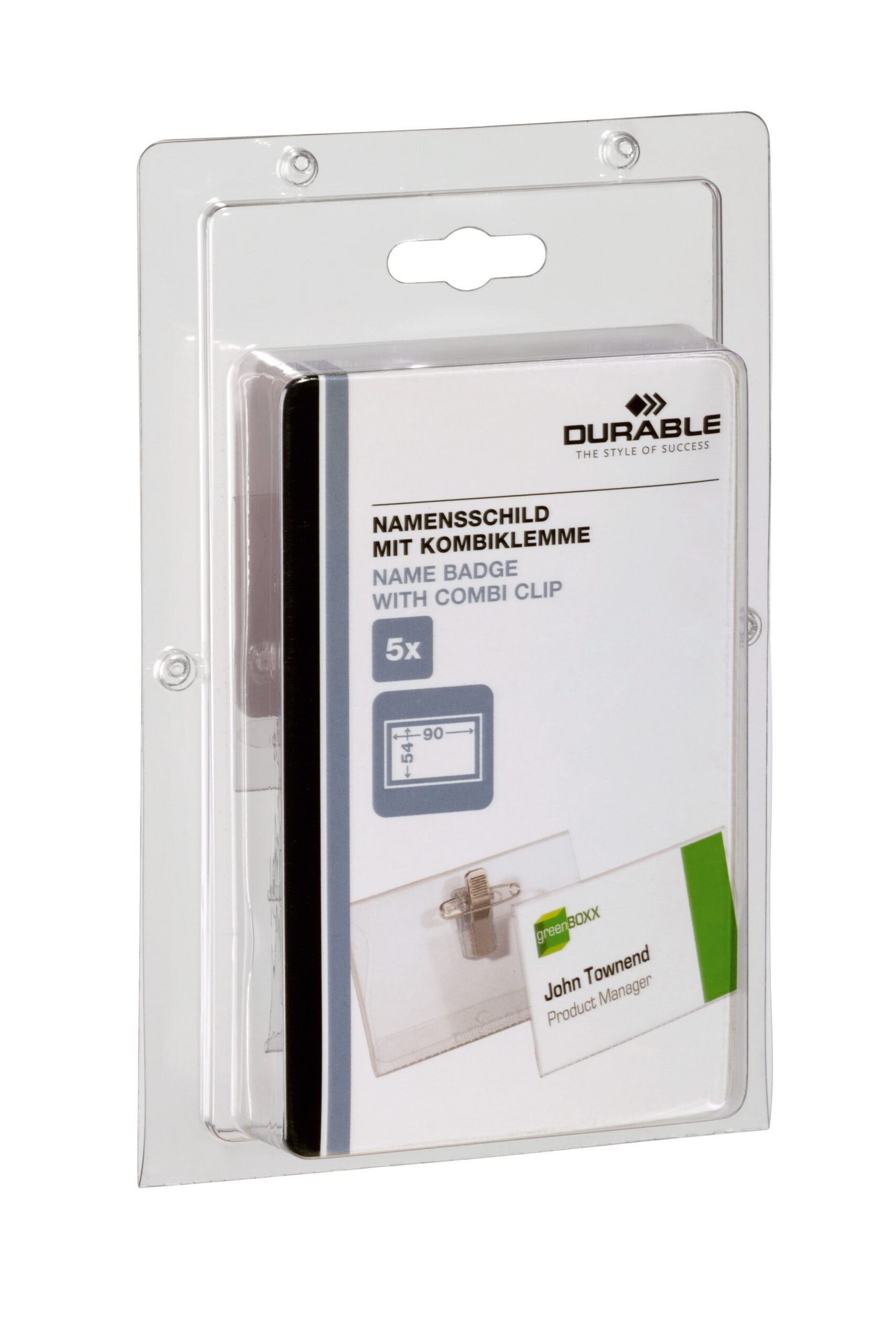 Navneskilt med kombiklemme 90x54mm (BxH). Kombineret sikkerhedsnål/klemme giver valgmulighed for at fastsætte på tøjet. Med tommegreb som gør det enkelt at udskifte indstiksetiketten. Indstik medfølger. Mål indstik: 90x54mm (HxB). Indstiksetiket på A4 ark til udskrivning i printer kan bestilles separat (varenr. 145502). Design selv en personlig designet kongressmærke med gratis skabelon på www.duraprint.dk