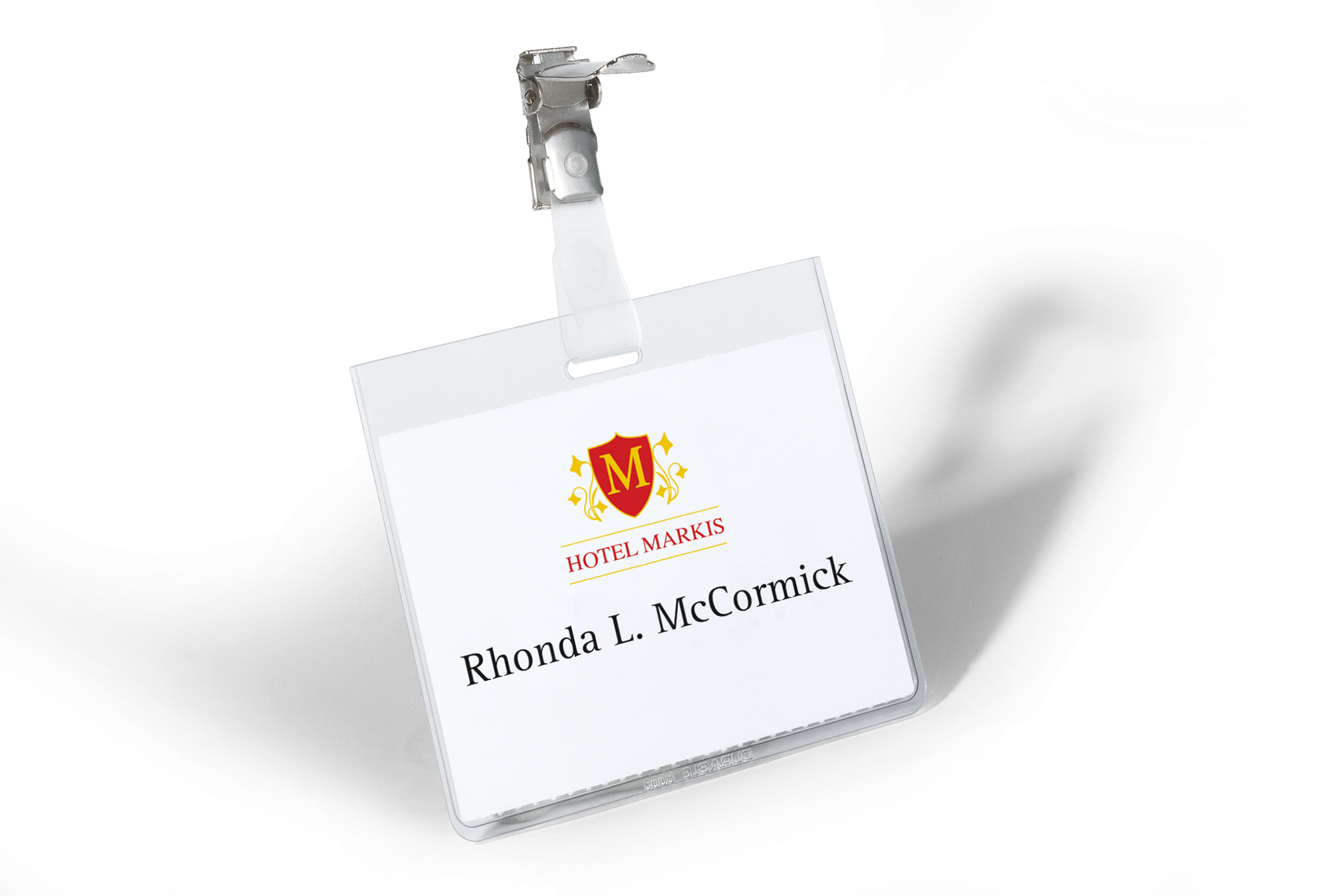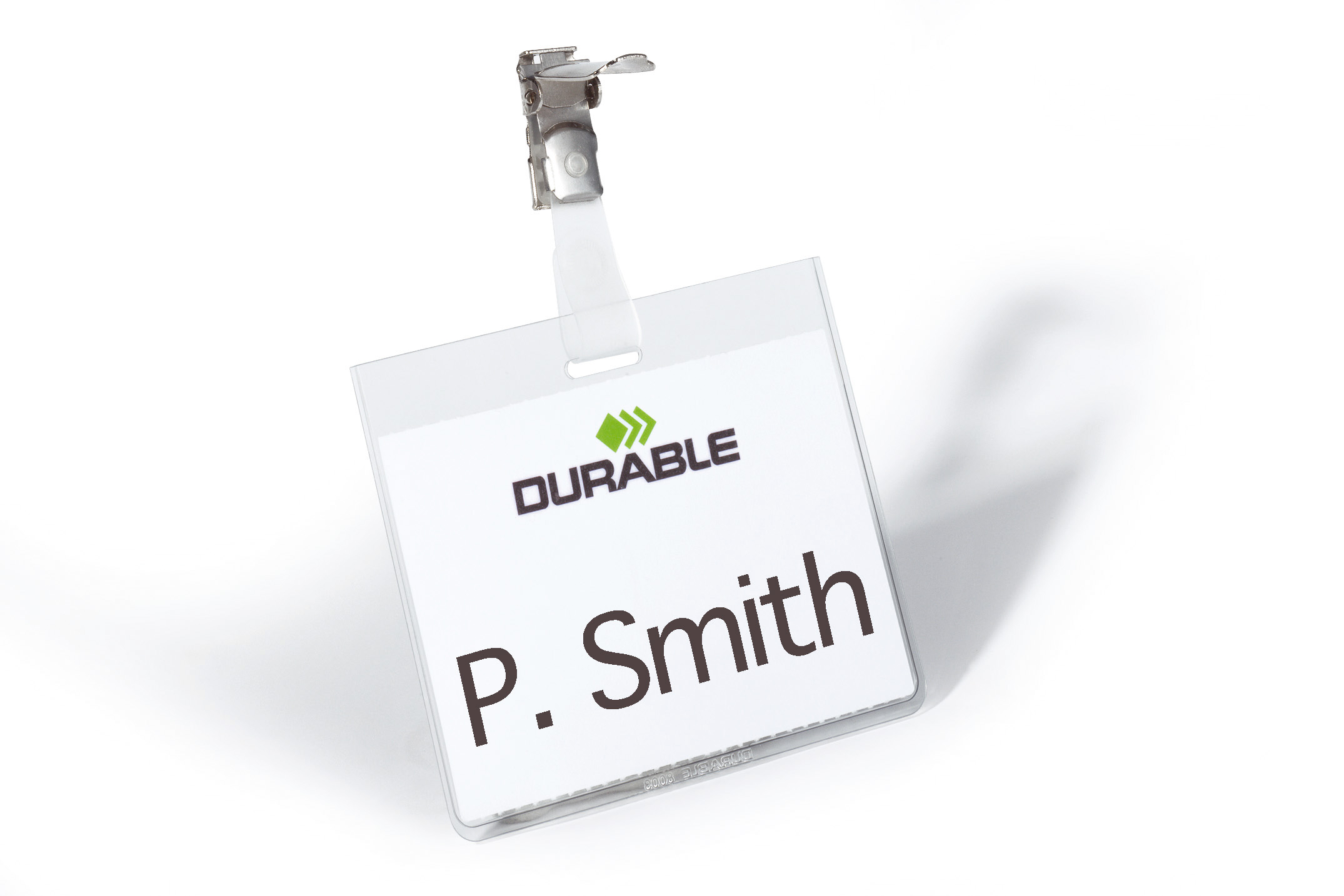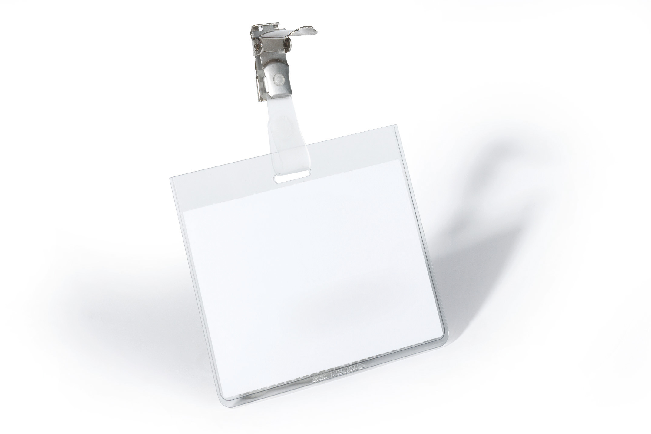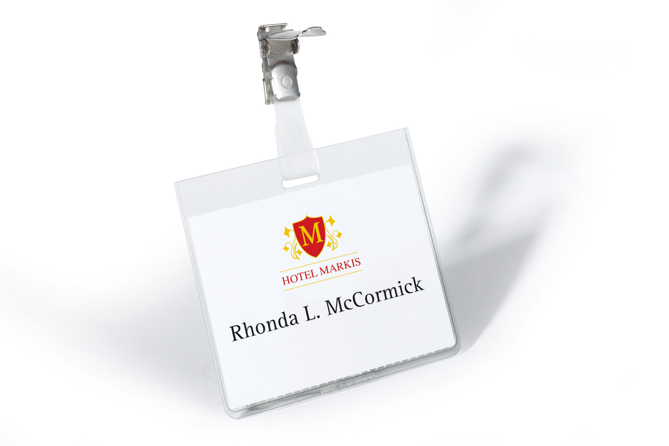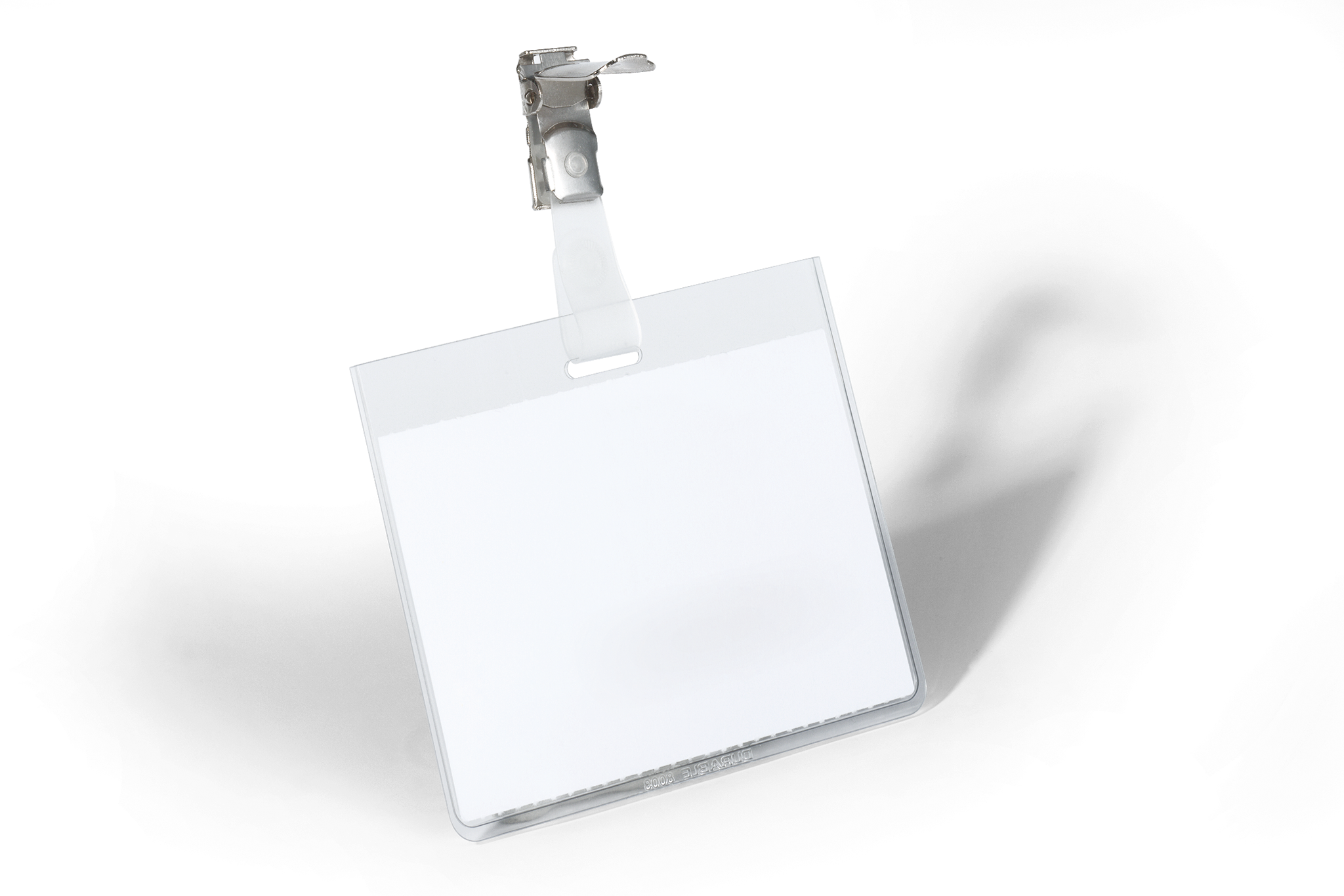 Navneskilt i tværformat med klemme på strop (seleclips). Navneskiltet hænger altid i den rigtige position idet at metalklemmen er drejelig. Ved fastgørelse og lukning af strop forsegler lommen, sikring af indstikket. Hul design tillader kombination med kæde, yoyo eller tekstil halsbånd. Indstik medfølger. Mål indstik: 60x90mm (HxB). Indstiksetiket på A4 ark til udskrivning i printer kan bestilles separat (Durable art nr 145602). Design selv en personlig designet kongresmærke med gratis skabelon på www.duraprint.eu.