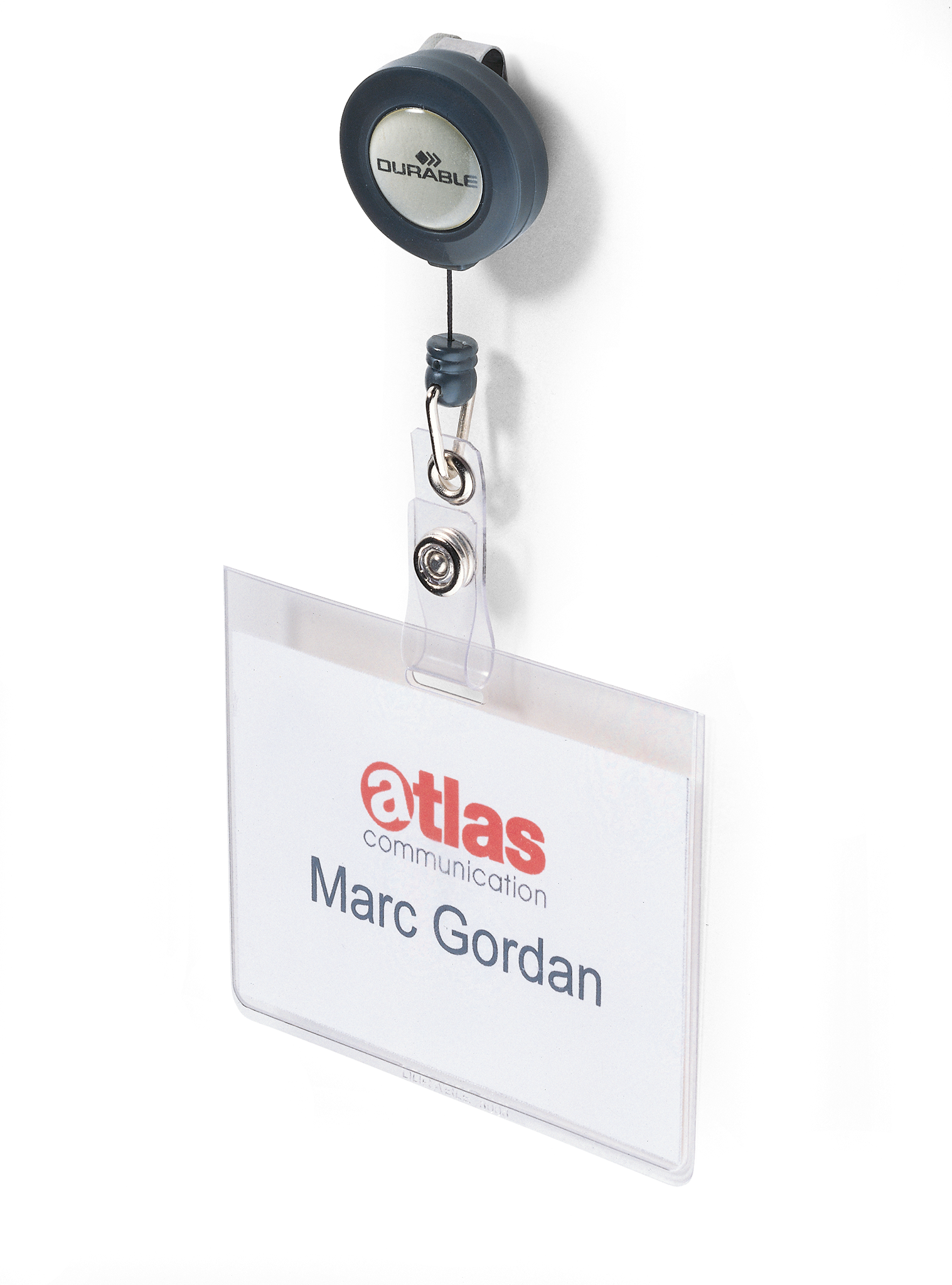 Navneskilt i tværformat og yoyo med 80 cm udtræk der vedhæftet forsegler lommen. Metalclips på bagsiden af yoyo til fastgørelse til dit bælte eller linning. Indstik medfølger. Mål indstik: 60x90mm (HxB). Indstiksetiket på A4 ark til udskrivning i printer kan bestilles separat (Durable art nr 145602). Design selv en personlig designet kongresmærke med gratis skabelon på www.duraprint.dk