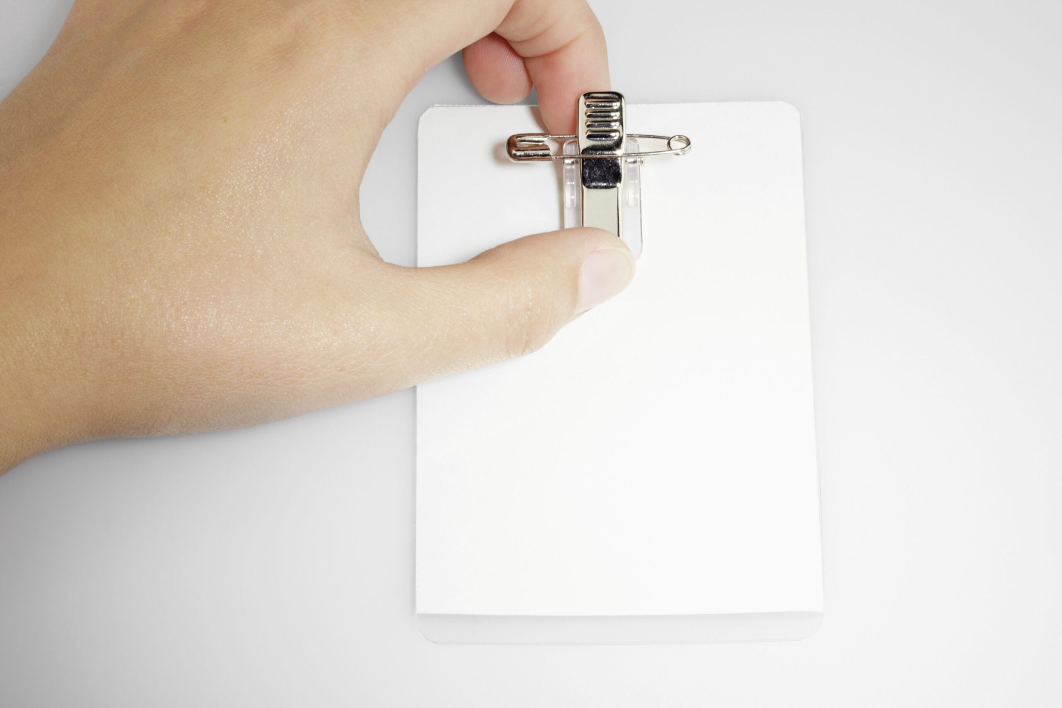 Navneskilt selvlaminerende 54×90 mmSelvlaminerende navneskilt med nål/klemme.