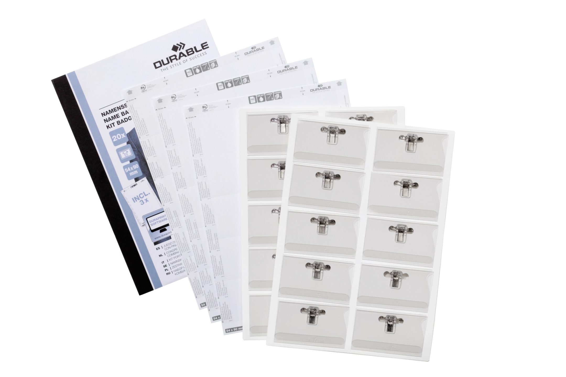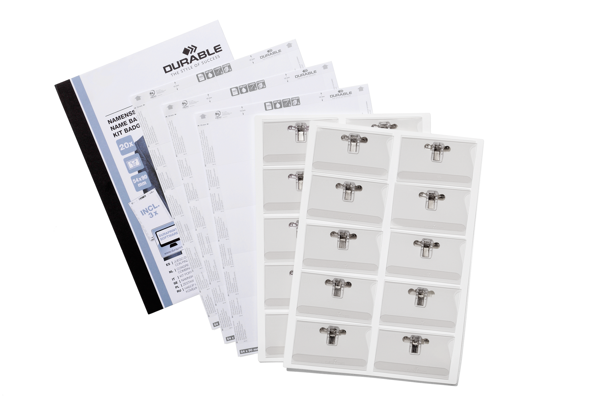 Navneskilt sæt m nål/klemme 54x90mmSæt med 20 stk navneskilt med nål/klemme og tre A4 ark med indstik.