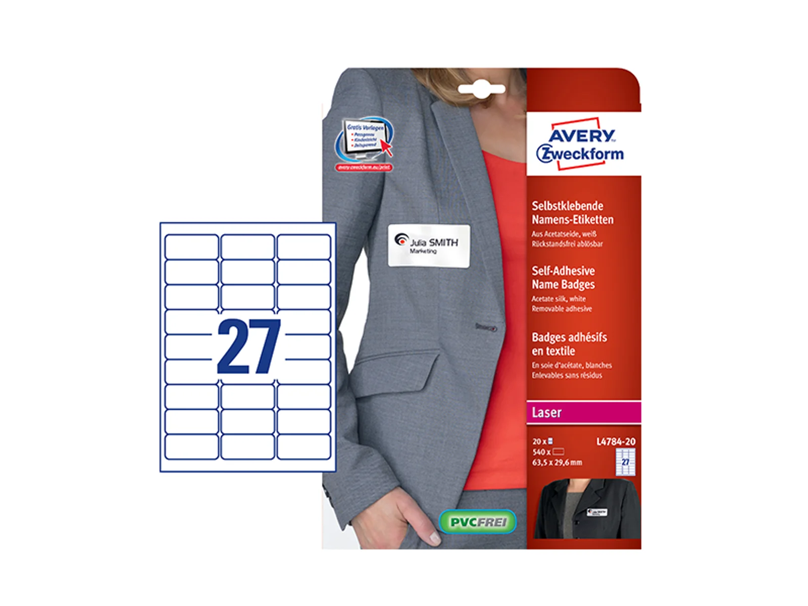 Avery’s L4784-20 selvklæbende navneskilte har 27 navneetiketter/ark og 540 navneetiketter/pk, hvor hver etiket måler 63,5 x 29,6. Den lille navneetiket gør dem velegnet til de mest nødvendige oplysninger som navn og firma. Navneetiketten er fremstillet i et PVC-frit silkemateriale, som giver et flot og eksklusivt look. Etiketterne klæber på alle tekstiler undtagen sarte tekstiler som silke, fløjl mv. De kan naturligvis fjernes igen uden at de efterlader mærker på tøjet. Navneetiketterne er nemme at skille fra hinanden på det printede ark, hvilket giver en stor tidsbesparende, ved sortering og distribution af navneskilte til store arrangementer. Etiketterne kan printes i alle laser- og farvelaserprintere. Du kan nemt og helt gratis designe og printe dine Avery produkter med vores software Avery Design & Print, hvor du finder skabeloner, grafik og designs. Læs mere om softwaren her: www.avery.dk/software.