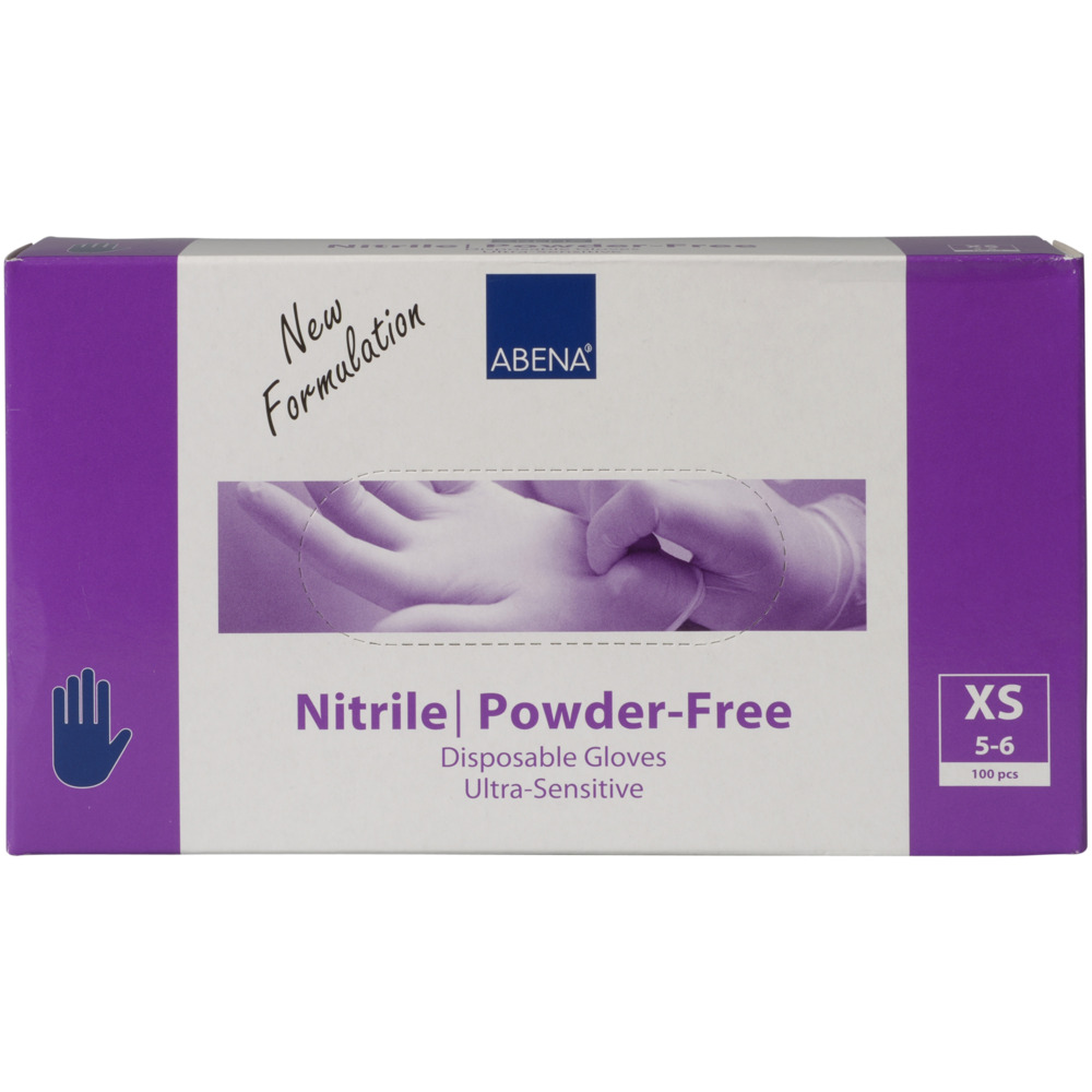 Latexfri engangshandsker af blå nitril. Æske med 100 handsker i størrelse ekstra small.
