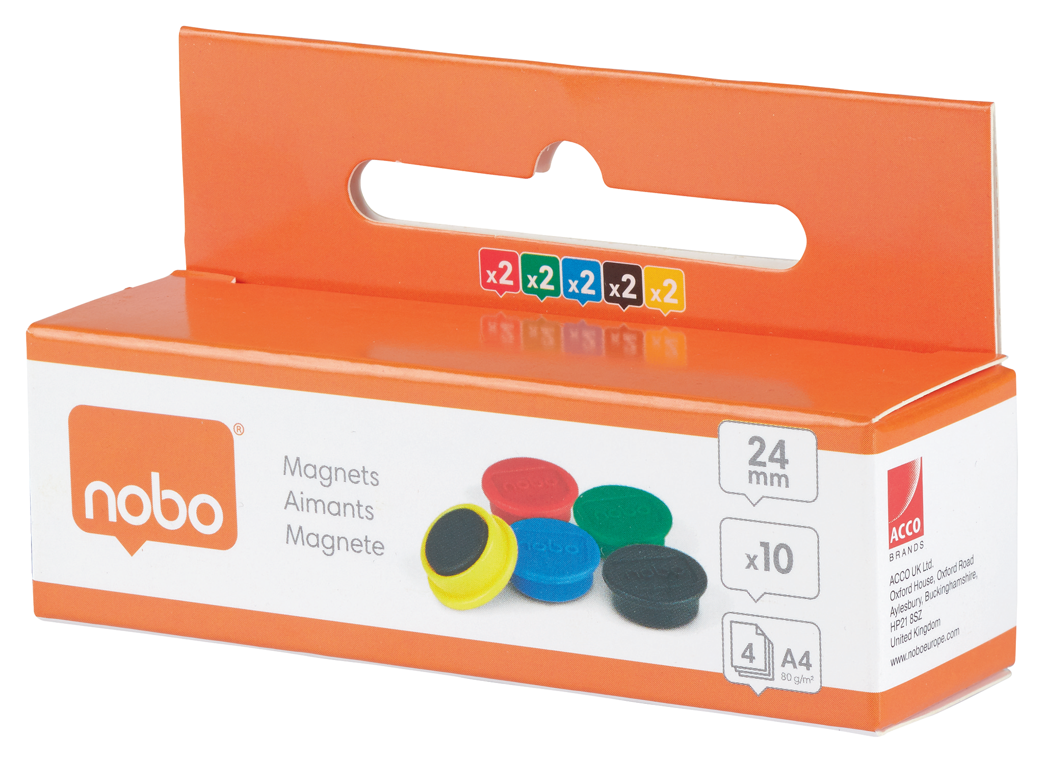 Runde magneter er det perfekte værktøj til at vise og visualisere ideer til fælles brainstorming på magnetiske whiteboards eller bruge som køleskabsmagneter til at fastgøre påmindelser og vigtige beskeder pænt derhjemme. Disse farvede magneter holder 4 x 80 A4-ark sikkert og er 24 mm i diameter. Magnetstyrke 300g, pakke med 10 assorterede magneter (2 x rød, 2 x grøn, 2 x blå, 2 x sort, 2 x gul)