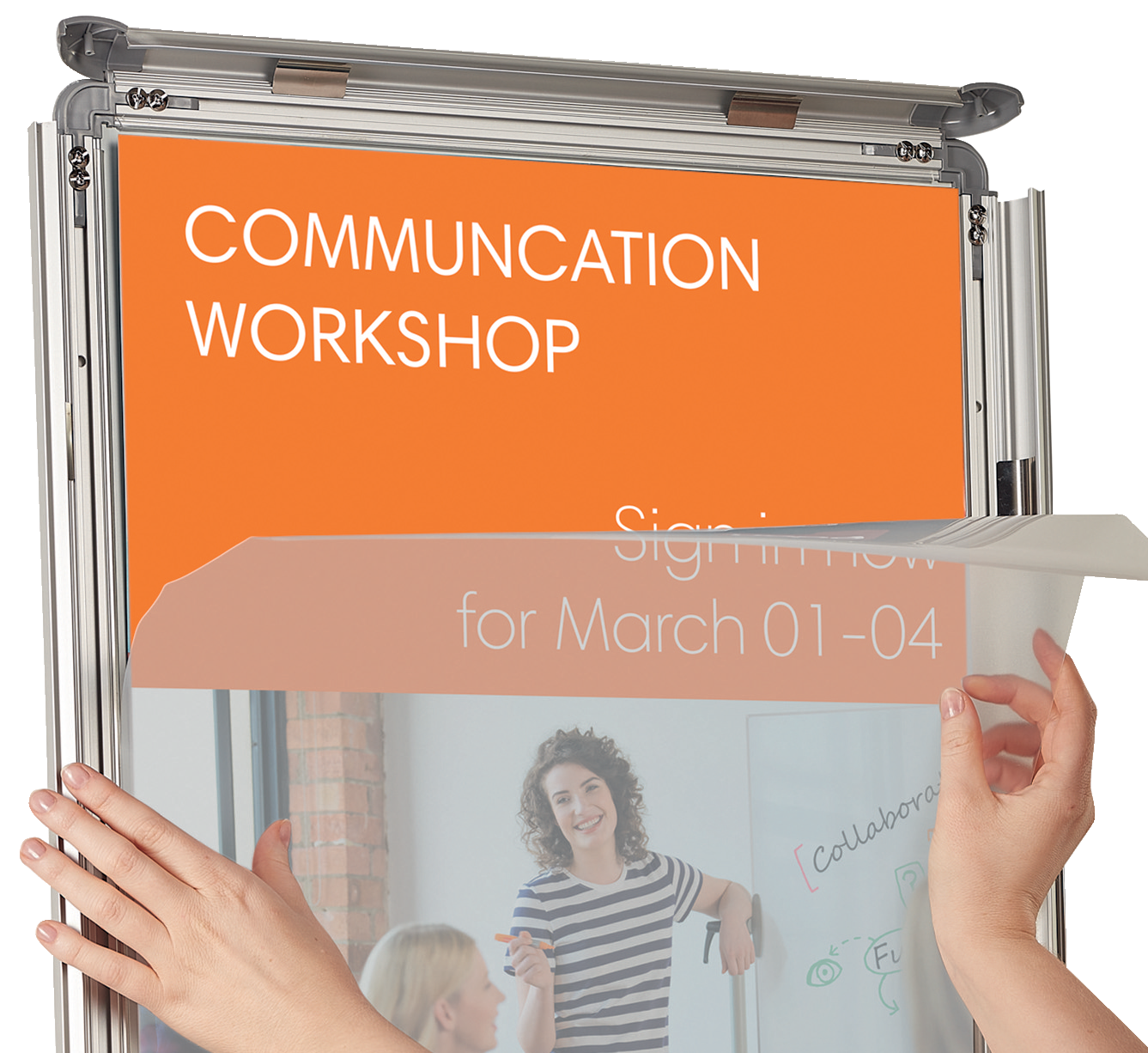 Vægmonteret skifteramme til sikker visning af plakater, skilte og information. Den smarte aluminiums klikramme giver en professionel finish og giver hurtig og nem ændring af indhold. Denne stabile og sikre skiltholder har en bagside, der sættes fast til væggen ved hjælp af hjørnemontage, og det beskyttende antirefleks glas er let at tørre af. En ideel løsning til visning af midlertidige eller permanente plakater og skilte. Indholdsstørrelse op til A3.