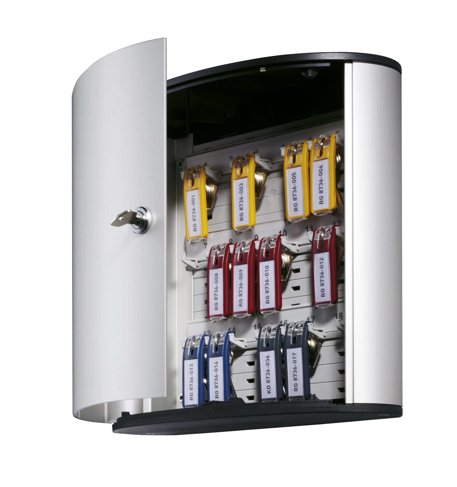 aluminium med bund og top i sort plast. I skabet er der desuden plads til nøgleskilte.