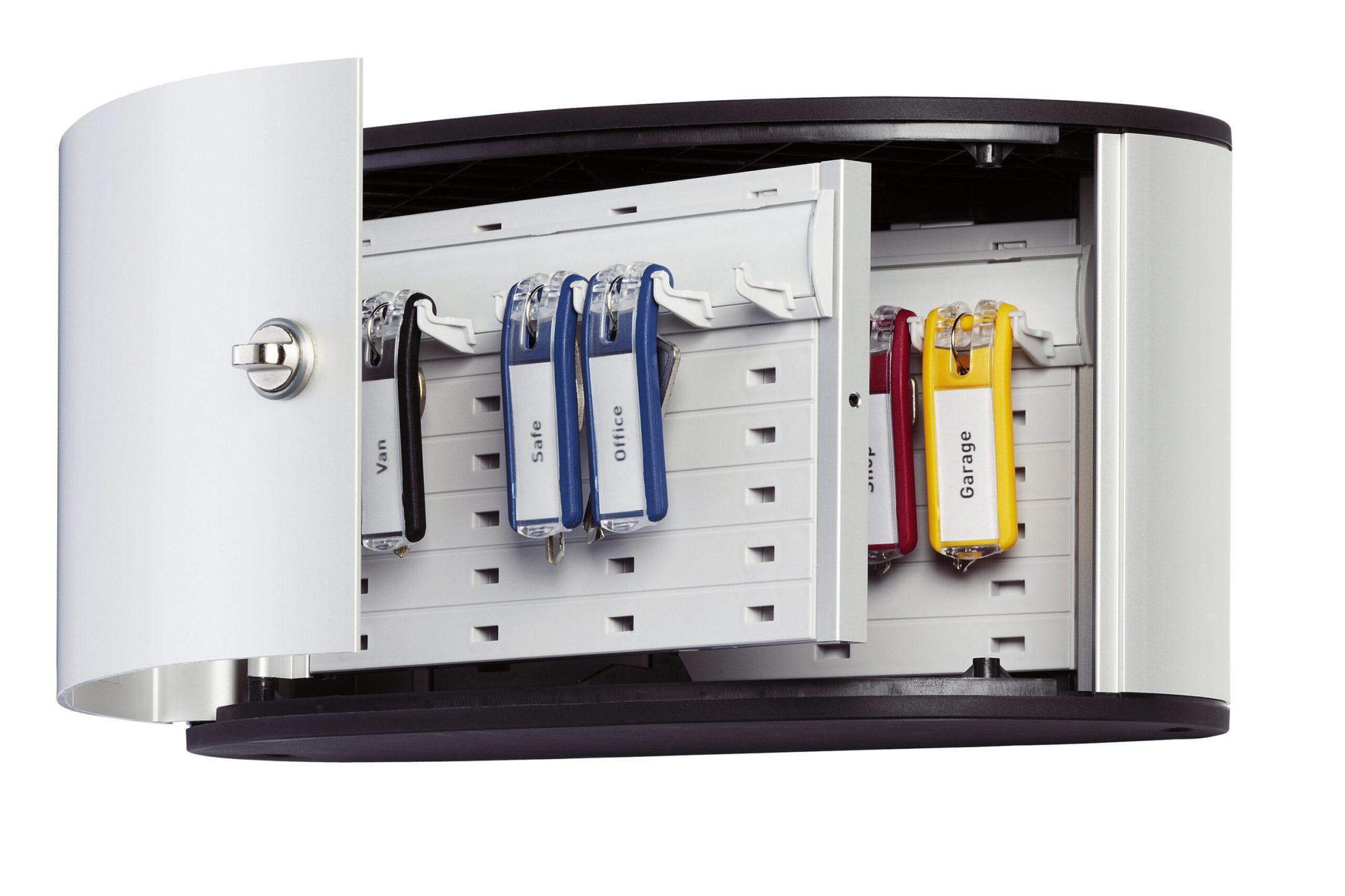 Nøgleskab i aluminium til 12 stk. nøgler. Leveres med drejelås lukning. Med overskuelig indholdsfortegnelse, som gør det nemt at finde den rigtige nøgle. Nøglekrogen kan placeres i flere forskellige højder for at tilpasses efter behov. Praktisk nøgleskilt der hænger fast på sin plads, på den specialdesignet nøglekrog. Enkelt at fastgøre og flytte. Nøgleskiltets etiket kan nemt markeres, hvilket gør det hele overskueligt og nemt at holde styr på sine nøgler. Inklusiv 1 sæt med 6 stk. nøgleskilte (Durable art nr 1957) i rød, gul, blå og sort. Mål 160 x 302 x 118 mm. (HxBxD).