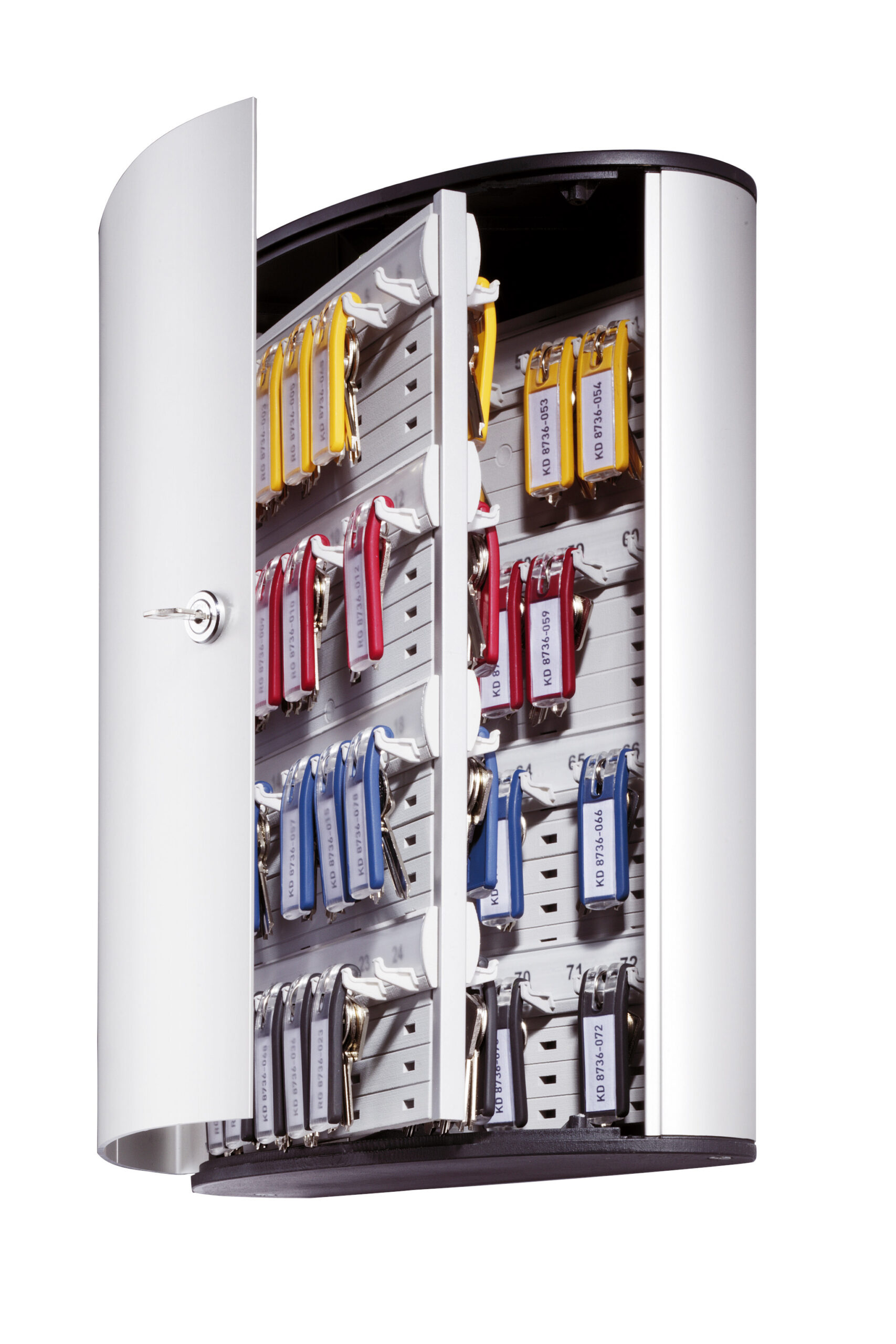 Nøgleskab i aluminium til 72 stk. nøgler. Leveres med cylinderlås og to nøgler samt skruer til montering. Med overskuelig indholdsfortegnelse, som gør det nemt at finde den rigtige nøgle. Nøglekrogen kan placeres i flere forskellige højder for at tilpasses efter behov. Praktisk nøgleskilt der hænger fast på sin plads, på den specialdesignet nøglekrog. Enkelt at fastgøre og flytte. Nøgleskiltets etiket kan nemt markeres, hvilket gør det hele overskueligt og nemt at holde styr på sine nøgler. Inklusiv 1 sæt med 6 stk. nøgleskilte (Durable art nr 1957) i rød, gul, blå og sort. Mål 400 x 302 x 118 mm. (HxBxD).