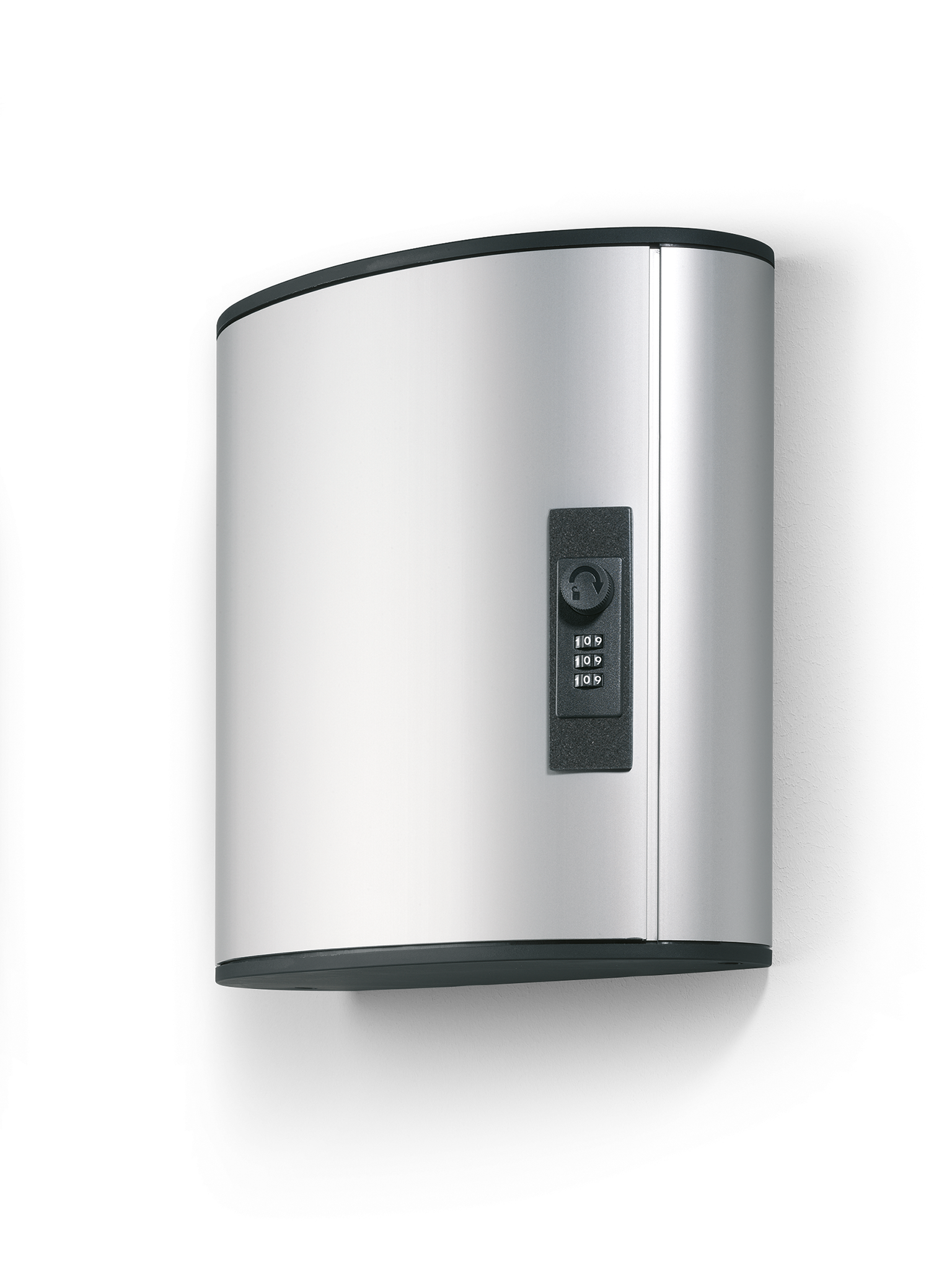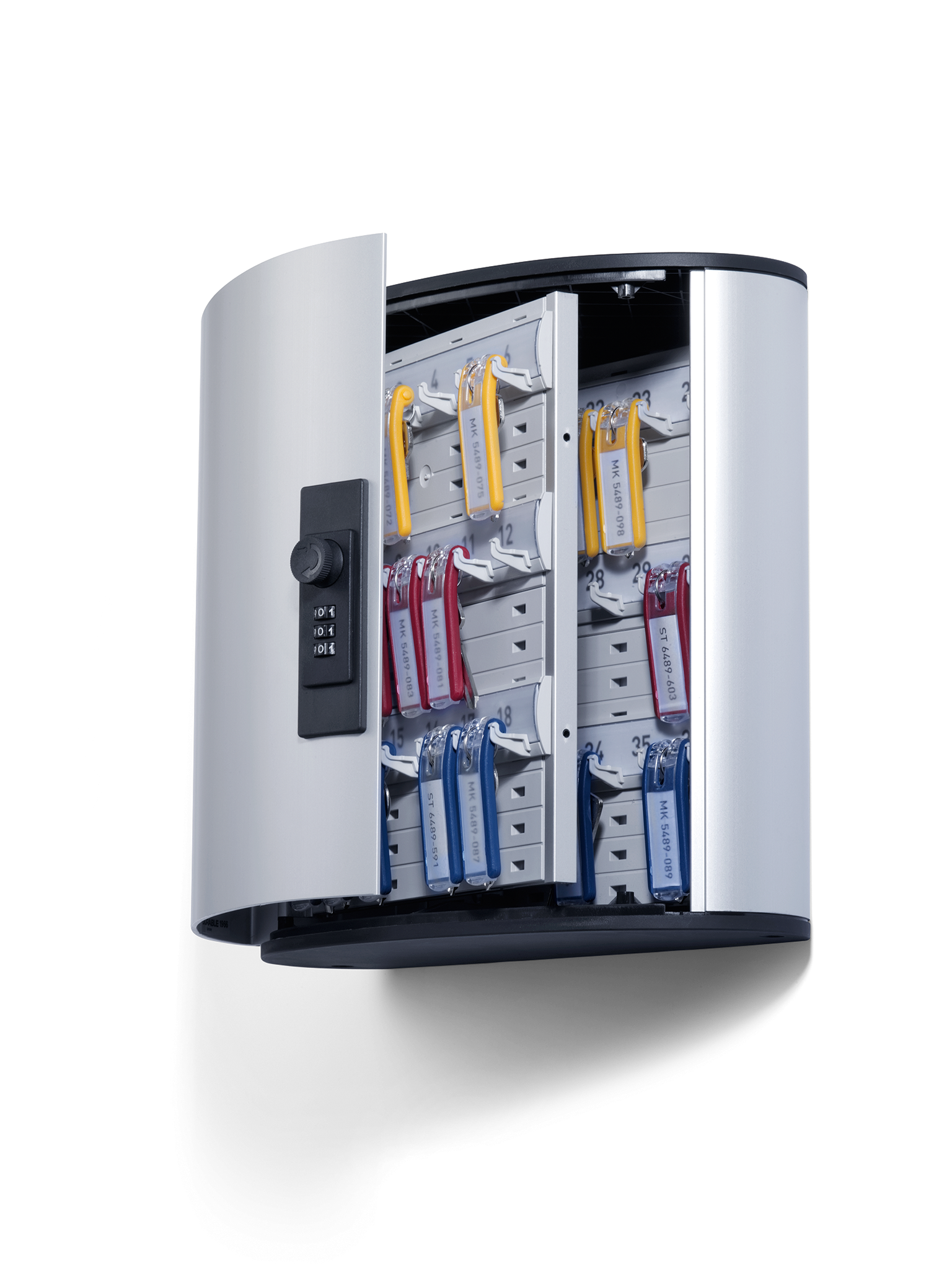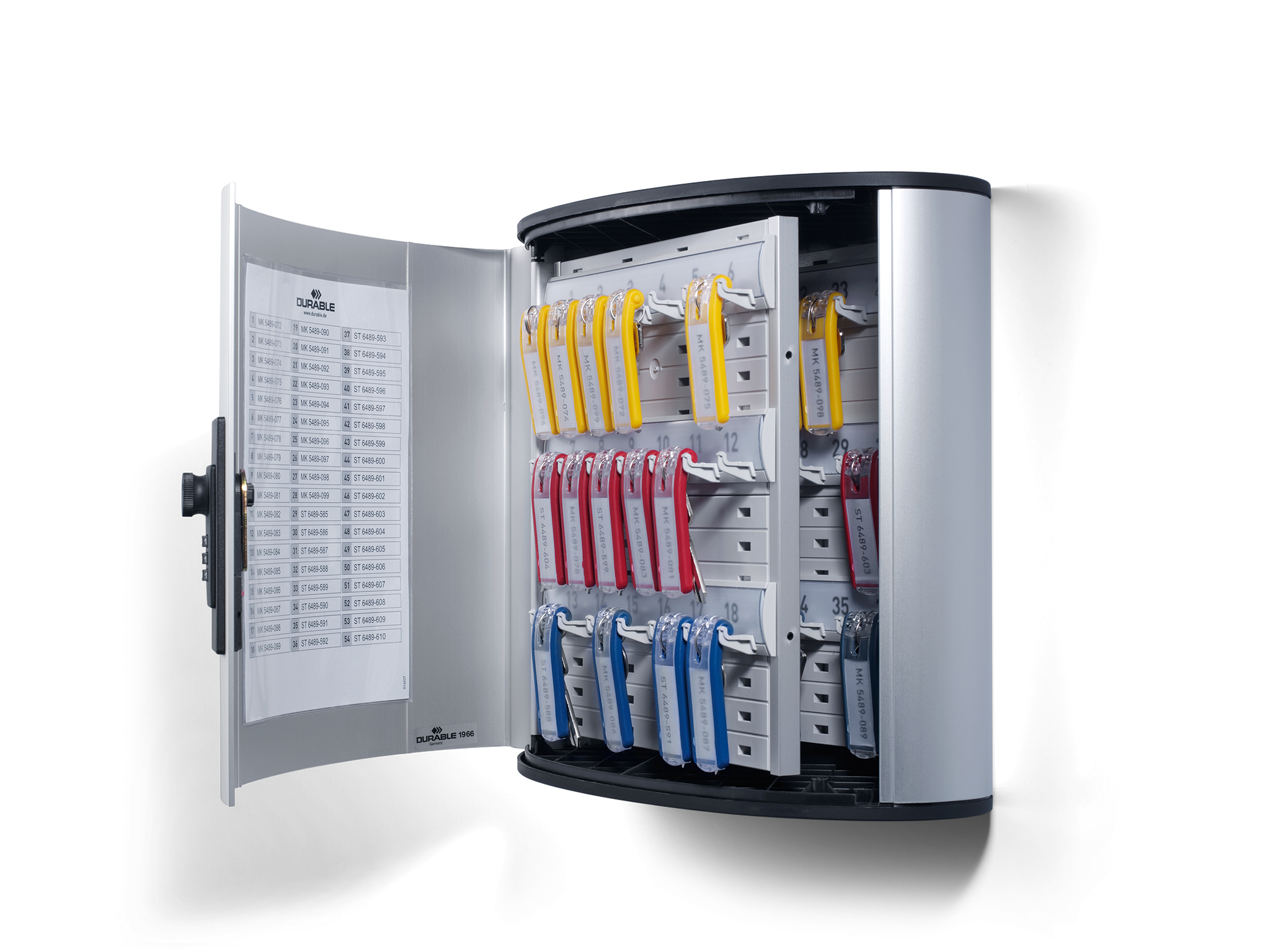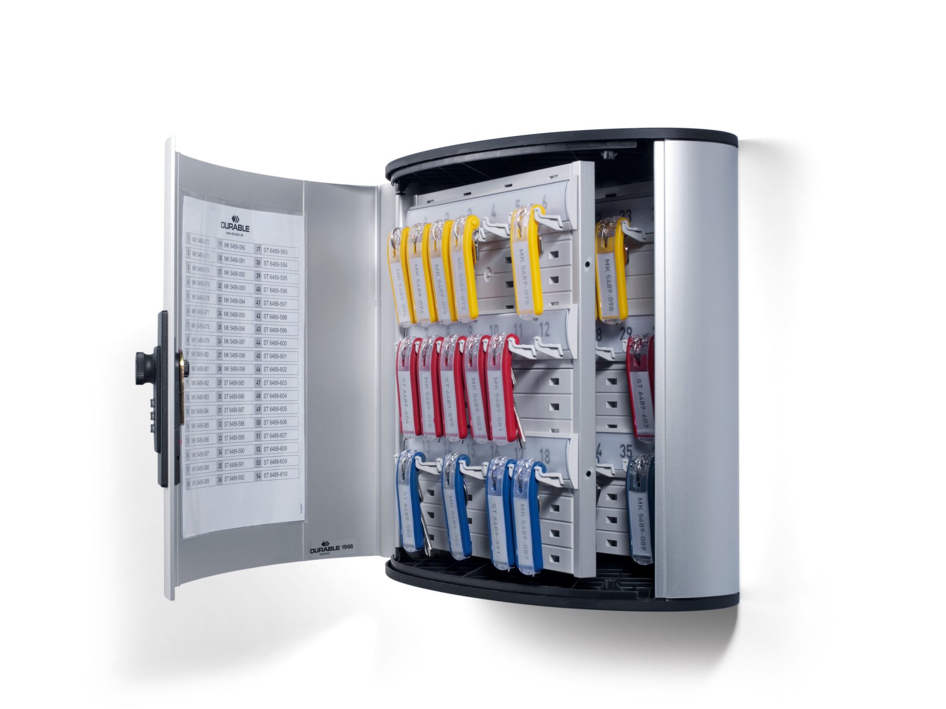 Nøgleskab i aluminium med kodelås til 36 stk. nøgler. Passer til et miljø hvor der er mange der har behov for adgang til det låste skab. Mulighed for at vælge op til 1000 kode kombinationer, som nemt kan ændres uden speciel værktøj. Med overskuelig indholdsfortegnelse, som gør det nemt at finde den rigtige nøgle. Nøglekrogen kan placeres i flere forskellige højder for at tilpasses efter behov. Praktisk nøgleskilt der hænger fast på sin plads, på den specialdesignet nøglekrog. Enkelt at fastgøre og flytte. Nøgleskiltets etiket kan nemt markeres hvilket gør det hele overskueligt og nemt at holde styr på sine nøgler. Inklusiv et sæt med 6 stk. nøgleskilte (Durable art nr 1957) i rød, gul, blå og sort samt skruer til montering. Mål 280 x 302 x 118 mm. (HxBXD).