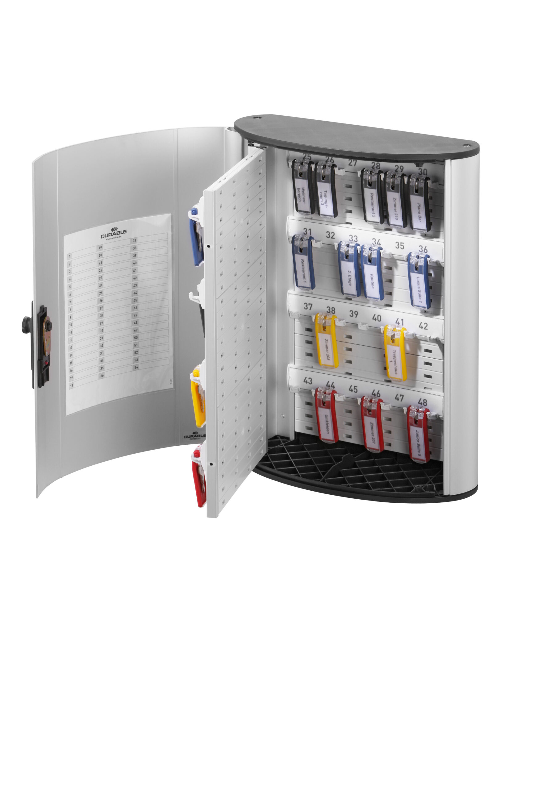 Nøgleskab i aluminium med kodelås til 48 stk. nøgle. Passer til et miljø hvor der er mange der har behov for adgang til det låste skab. Mulighed for at vælge op til 1000 kode kombinationer, som nemt kan ændres uden speciel værktøj. Med overskuelig indholdsfortegnelse, som gør det nemt at finde den rigtige nøgle. Nøglekrogen kan placeres i flere forskellige højder for at tilpasses efter behov. Praktisk nøgleskilt der hænger fast på sin plads, på den specialdesignet nøglekrog. Enkelt at fastgøre og flytte. Nøgleskiltets etiket kan nemt markeres hvilket gør det hele overskueligt og nemt at holde styr på sine nøgler. Inklusiv et sæt med 6 stk nøgleskilte (varenr. 1957) i rød, gul, blå og sort samt skruer til montering. Mål 400 x 302 x 118 mm. (HxBxD).
