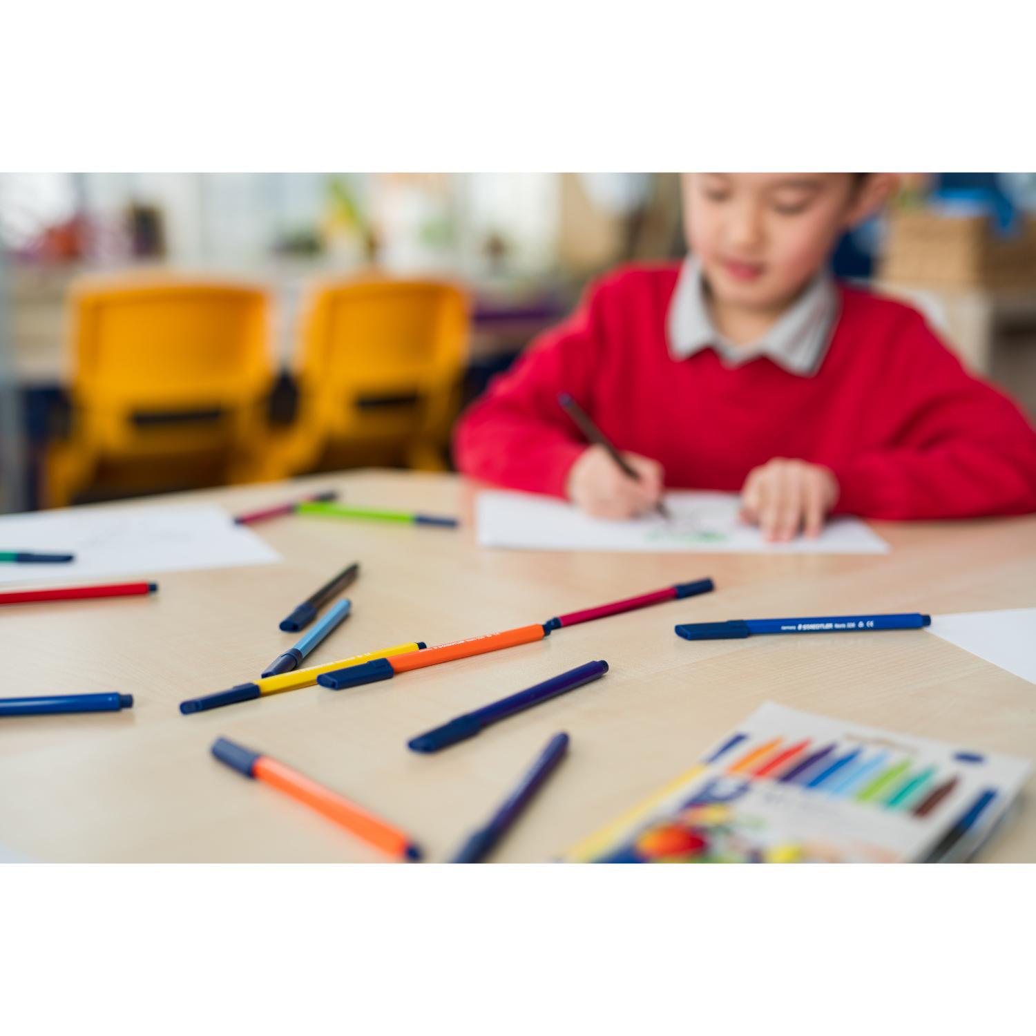 Noris® 326 tusser i høj kvalitet. •Perfekt til hjemmet, skolen og i børnehaven. •Stabil, trykfast spids. •Kan ligge uden hætte i dagevis uden udtørring . •Vandbaseret. •Ventileret hætte. •Vaskes nemt ud af de fleste tekstiler. •Pennehylster i PP fremstillet af 97% genanvendt plast sikrer lang levetid. •Stregbredde ca. 1.0 mm.
