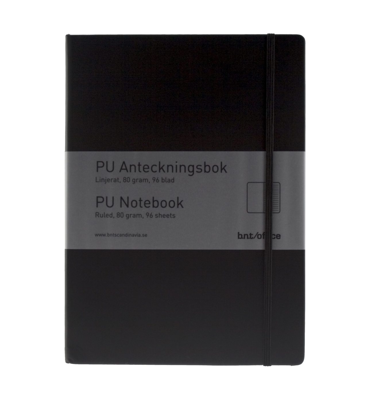 Sort notesbog i A4 der indeholder 96 linjerede ark af 80 gram papir. Omslaget er lavet af PU–materiale, som minder meget om kunstlæder.