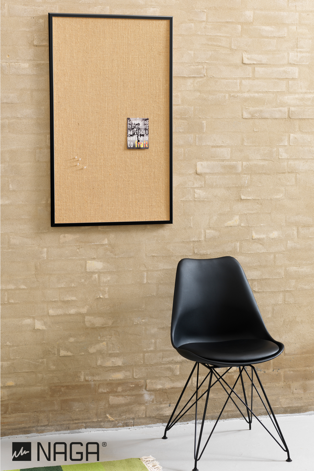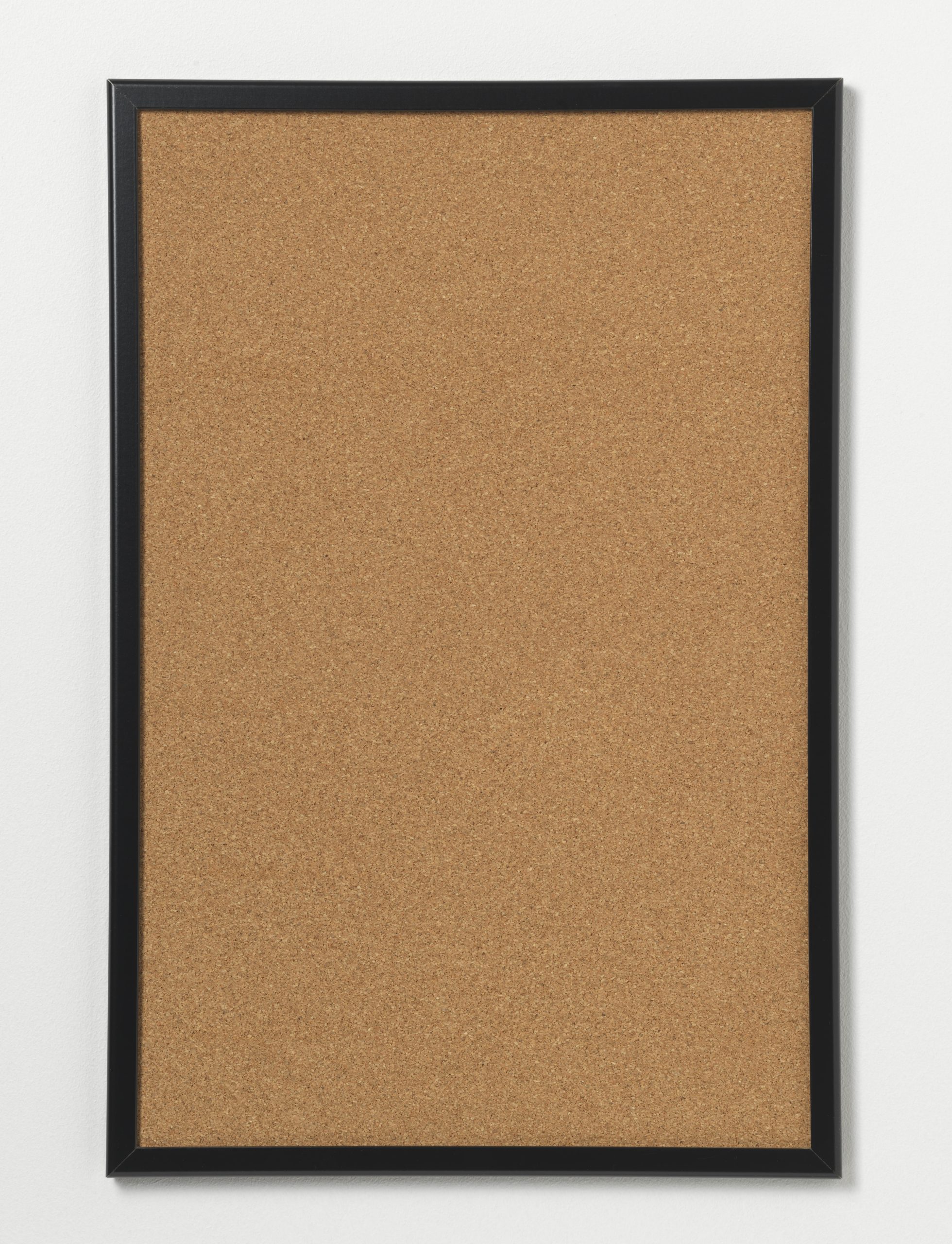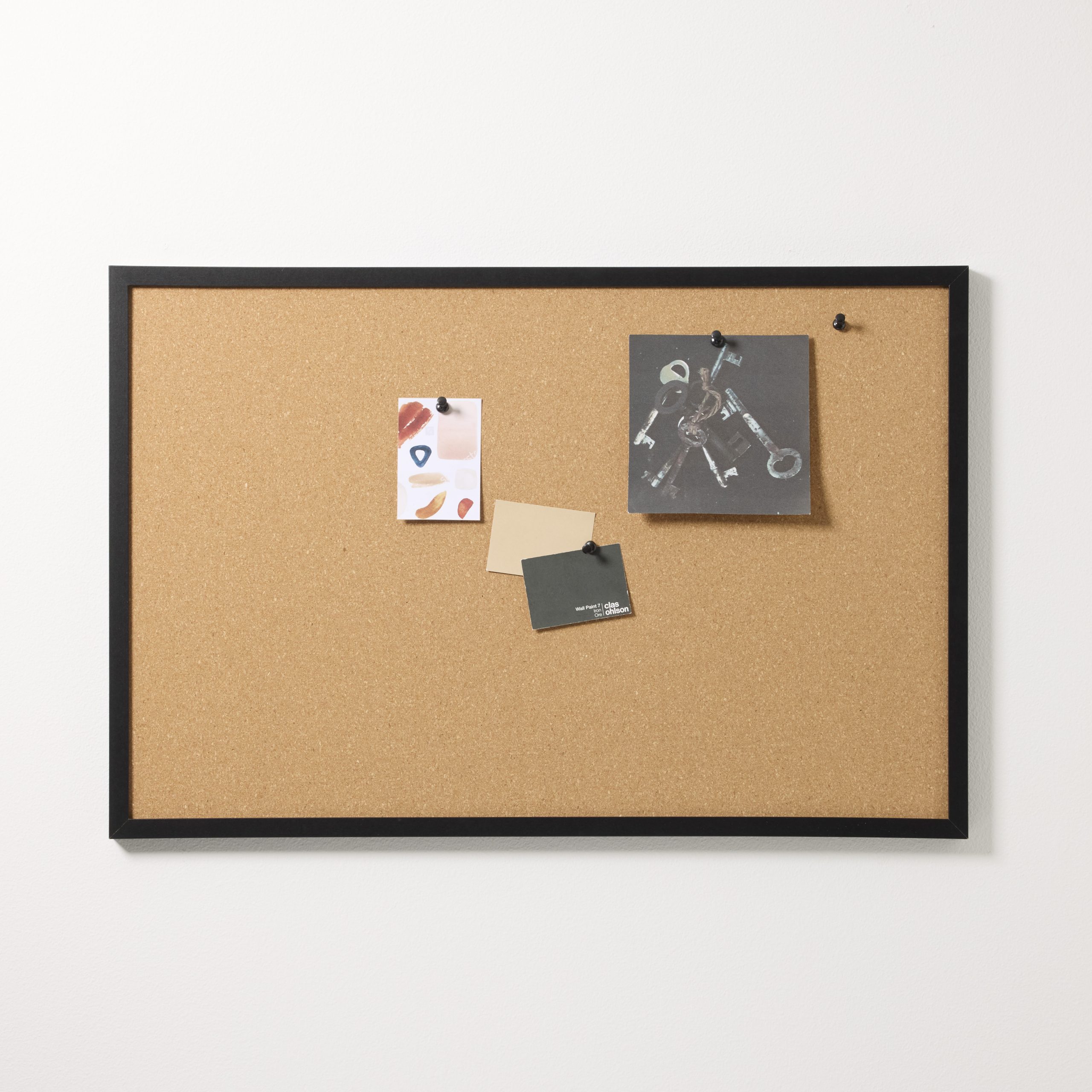 Kork opslagstavle med sort rammeStilfuld opslagstavle i kork som passer ind i de fleste hjem. Det lyse kork indrammes af en sort ramme, hvilket giver en fin kontrast. Med push-pins og tegnestifter kan du nemt hænge ting op, hvilket gør kork tavlen til den perfekte opslagstavle. Kan med fordel bruges i indretningen af både kontoret, stuen, entreen m.m.Opslagstavlen måler 60 x 40 cm og 4 sorte pins medfølger.Ophæng: Med en hammer slår du monteringsbeslaget ind i rammen på opslagstavlen. Du kan dermed selv bestemme, om opslagstavlen skal hænge lodret eller vandret. Monteringsbeslag og vejledning medfølger. Skruer medfølger ikke.