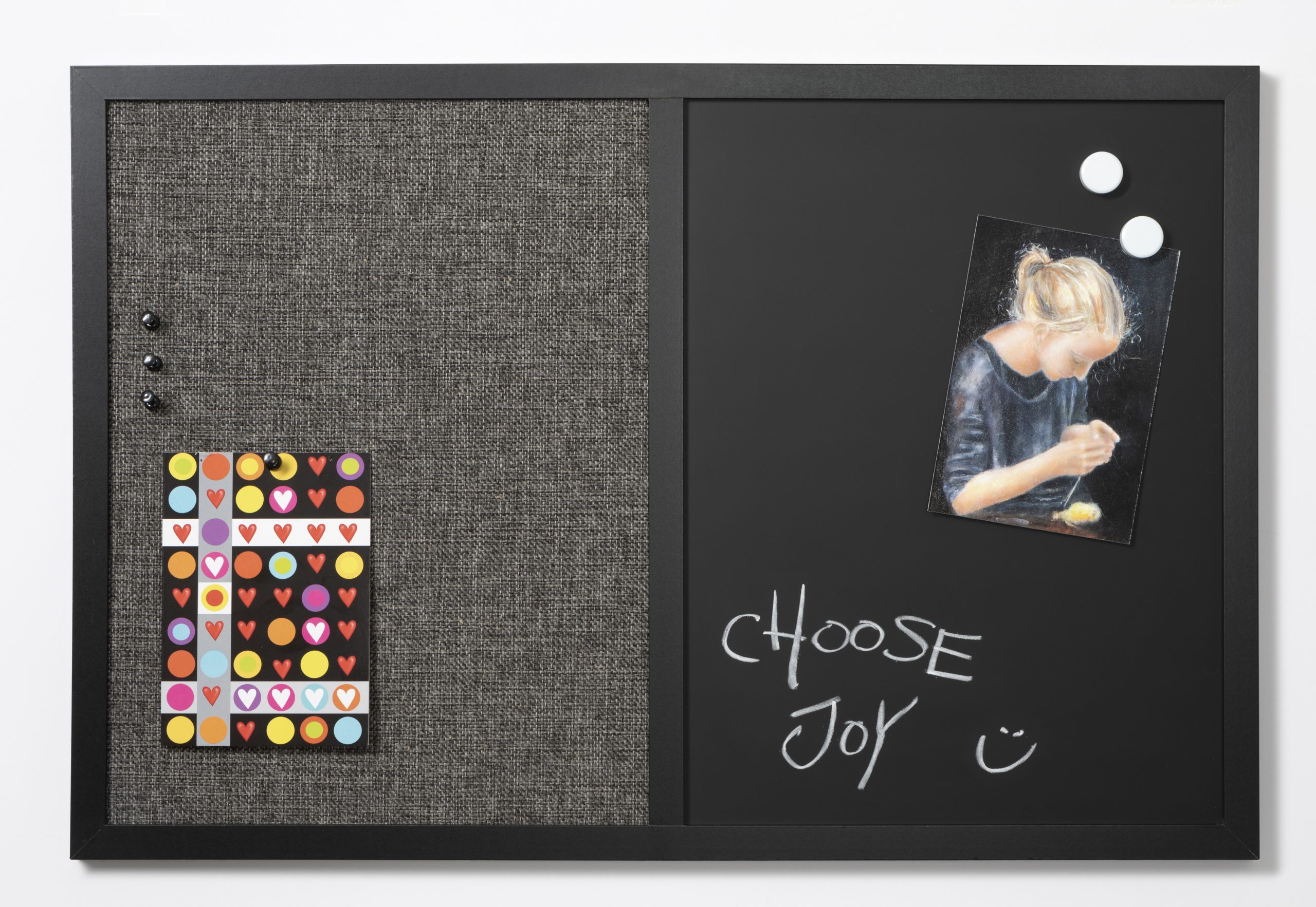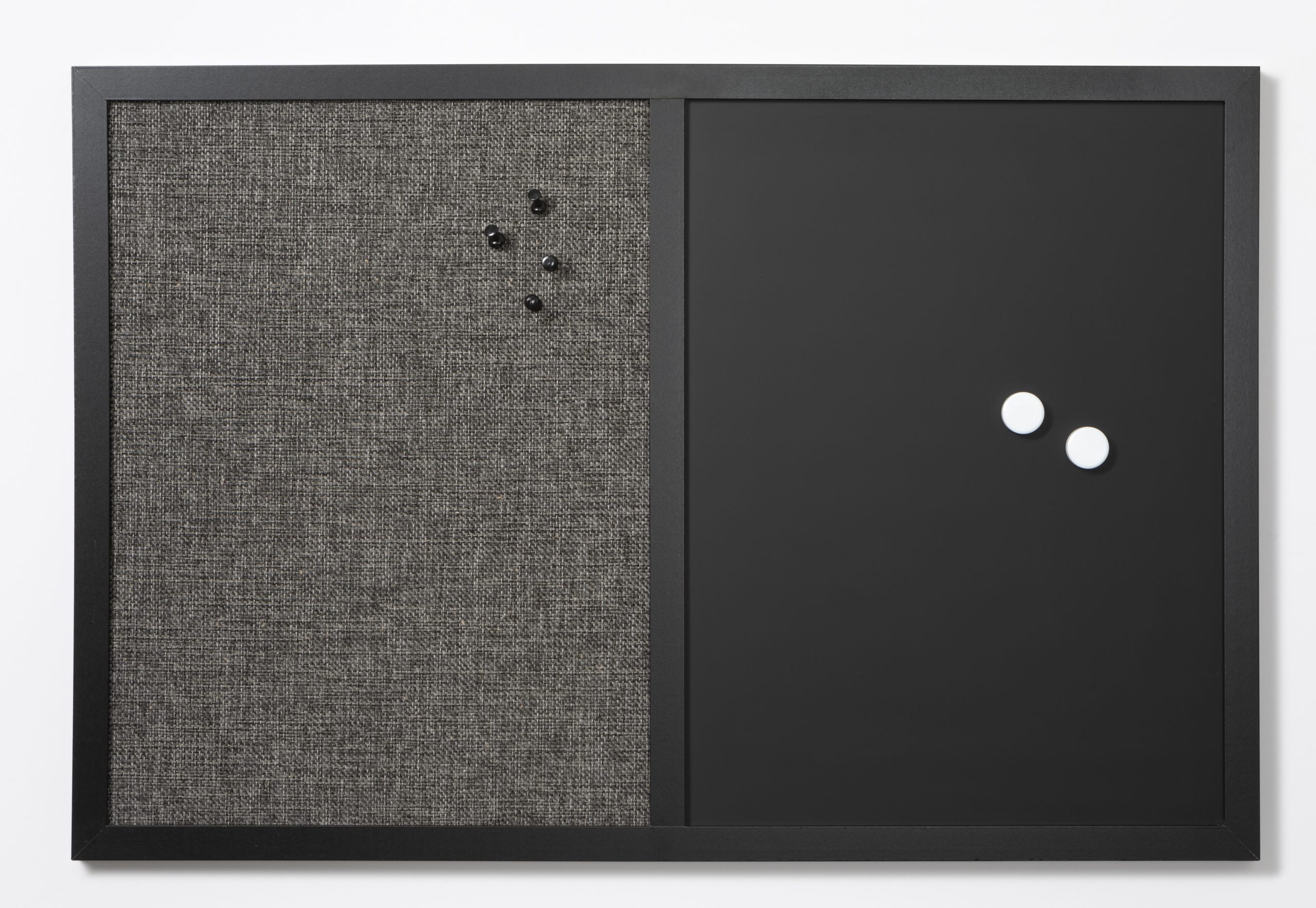 Kombitavle med sort rammeSort hessian opslagstavle, til ophæng med nåle.Magnetisk kridtavle, skriv med almindeligt tavlekridt og ophæng med magneter.Inkl. 4 stk. kridt, 4 sorte pins og 2 hvide magneter.Monteringsbeslag medfølger.