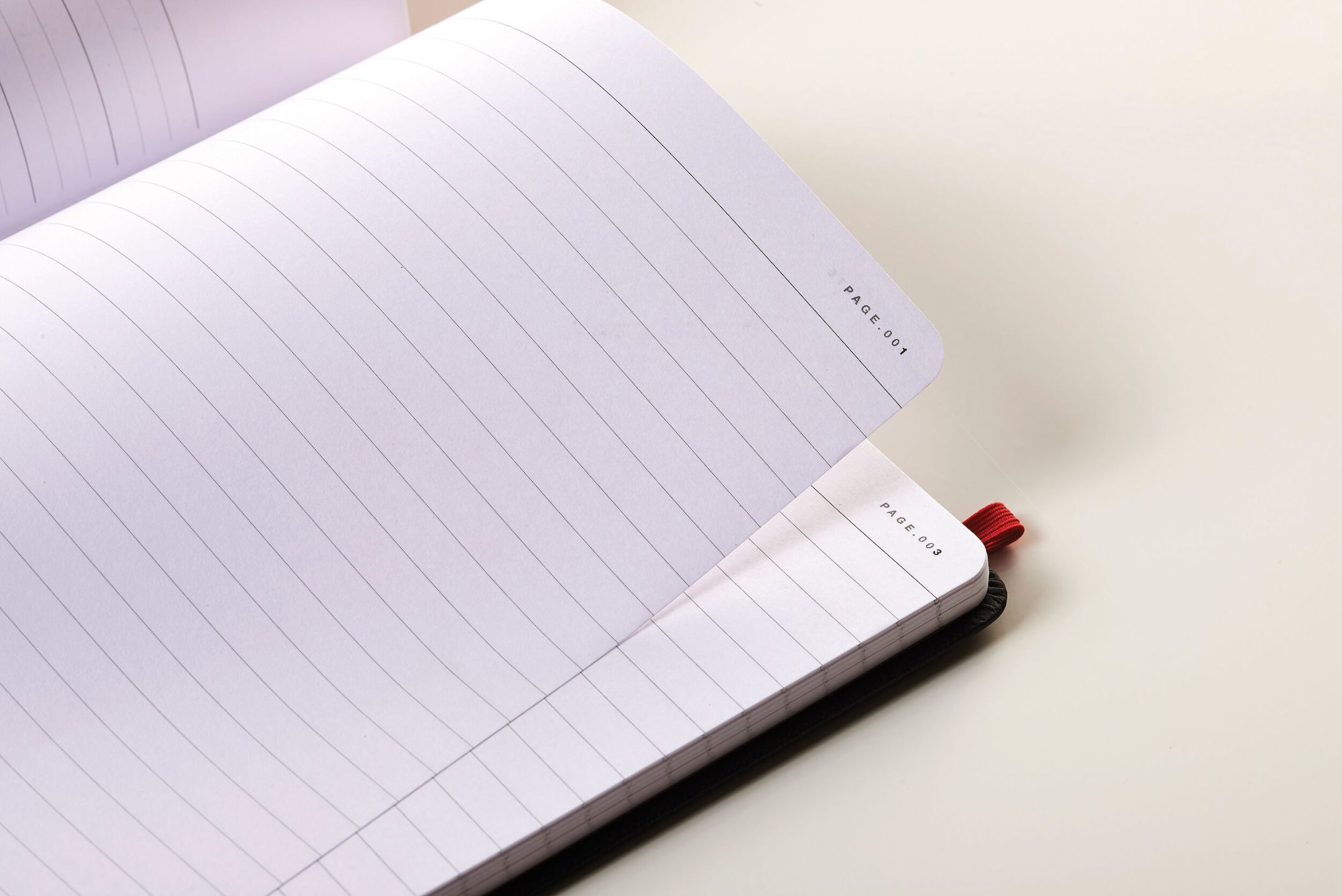 A5 Business Journal, Linjeret og nummeret, 144 sider. Kvalitetspapir: Skriv på begge sider af arket med glat, hvidt 90 gsm Optik Paper. Nummereret 7 mm linjeret med sidehoved (og mulighed for dato) og fodnote. Hård ryg: Syet indbinding sikrer holdbarheden, og elastiklukning giver større sikkerhed. Hårdt omslag af høj kvalitet: Elegante hårde omslag med soft touch-finish og et luksuriøst look, der beskytter dine noter. Papir fra bæredygtig og miljøvenlig PEFC-kilde. Indvendig lomme bagi: Til opbevaring af løse dokumenter. Bogmærke-bånd: For hurtig henvisning til noter.