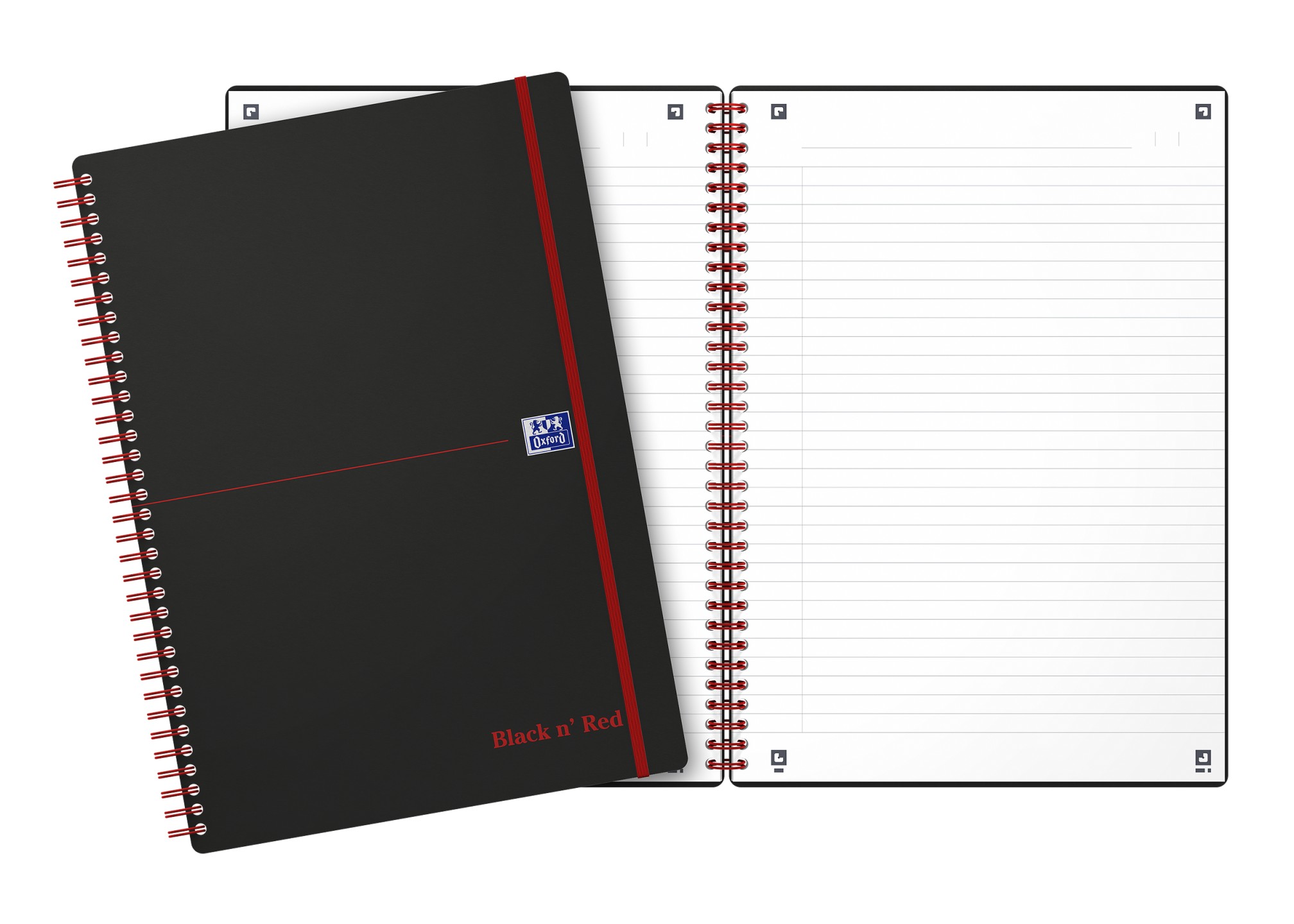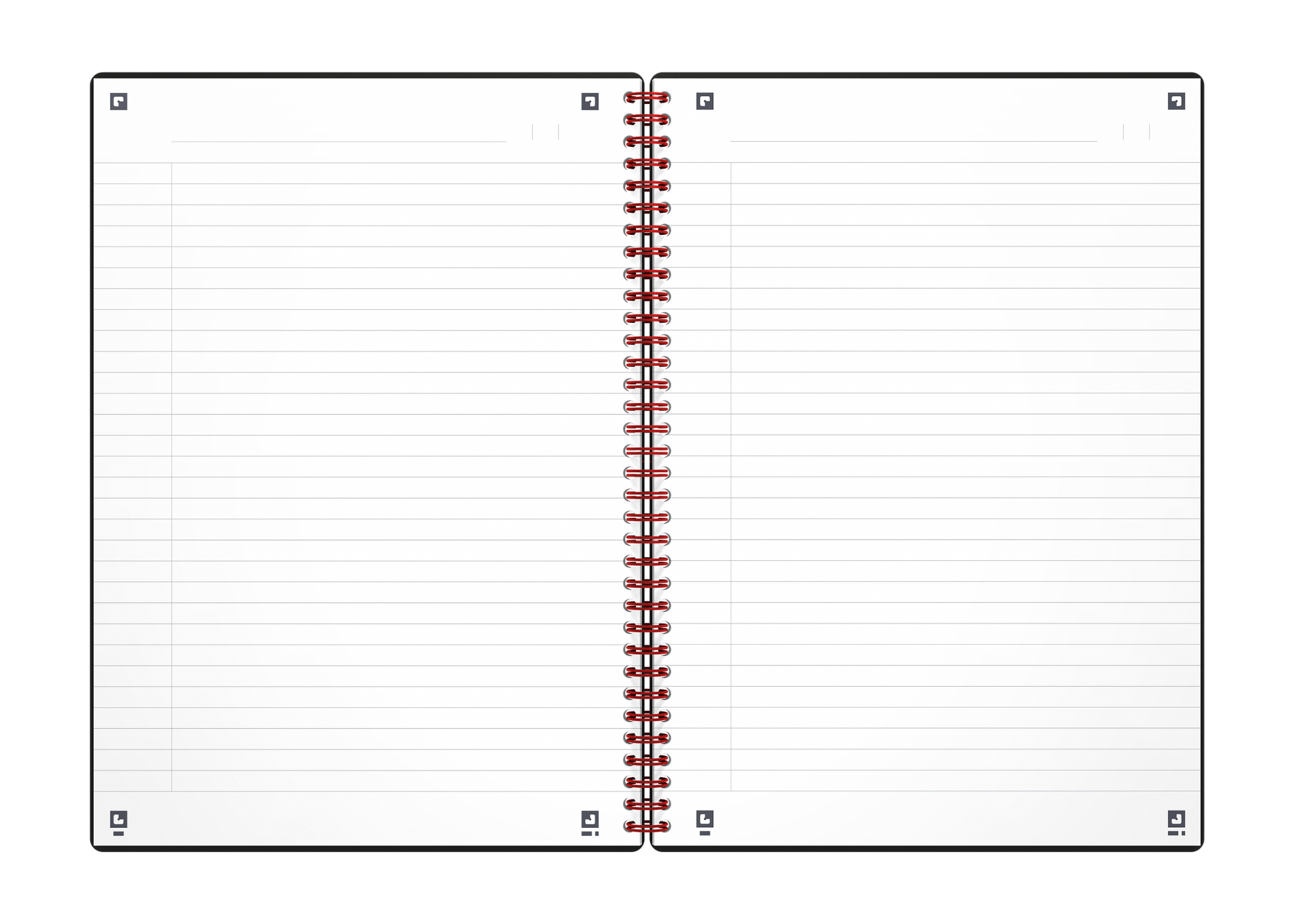 Notebook i A4, linjeret med margin, 140 sider. Takket være det ekstra hvide og glatte OPTIK PAPER® i 90 g/m2 kan du skrive på begge sider af arket, uden at blækket bløder igennem. Linjeret med margin. Rød plastovertrukket dobbeltspiral i ryggen gør det muligt at lægge notesbogen fladt mod underlaget eller at åbne den helt op, hvilket sikrer maksimal komfort og fleksibilitet. Fleksibelt, slidstærkt omslag i sort polypropylen med tekstureret finish. Arkene er kompatible med den gratis Scribzee®-smartphoneapp, så du nemt kan scanne, gemme og organisere dine noter. OXFORDs eksklusive Optik Paper® har både fået EUs miljømærke (lav miljøbelastning fra de papirfabrikker, der producerer papiret) og PEFC-certificering (bæredygtig skovforvaltning). Med elastiklukning, der beskytter notesbogens indhold. Informationsside på forsiden af notesbogen, hvor du kan skrive vigtige referenceinformationer.