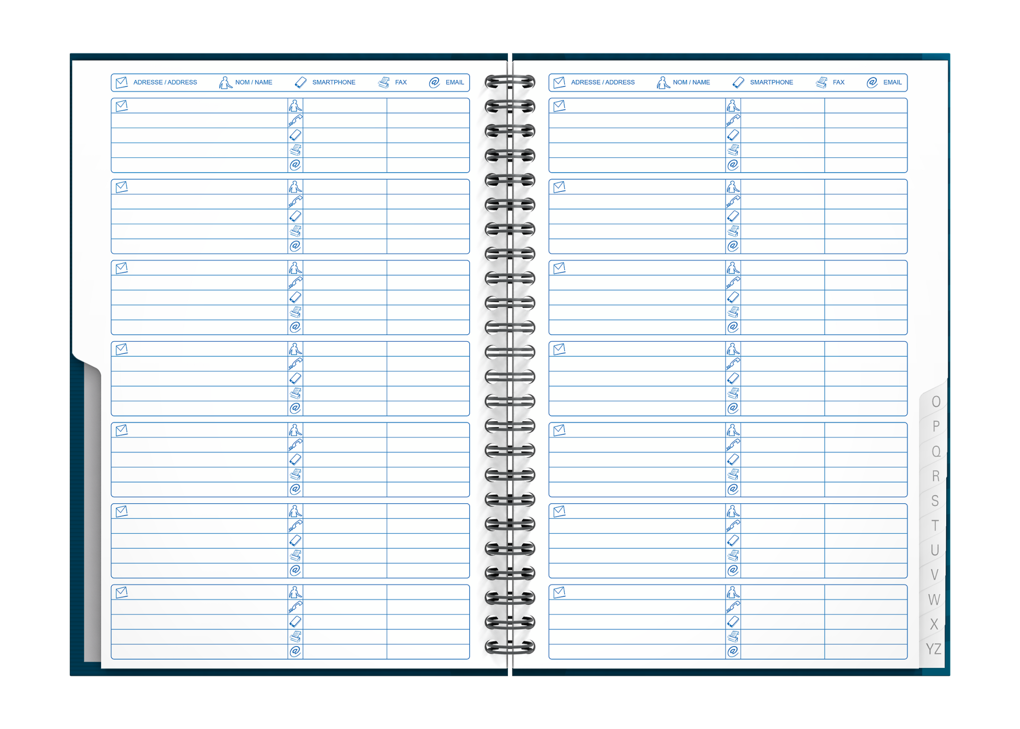 A til Z-adressebog i A5, særlig linjering med plads til navn og adresse, e-mail og telefonnummer, 144 sider. Takket være det ekstra hvide og glatte OPTIK PAPER® i 90 g/m2 kan du skrive på begge sider af arket, uden at blækket bløder igennem. Særligt sidedesign til notering af kontaktoplysninger, såsom navn og adresse, men også forskellige telefonnumre og e-mailadresse. Sort plastbelagt dobbeltspiral i ryggen gør det muligt at lægge notesbogen fladt mod underlaget eller åbne den helt op, hvilket sikrer maksimal komfort og fleksibilitet. Hårdt omslag for og bag, der giver lang levetid. Fås i mange forskellige farver. Arkene er i øjeblikket ikke kompatible med den gratis SCRIBZEE®-smartphoneapp. OXFORDs eksklusive Optik Paper® har både fået EU’s miljømærke (lav miljøbelastning fra de papirfabrikker, der producerer papiret) og PEFC™-certificering (bæredygtig skovforvaltning). Plastbelagte A til Z-sider med faneblade, der gør det nemt at opbevare og finde oplysninger.