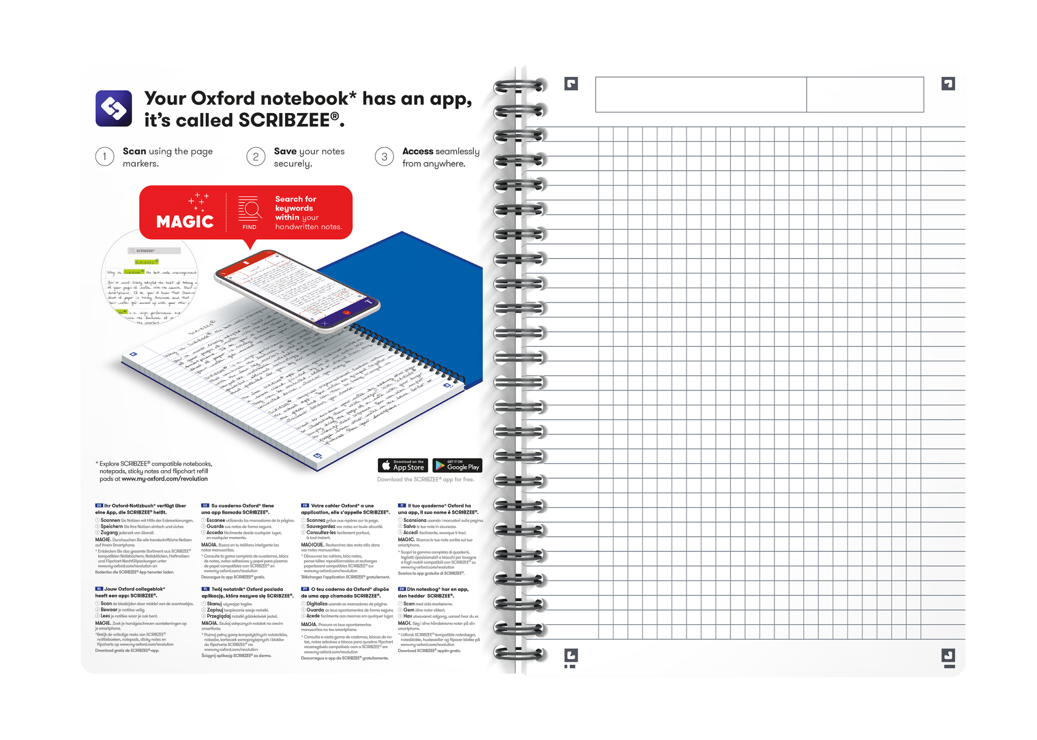 Notebook i A5, kvadreret 5×5 mm med margin, 180 sider. Takket være det ekstra hvide og glatte OPTIK PAPER® i 90 g/m2 kan du skrive på begge sider af arket, uden at blækket bløder igennem. Siderne har et specialdesignet skema, der hjælper dig med at organisere dine noter. Siderne, der er udstyret med sidehoved, hvor du kan skrive mødets emne eller en overskrift foruden datoen, har desuden dobbelt margen, så du kan nummerere, fremhæve symboler eller lave punktopstillinger. Sort plastbelagt dobbeltspiral i ryggen gør det muligt at lægge notesbogen fladt mod underlaget eller åbne den helt op, hvilket sikrer maksimal komfort og fleksibilitet. Blødt papomslag med beskyttende plastbelagt blank finish. Fås i forskellige moderne og klassiske farver med en slidstærk blank finish. Arkene er kompatible med den gratis Scribzee®-smartphoneapp, så du nemt kan scanne, gemme og organisere dine noter. Har fået tildelt EUs miljømærke, der garanterer reduceret miljøbelastning for papirprodukter gennem hele deres livscyklus fra råvare til bortskaffelse. Praktisk flytbar bogmærkelineal med markering af centimeter og millimeter, der gør det nemt at understrege, måle længder eller hurtigt finde det rigtige sted. Den trykte indsatsside indeholder et område, hvor du kan gøre din notesbog individuel ved at skrive dit navn og dine kontaktoplysninger.