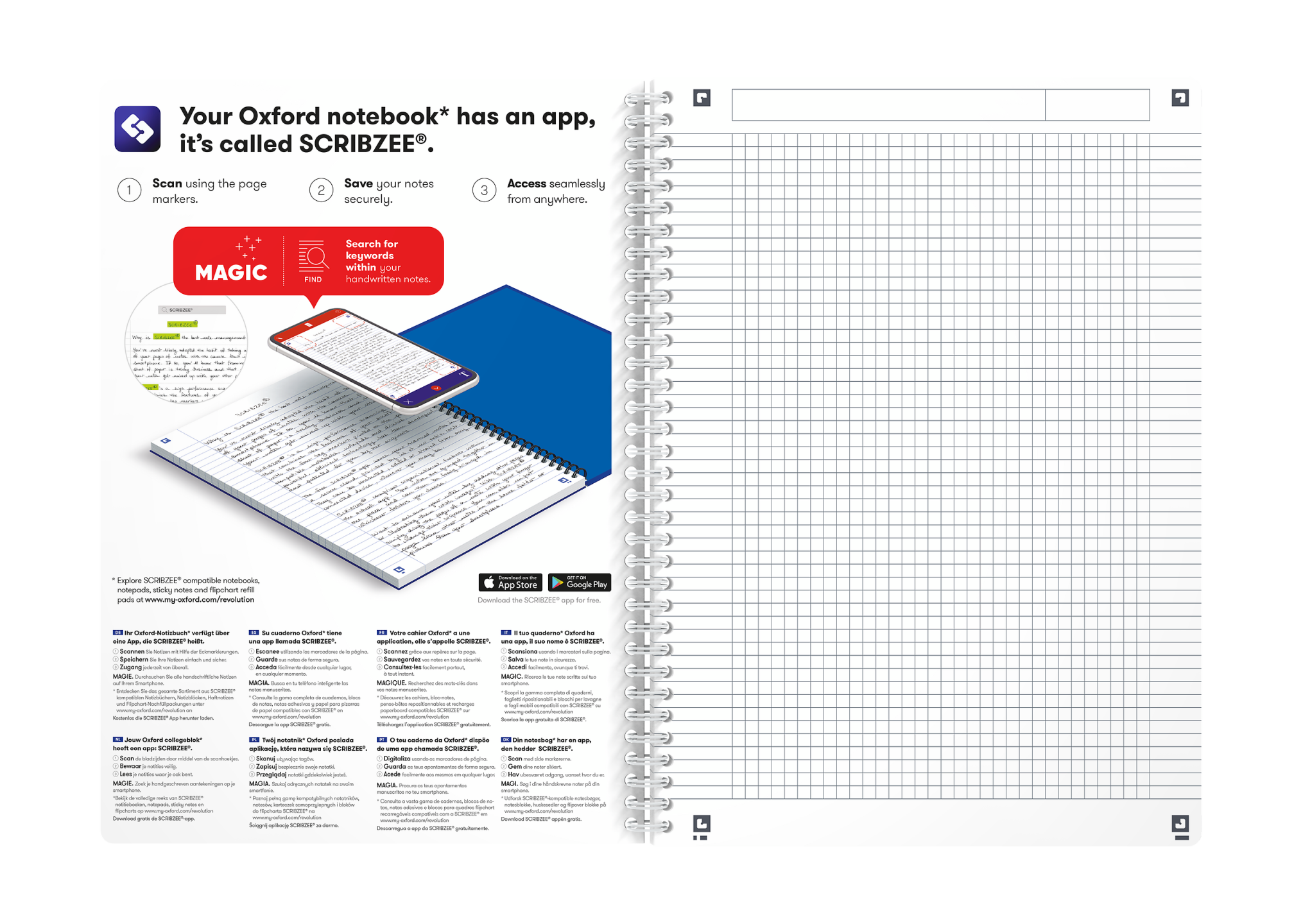 Notebook i A4, kvadreret 5×5 mm, 180 sider. Takket være det ekstra hvide og glatte OPTIK PAPER® i 90 g/m2 kan du skrive på begge sider af arket, uden at blækket bløder igennem. De specialdesignede sider hjælper dig med at organisere dine noter. Alle sider er udstyret med smart linjering og sidehoved, hvor du kan skrive mødets emne eller en overskrift foruden datoen, samt dobbelt margen, så du kan nummerere eller fremhæve noter eller lave punktopstillinger. Den hvide plastovertrukne dobbeltspiral i ryggen gør det muligt at lægge notesbogen helt fladt mod underlaget og at åbne siderne 360 grader. Fleksible, vandtætte og gennemsigtige omslag af polypropylen. Arkene er kompatible med den gratis Scribzee®-smartphoneapp, så du nemt kan scanne, gemme og organisere dine noter. Har fået tildelt EU’s miljømærke, der garanterer reduceret miljøbelastning for papirprodukter gennem hele deres livscyklus fra råvare til bortskaffelse. Aftagelig og flytbar bogmærkelineal, der gør det nemt at tegne linjer, måle længder og finde det rigtige sted. Hvidt forsatspapir forrest og bagerst i notesbogen styrker omslaget og sikrer, at dine noter forbliver fortrolige.