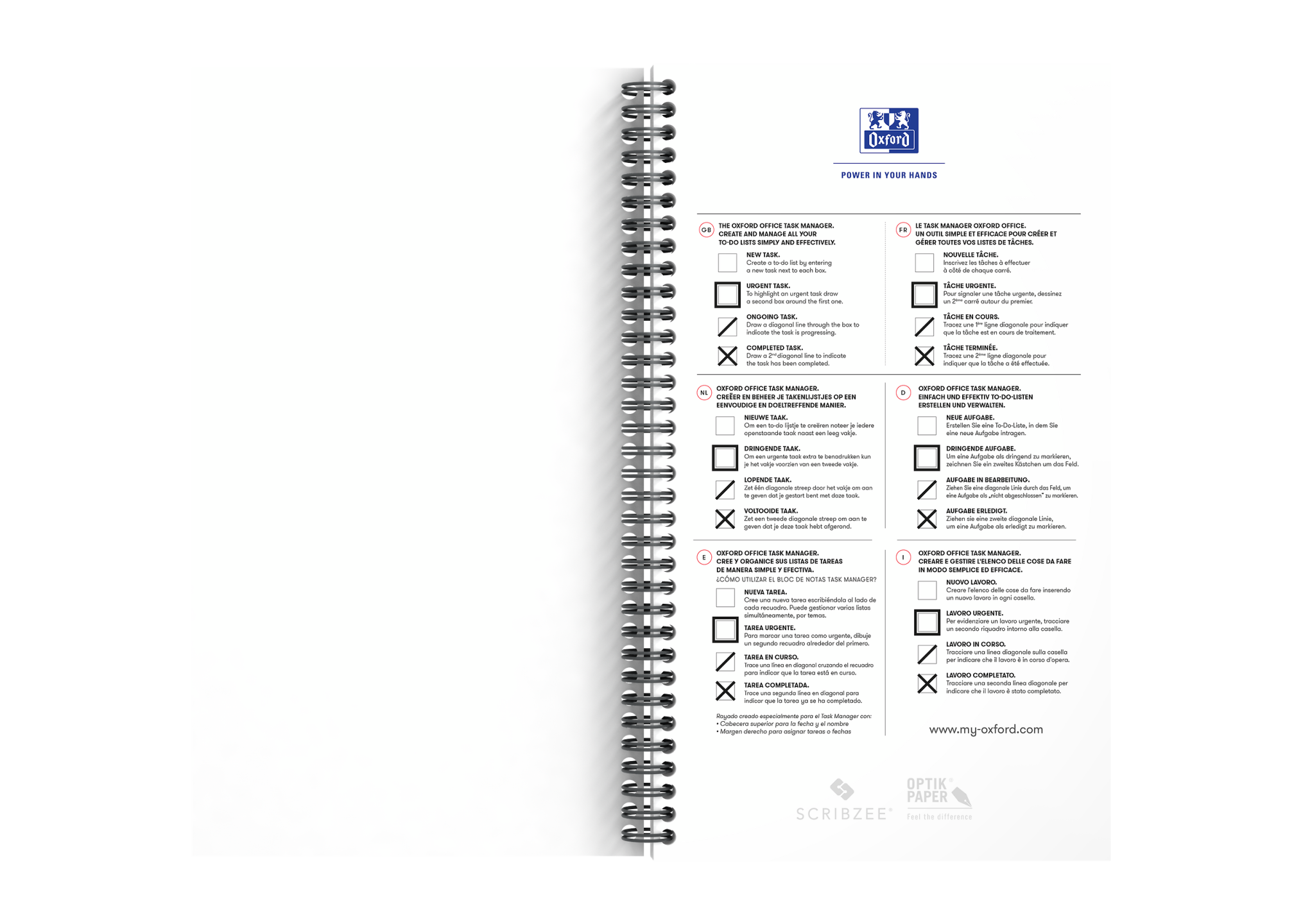 14,4×24,6cm Notesbog, Gitter til håndtering af huskelister, 230 mikroperforerede sider. Ekstrahvidt og glat OPTIK PAPER gør det muligt at skrive på begge sider af arket, uden at blækket kan ses igennem papiret. Linjeret med henblik på at tage noter og administrere opgaver. Sort, plastovertrukket dobbeltspiral i ryggen sikrer holdbarheden og gør det samtidig muligt at lægge notesblokken fladt mod underlaget eller at åbne den 360°, hvilket sikrer maksimal komfort og fleksibilitet. Blødt papomslag med beskyttende blank finish i marineblå. Kompatibel med den gratis SCRIBZEE-smartphone-applikation, der kan scanne, gemme og søge samt organisere dine noter. Produktet er certificeret med EU Ecolabel – EU Ecolabel certificerer papirprodukter med reduceret miljøpåvirkning gennem hele deres livscyklus, fra råmateriale til endt levetid. Alle sider er mikroperforerede og kan nemt rives ud. Task Manager leveres med en enkel organisationsmetode trykt på indersiden af coveret, der gør det muligt at administrere opgaver mere effektivt. Velegnet til at administrere opgavelister derhjemme eller på kontoret.
