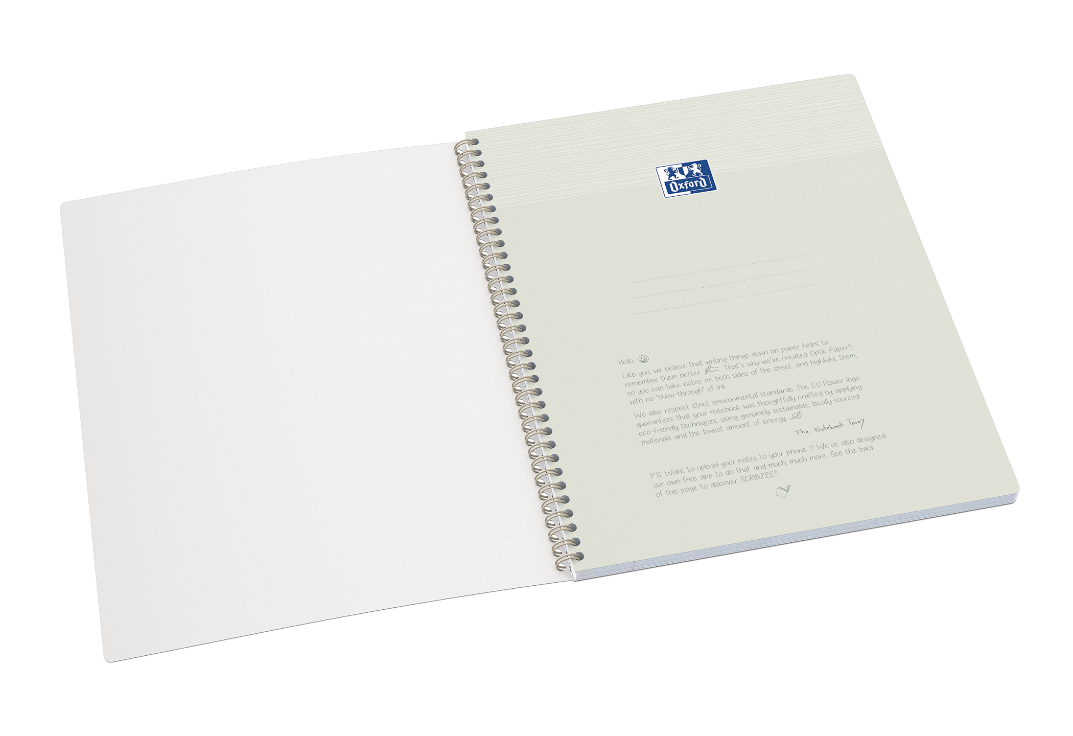 A4+ notesbog, linjeret med margen, forperforerede, aftagelige ark, 140 sider. Tykt og glat 90 g OPTIK PAPER®, så du kan skrive på begge sider af arket eller overstrege noter, uden at blækket kan skinne igennem. Med den matchende sandfarvede dobbelttrådsbinding kan notesbogen ligge fladt eller foldes tilbage om sig selv for maksimal komfort og fleksibilitet. Blødt kartonomslag med beskyttende mat finish. Fås i 5 forskellige farver, inspireret af naturen. Kompatibel med den gratis Scribzee® smartphone-applikation, der kan bruges til at scanne, gemme, organisere og søge i dine håndskrevne noter. OXFORD Origins-serien har fået EU’s miljømærke. Den trykte indstiksside indeholder et skriveområde, hvor du kan gøre din notesbog personlig med dit navn og dine kontaktoplysninger.