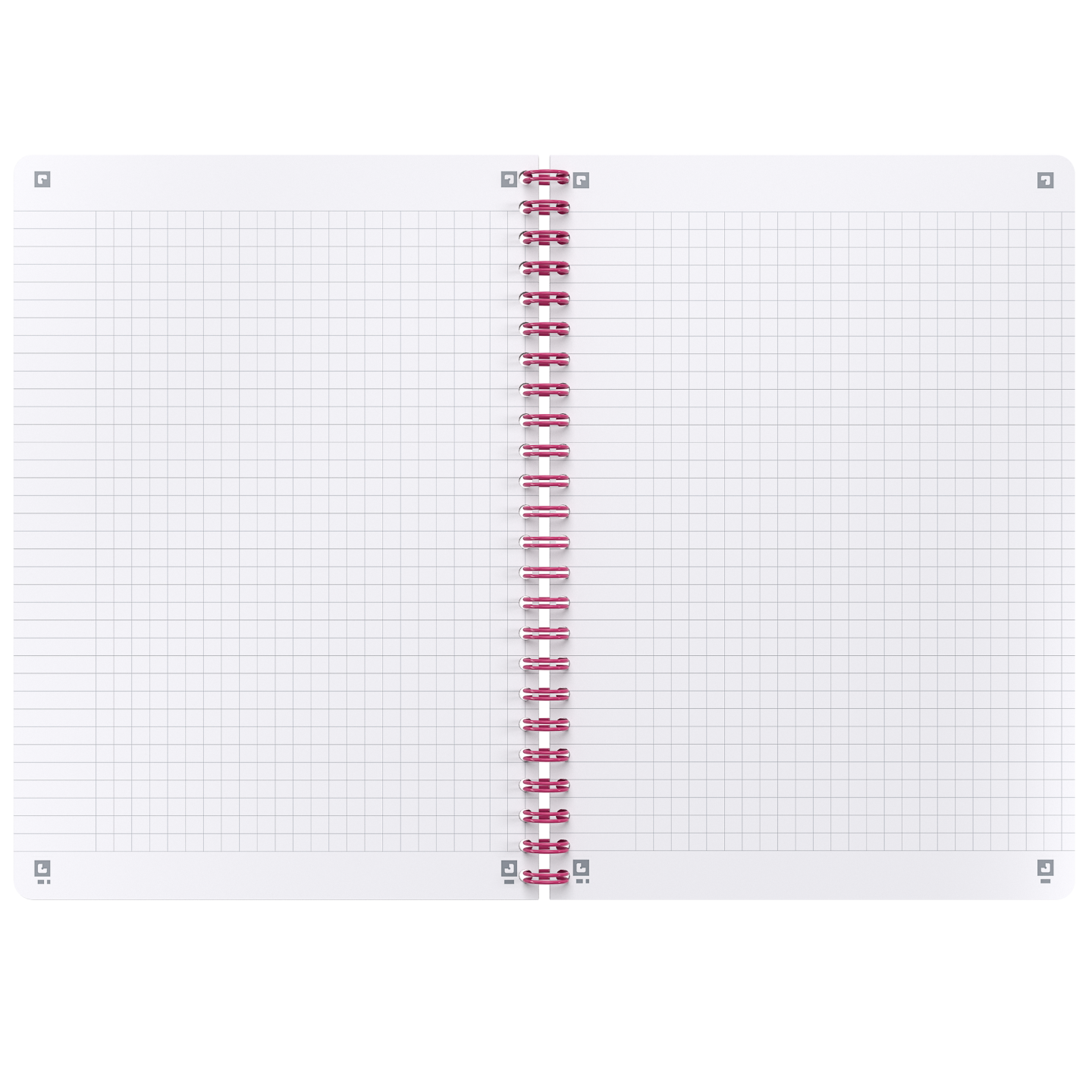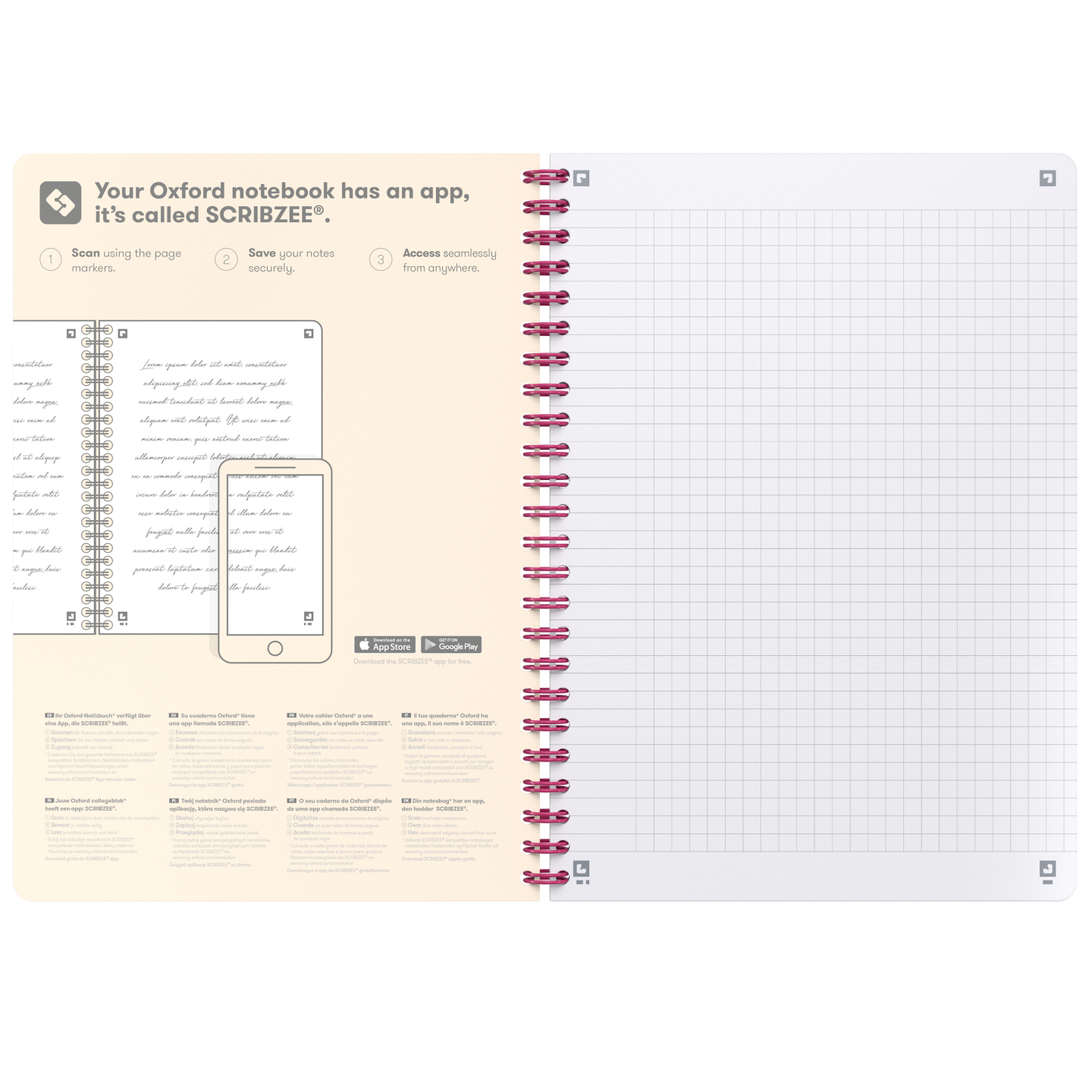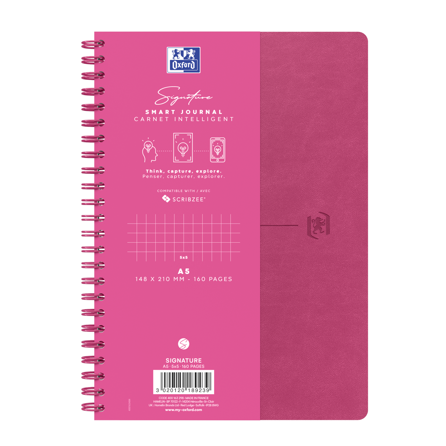 A5-notesbog 5 mm kvadreret + margin. Et generøst sideantal på 80 ark (160 sider), hvor du kan indsamle et stort og rigeligt indhold af ideer uden at ændre på notesbogen. Ekstra hvidt og glat OPTIK PAPER®, hvor du kan skrive på begge sider af arket, uden at der trænger blæk igennem. Helsides 5 mm-kvadrering. Ikke-aftagelige ark. Afdæmpet, tydelig linjering med fine linjer, der ikke forstyrrer din skrivning eller genlæsning. Omslagsark, hvor man kan skrive ejerens navn, hvis bogen skulle blive væk. Matchende fuchsia-pink indbinding med dobbeltspiral gør, at bogen kan ligge fladt eller blive foldet 360°, så håndens bevægelse under skrivning eller idéflowet ikke forstyrres. Kompatibel med den gratis SCRIBZEE smartphone-app, hvor du kan scanne, gemme, organisere og søge i dine noter. Finish af høj kvalitet (afrundede hjørner og matchende indbinding med dobbeltspiral), der giver en attraktiv, funktionel og holdbar notesbog.