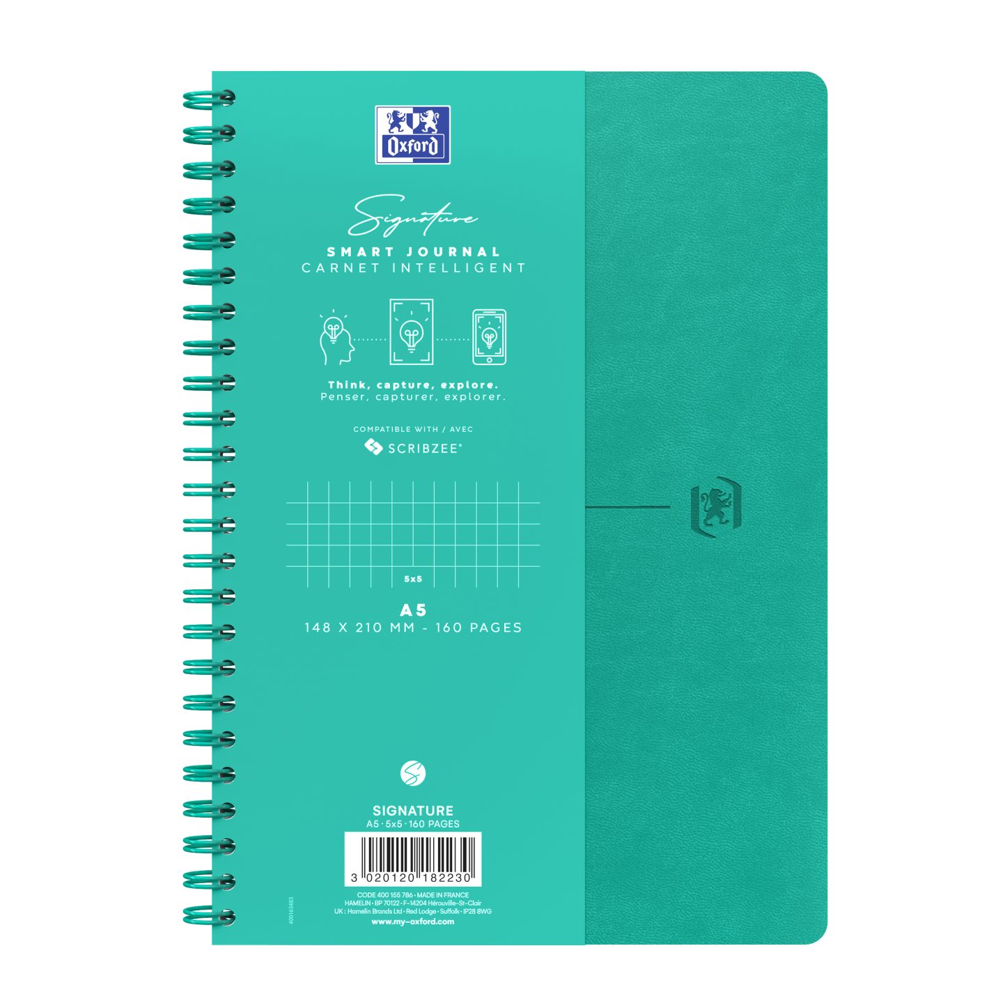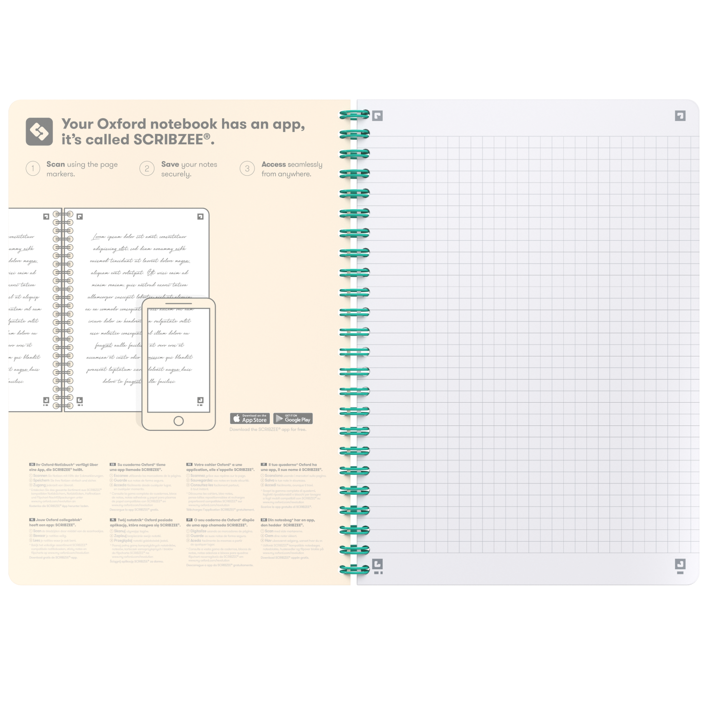 A5-notesbog 5 mm kvadreret + margin. Et generøst sideantal på 80 ark (160 sider), hvor du kan indsamle et stort og rigeligt indhold af ideer uden at ændre på notesbogen. Ekstra hvidt og glat OPTIK PAPER®, hvor du kan skrive på begge sider af arket, uden at der trænger blæk igennem. Helsides 5 mm-kvadrering. Ikke-aftagelige ark. Afdæmpet, tydelig linjering med fine linjer, der ikke forstyrrer din skrivning eller genlæsning. Omslagsark, hvor man kan skrive ejerens navn, hvis bogen skulle blive væk. Matchende turkis indbinding med dobbeltspiral gør, at bogen kan ligge fladt eller blive foldet 360°, så håndens bevægelse under skrivning eller idéflowet ikke forstyrres. Kompatibel med den gratis SCRIBZEE smartphone-app, hvor du kan scanne, gemme, organisere og søge i dine noter. Finish af høj kvalitet (afrundede hjørner og matchende indbinding med dobbeltspiral), der giver en attraktiv, funktionel og holdbar notesbog.