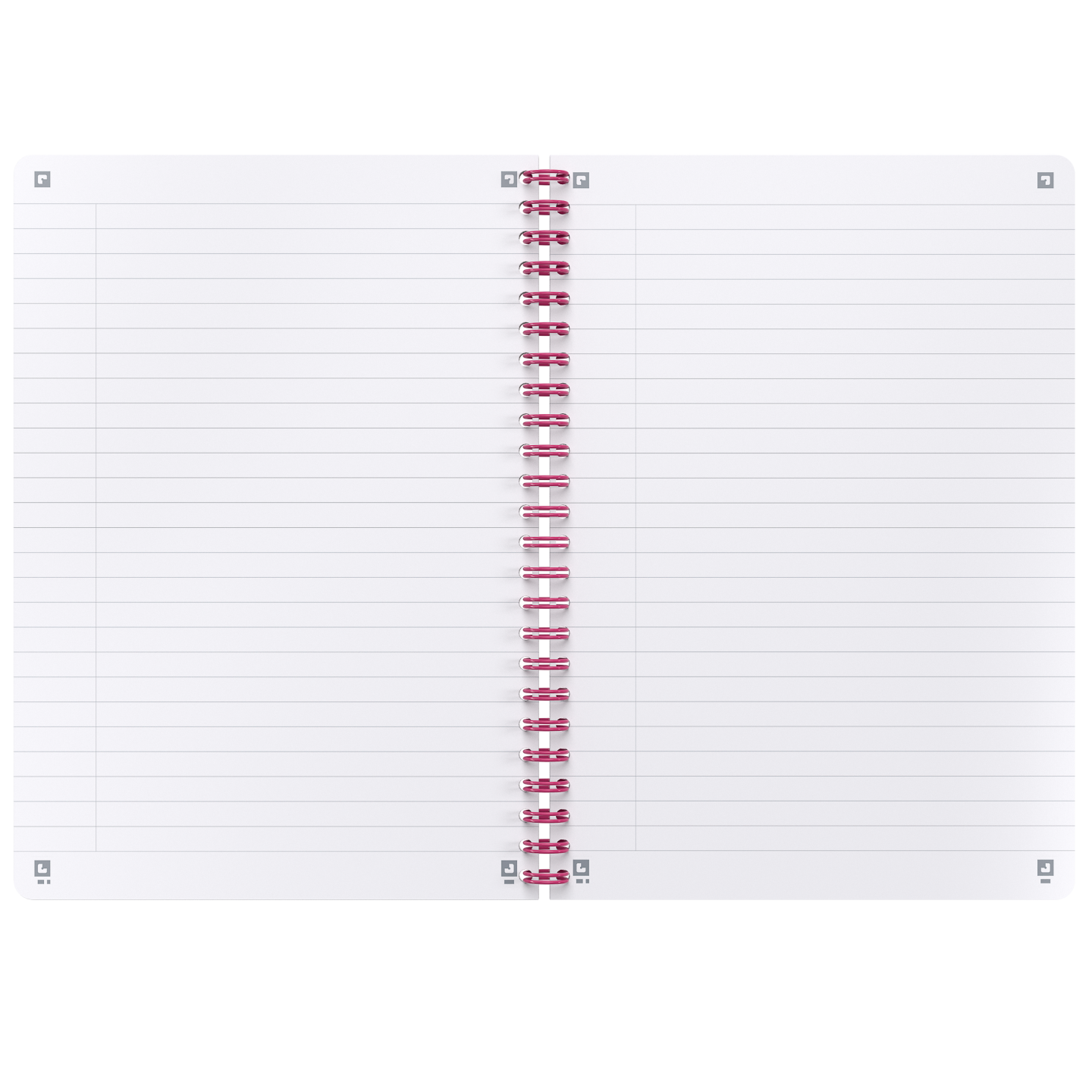 A5 Notesbog Linjeret + Margin. Et generøst sideantal på 80 ark (160 sider), hvor du kan indsamle et stort og rigeligt indhold af ideer uden at ændre på notesbogen. Ekstra hvidt og glat OPTIK PAPER®, hvor du kan skrive på begge sider af arket, uden at der trænger blæk igennem. Helsides linjerede sider. Ikke-aftagelige ark. Afdæmpet, tydelig linjering med fine linjer, der ikke forstyrrer din skrivning eller genlæsning. Omslagsark, hvor man kan skrive ejerens navn, hvis bogen skulle blive væk. Matchende fuchsia-pink indbinding med dobbeltspiral gør, at bogen kan ligge fladt eller blive foldet 360°, så håndens bevægelse under skrivning eller idéflowet ikke forstyrres. Kompatibel med den gratis SCRIBZEE smartphone-app, hvor du kan scanne, gemme, organisere og søge i dine noter. Finish af høj kvalitet (afrundede hjørner og matchende indbinding med dobbeltspiral), der giver en attraktiv, funktionel og holdbar notesbog.