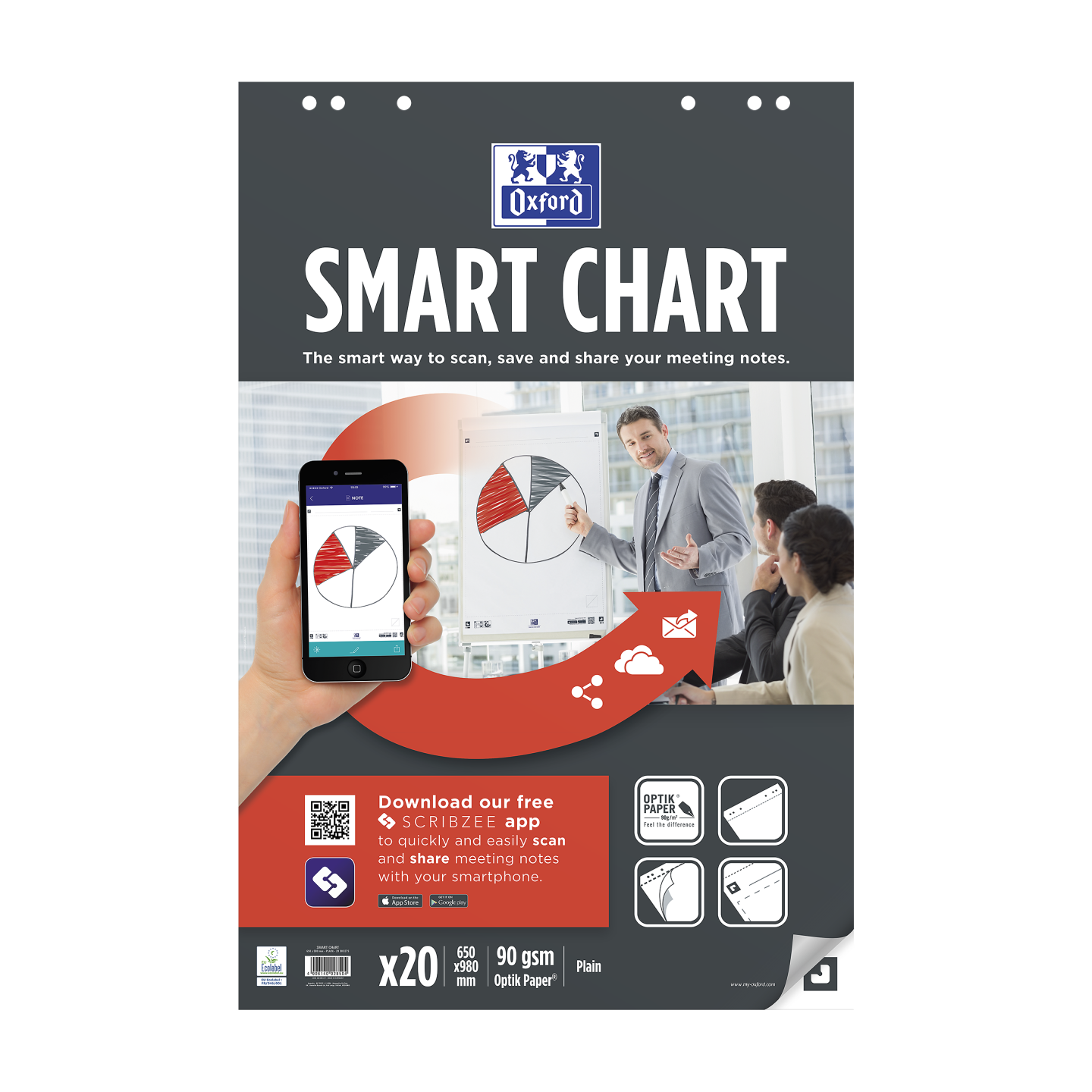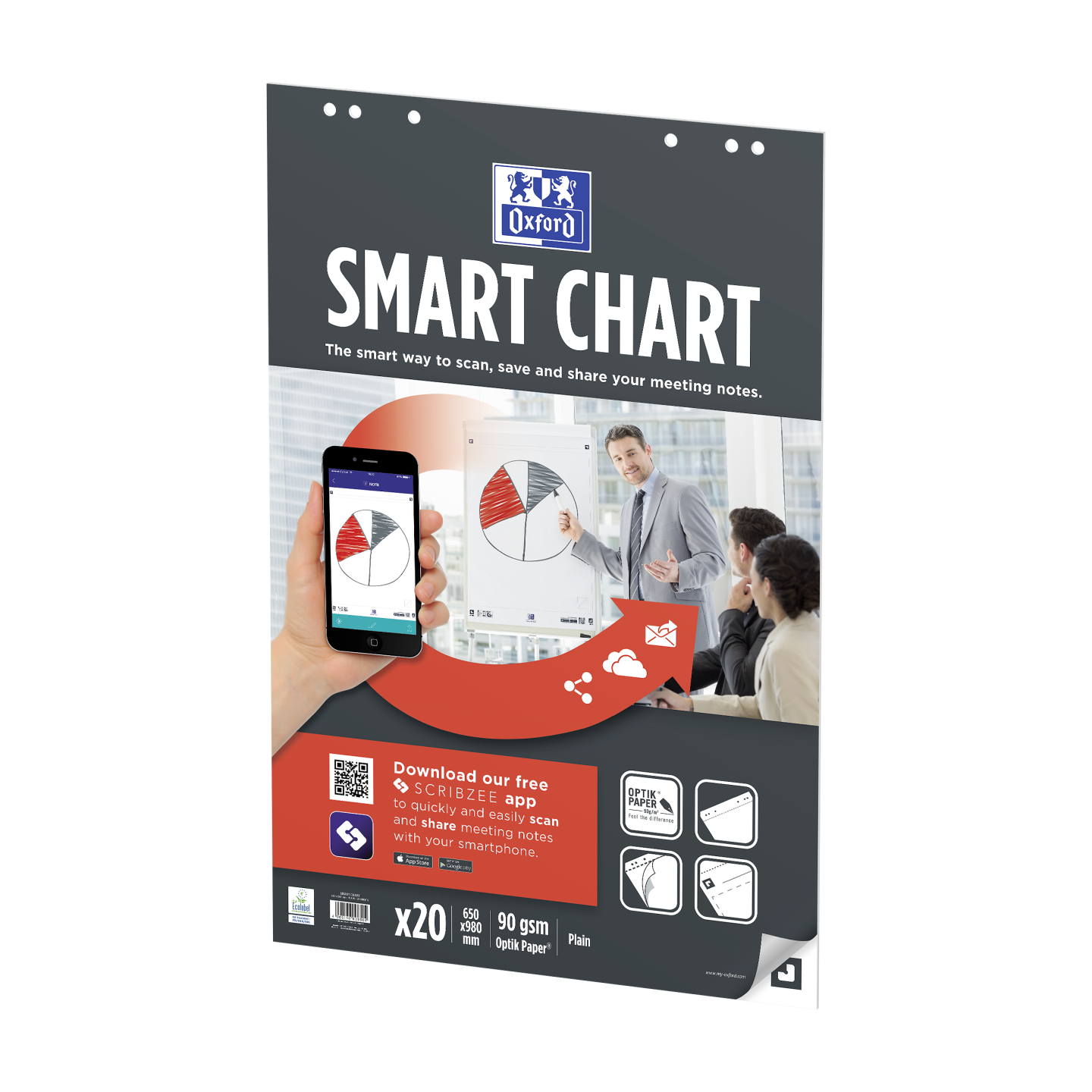 Smart Charts-flipoverblok i 65×98 cm med 20 ulinjerede ark, der er perforeret og udstanset med 6 standardhuller, så de er kompatible med alle typer flipoverstaffelier og -stativer. Ekstra hvidt og glat OPTIK PAPER® i 90 g/m2, som er kompatibelt med alle typer markere uden gennemblødning til næste ark. Praktiske og alsidige ulinjerede ark, som er velegnede til mødenoter og diagrammer. Limet flipoverblok i stort format med papiromslag, som beskytter vigtige noter. Arkene er kompatible med den gratis Scribzee®-smartphoneapp, så du nemt kan scanne, gemme og organisere dine noter. Har fået tildelt EU’s miljømærke, der garanterer reduceret miljøbelastning for papirprodukter gennem hele deres livscyklus fra råvare til bortskaffelse.