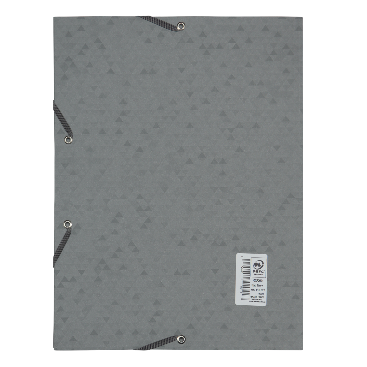 Lavet af eksklusivt Multi’Strat-karton på 390 g/m². elastikker fastholdes af nittede snørehuller. 3 store flapper. trykt skrivefelt på forsiden. Kapacitet: op til 200 ark. 2 flade grå elastikker. Produceret i Frankrig. PEFC-certificeret.