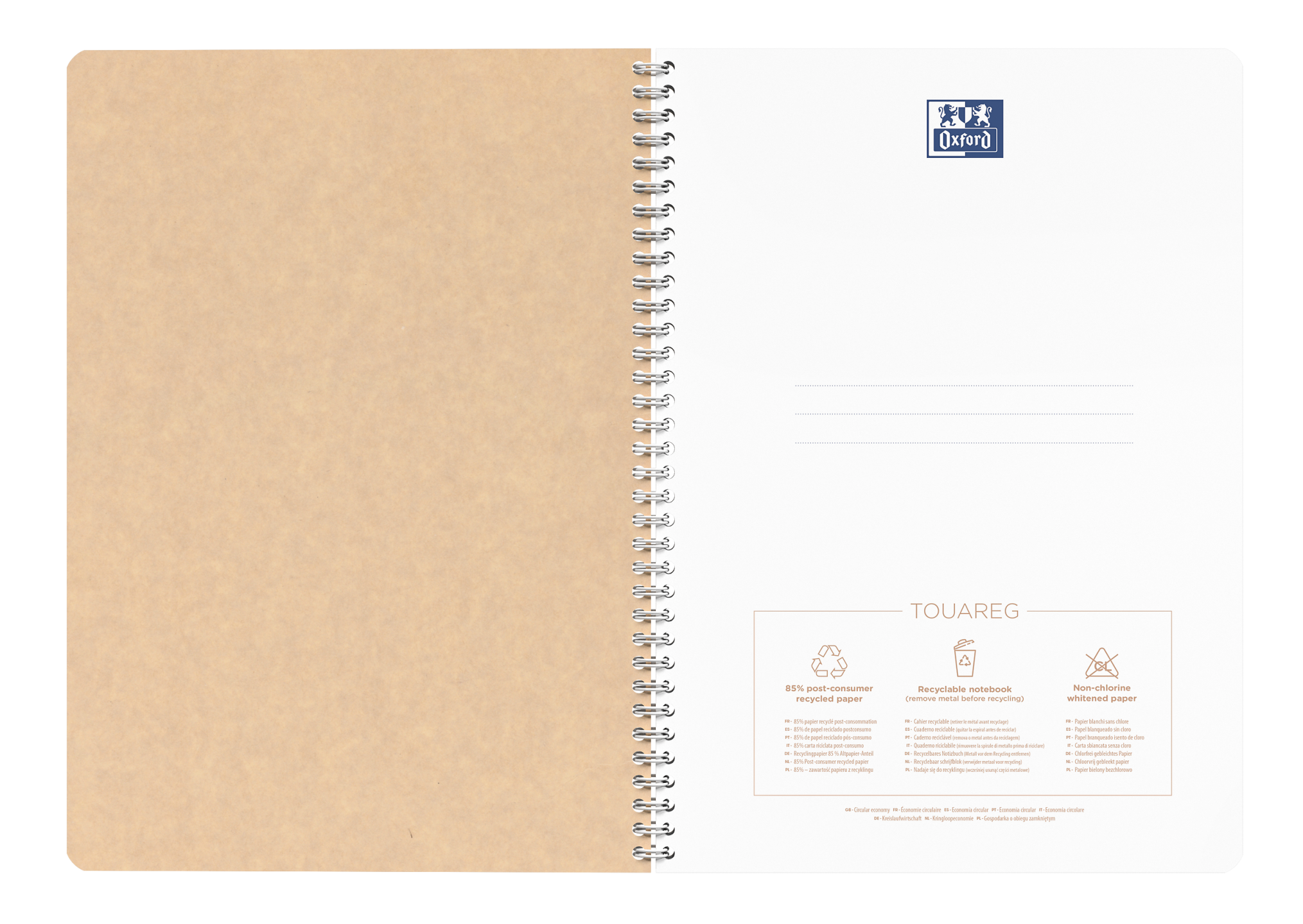 Notesbog i A4, kvadreret, 180 sider. Hvidt og glat 100% genanvendt papir på 90 g, så der kan skrives på begge sider uden gennemskin af blæk. Siderne har både overskriftsfelt og margen, så du kan tage noter på organiseret vis. Indbindingen med hvid dobbelt spiral gør, at notesbogen kan ligge helt fladt eller ombukkes, så der opnås maksimal komfort og fleksibilitet. Det robuste kartonomslag har en naturlig finish. Fås i 5 assorterede naturlige farver. Kompatibel med den gratis SCRIBZEE®-app til smartphones, så du kan scanne, gemme og organisere dine noter. Den trykte indstiksside har et skriveområde, så du kan tilpasse din notesbog individuelt.