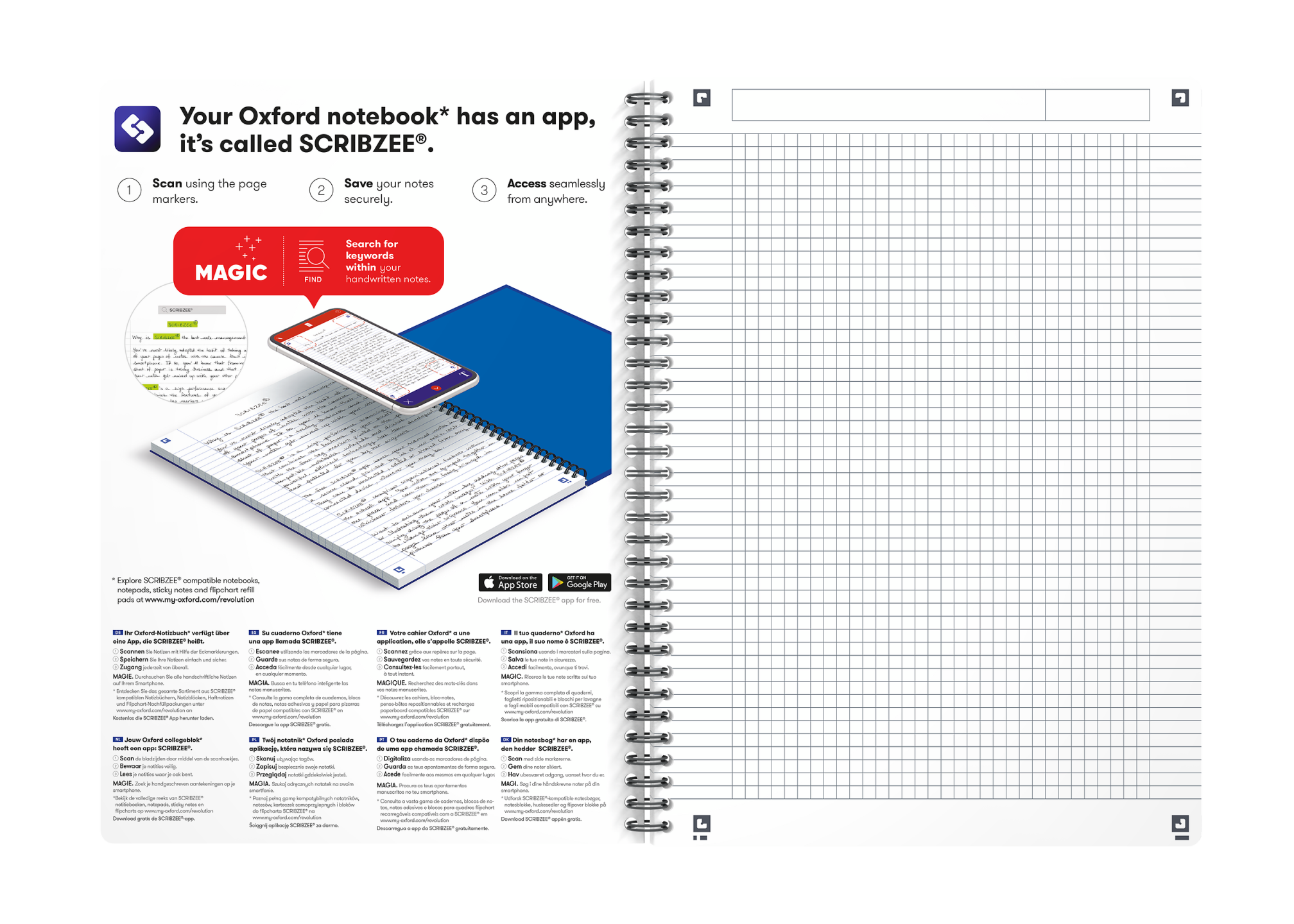 Notebook i A4, kvadreret 5×5 mm med margen, 100 sider. Takket være det ekstra hvide og glatte OPTIK PAPER® i 90 g/m2 kan du skrive på begge sider af arket, uden at blækket bløder igennem. De specialdesignede sider hjælper dig med at organisere dine noter. Alle sider er udstyret med smart linjering og sidehoved, hvor du kan skrive mødets emne eller en overskrift foruden datoen, samt dobbelt margen, så du kan nummerere eller fremhæve noter eller lave punktopstillinger. Sort plastovertrukket dobbeltspiral i ryggen sikrer holdbarheden og gør det samtidig muligt at lægge notesbogen fladt mod underlaget eller at åbne den helt op, hvilket sikrer maksimal komfort og fleksibilitet. Omslaget af polypropylen i dobbelt tykkelse med elegant metallic overflade kan modstå masser af slid og strabadser i lang tid fremover. Arkene er kompatible med den gratis Scribzee®-smartphoneapp, så du nemt kan scanne, gemme og organisere dine noter. OXFORDs eksklusive Optik Paper® har både fået EU’s miljømærke (lav miljøbelastning fra de papirfabrikker, der producerer papiret) og PEFC™-certificering (bæredygtig skovforvaltning). Aftagelig og flytbar bogmærkelineal, der gør det nemt at tegne linjer, måle længder og finde det rigtige sted.