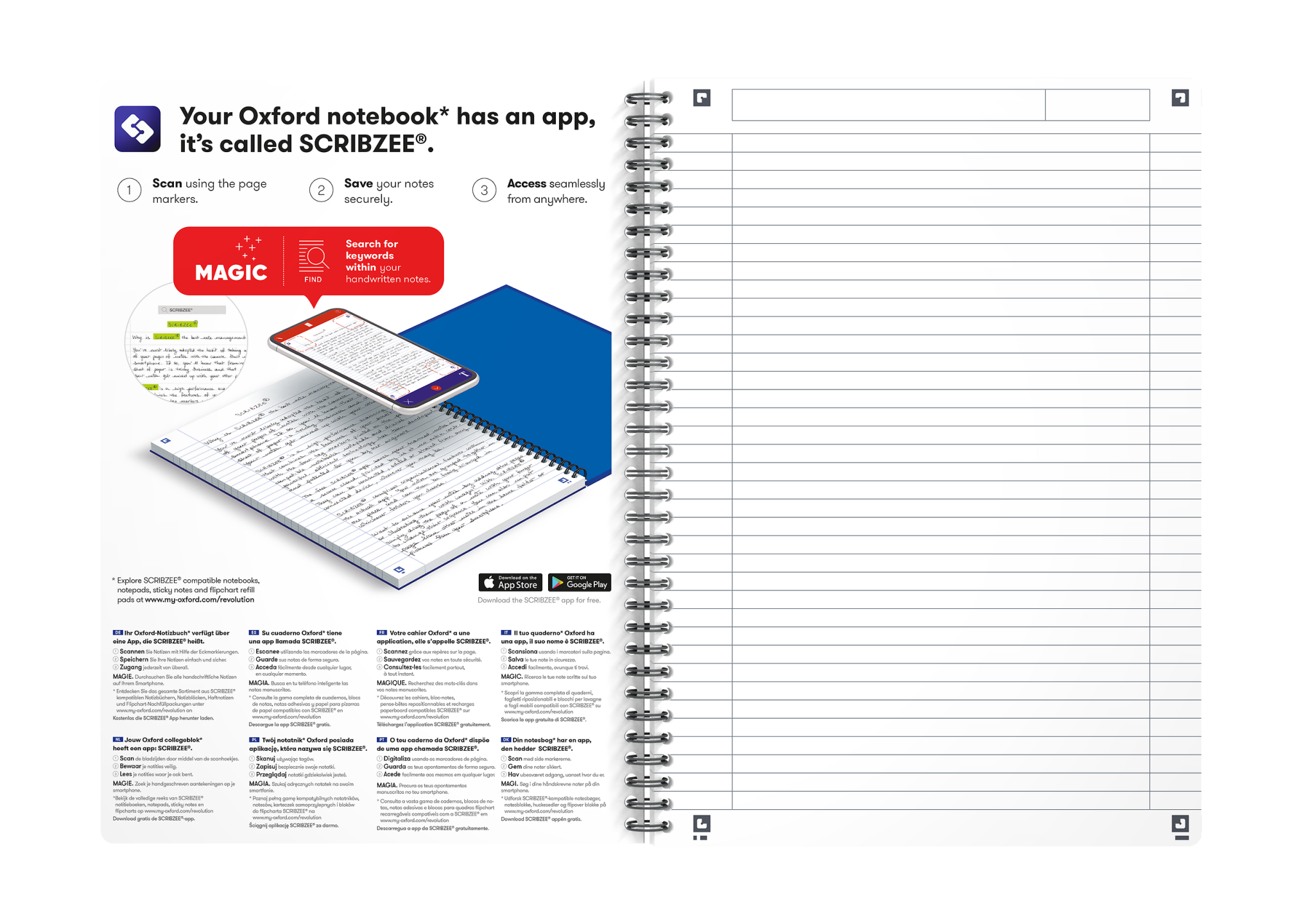 Notebook i A4, linjeret med margen, 180 sider. Takket være det ekstra hvide og glatte OPTIK PAPER® i 90 g/m2 kan du skrive på begge sider af arket, uden at blækket bløder igennem. De specialdesignede sider hjælper dig med at organisere dine noter. Alle sider er udstyret med smart linjering og sidehoved, hvor du kan skrive mødets emne eller en overskrift foruden datoen, samt dobbelt margen, så du kan nummerere eller fremhæve noter eller lave punktopstillinger. Sort plastovertrukket dobbeltspiral i ryggen sikrer holdbarheden og gør det samtidig muligt at lægge notesbogen fladt mod underlaget eller at åbne den helt op, hvilket sikrer maksimal komfort og fleksibilitet. Omslaget af polypropylen i dobbelt tykkelse med elegant metallic overflade kan modstå masser af slid og strabadser i lang tid fremover. Arkene er kompatible med den gratis Scribzee®-smartphoneapp, så du nemt kan scanne, gemme og organisere dine noter. OXFORDs eksklusive Optik Paper® har både fået EU’s miljømærke (lav miljøbelastning fra de papirfabrikker, der producerer papiret) og PEFC-certificering (bæredygtig skovforvaltning). Aftagelig og flytbar bogmærkelineal af plast, der gør det nemt at tegne linjer, måle længder og finde det rigtige sted.