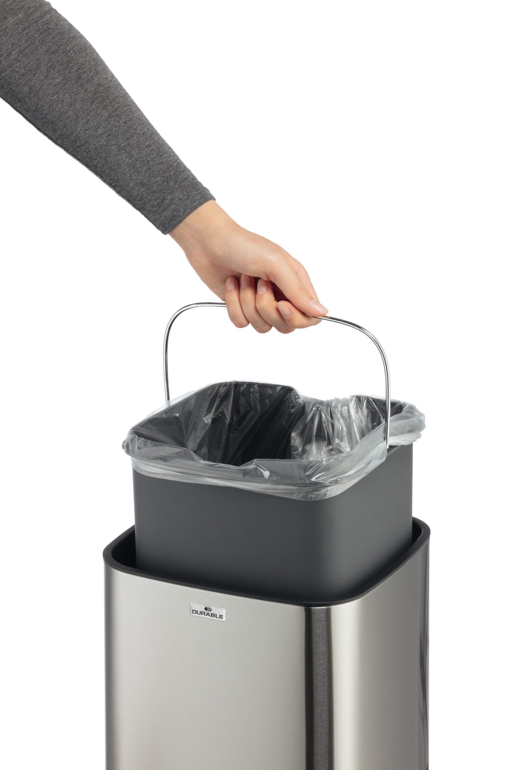 Affaldsspand fremstillet af rustfrit stål med en overflade, der beskytter mod fedtede fingeraftryk. Sensorstyret softclose-låg, der åbner, når du fører hånden hen over låget uden at røre ved det. Lukker automatisk efter 5 sekunder med en synlig nedtælling af sekunderne. Drives af 4 AA-batterier. Batterier medfølger ikke, sørg for, at alle batterier er af samme fabrikat. Kan også bruges manuelt. Aftageligt låg for nem tømning af den udtagelige 12-liters beholderen med håndtag. Affaldsposen fastgøres gennem et hul i siden af beholderen. Skridsikker beskyttelse på undersiden. Fremstillet af op til 45% recirkuleret materiale og er 100% genanvendelig. Dimensioner: 240 x 430 x 240 mm (BxHxD).