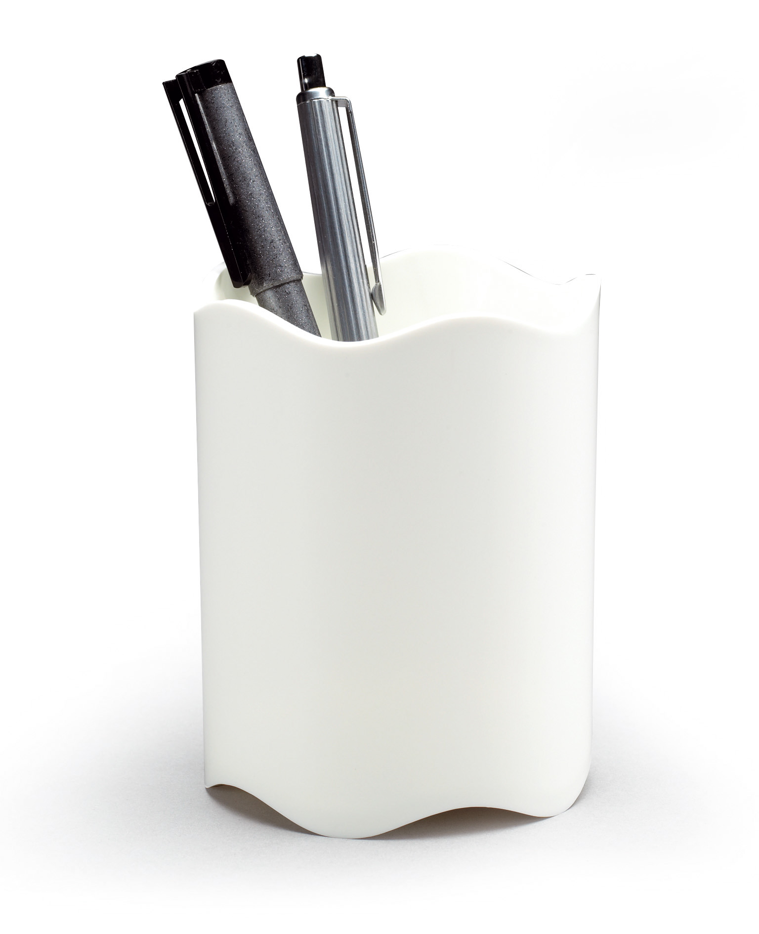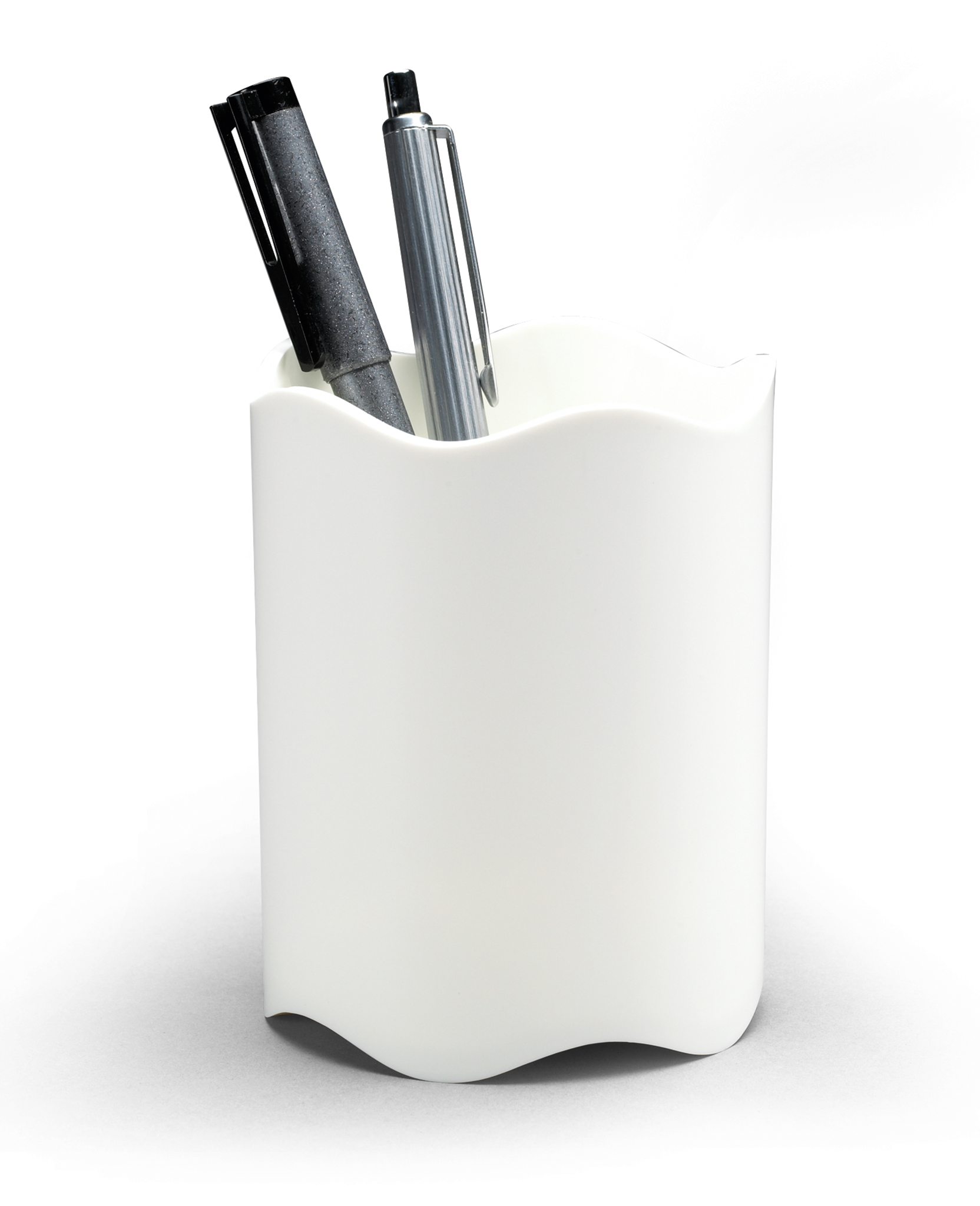 Rund penneholder med bølget kant til opbevaring af penne, sakse osv. Mål: ø 80mm. Højde 102mm.
