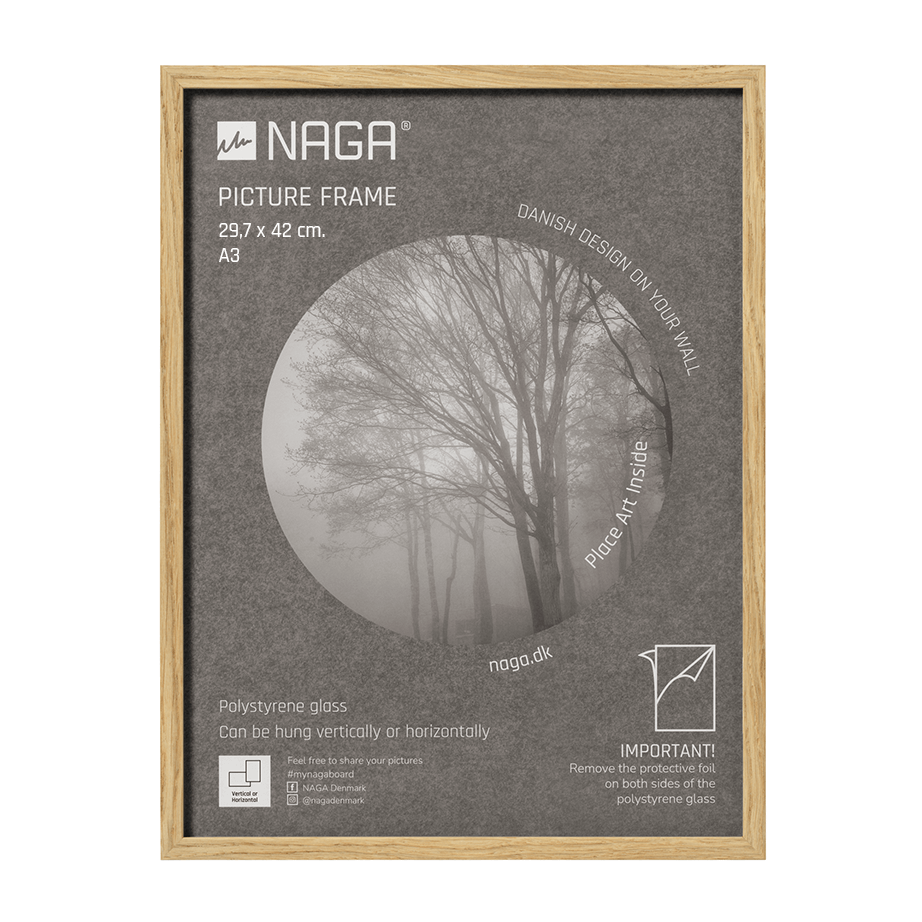 A3 billedramme i massivt egetræSimpel og moderne billedramme med plexiglas udført i massivt FSC®-certificeret egetræ. Den flotte ramme passer til et foto eller en plakat i størrelsen 29,7 x 42 cm, også kaldet A3. Trærammen måler 1,2 cm i bredden og 2,2 cm i dybden og giver et stilfuldt udtryk. Plexiglasset gør rammen lettere og nemmere at håndtere, end hvis den var lavet af glas. Det er et mere sikkert valg, især i hjem med børn eller kæledyr, da det ikke splintres ved stød.Rammen har metalophæng bagpå, så du nemt og hurtigt kan hænge den op. Rammen kan både hænge vertikalt og horisontalt. Fås også i andre størrelser, så du kan skabe en sammenhængende billedvæg.
