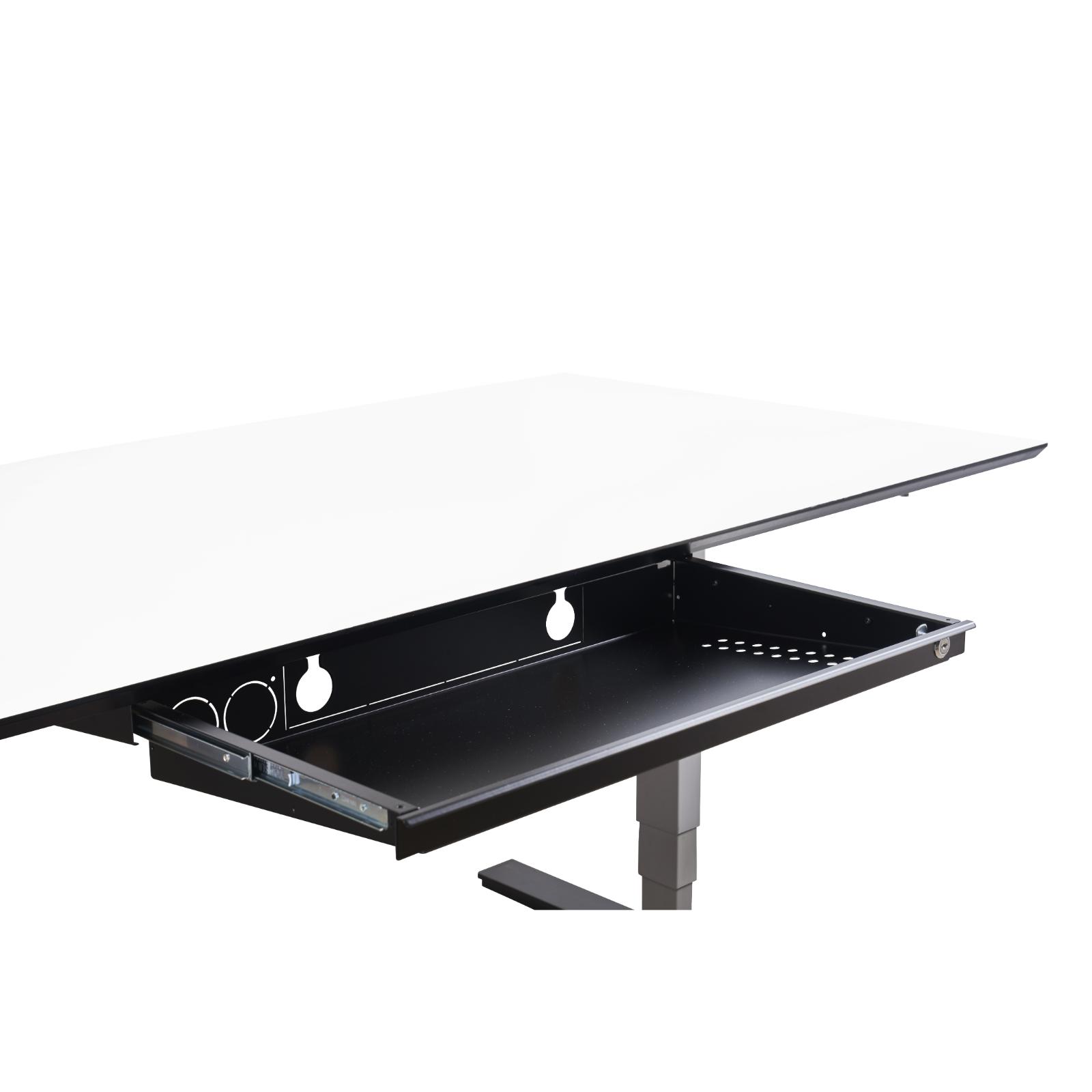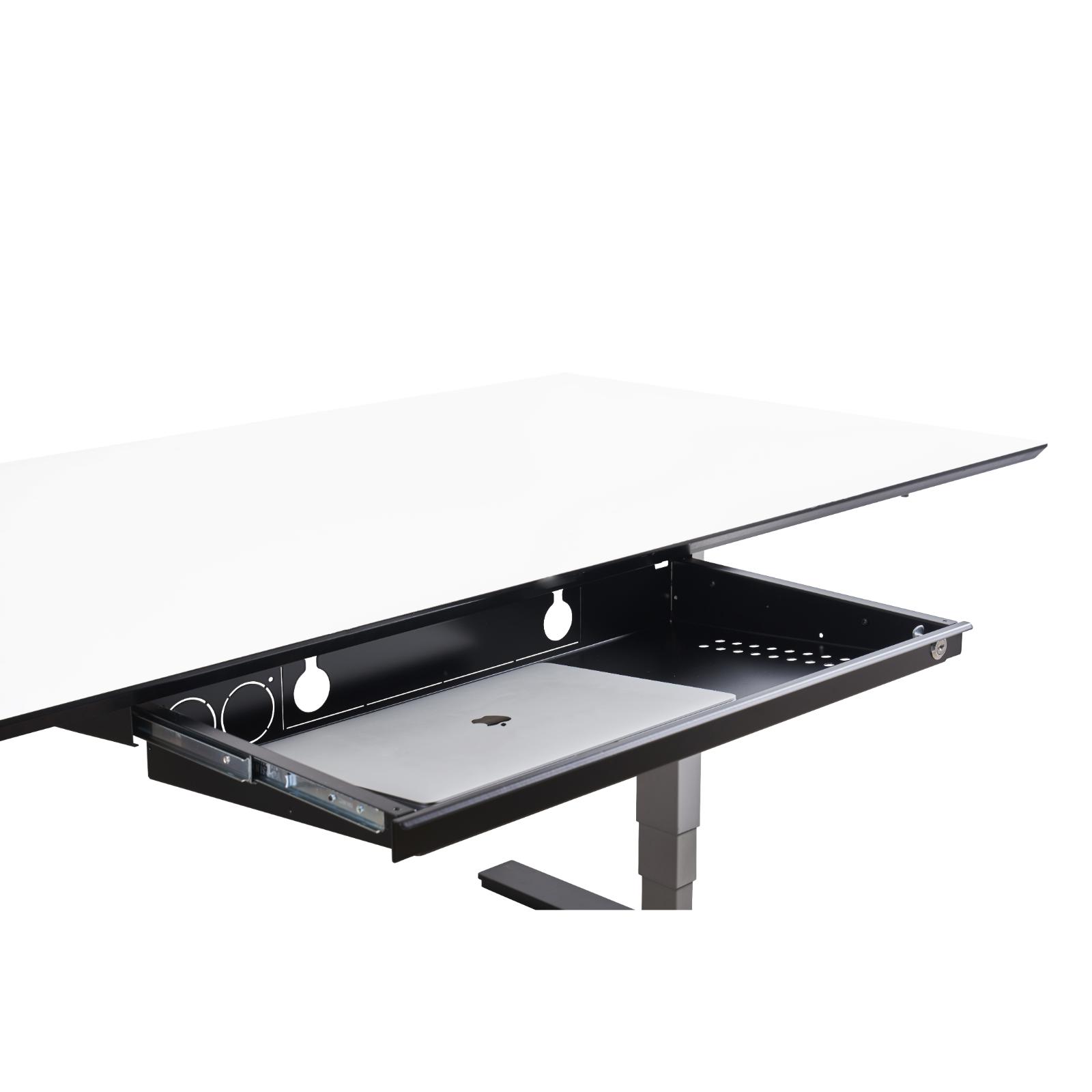Vores velkendte laptopskuffe er ikke blot funktionel og effektiv, men har ligeledes et design, som tager højde for diversiteten i kontormiljøet. Skuffen skaber, med sin front på 38 mm., et let udtryk, som understøtter god benplads ved skrivebordet. Ydermere leveres skuffen med lås og 110% udtræk, hvilket skaber maksimal udnyttelse af ethvert af skuffens hjørner.