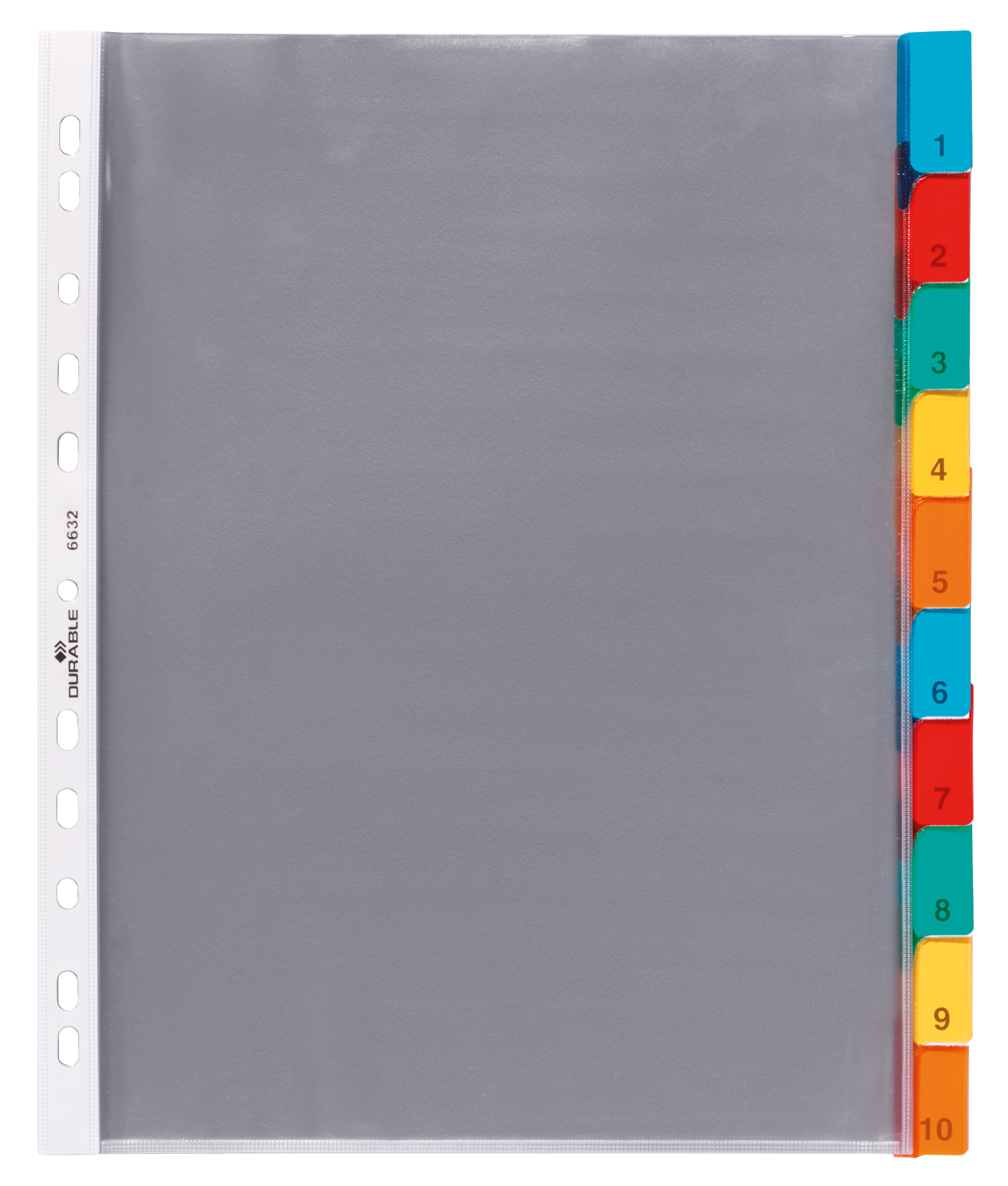 Faneblade /plastlomme i kraftig plast med dobbelte farvede faner, hvor fanepapiret kan udskiftes. For inddeling af dokumenter i plastlommer. Universalhullet. 10-delt.
