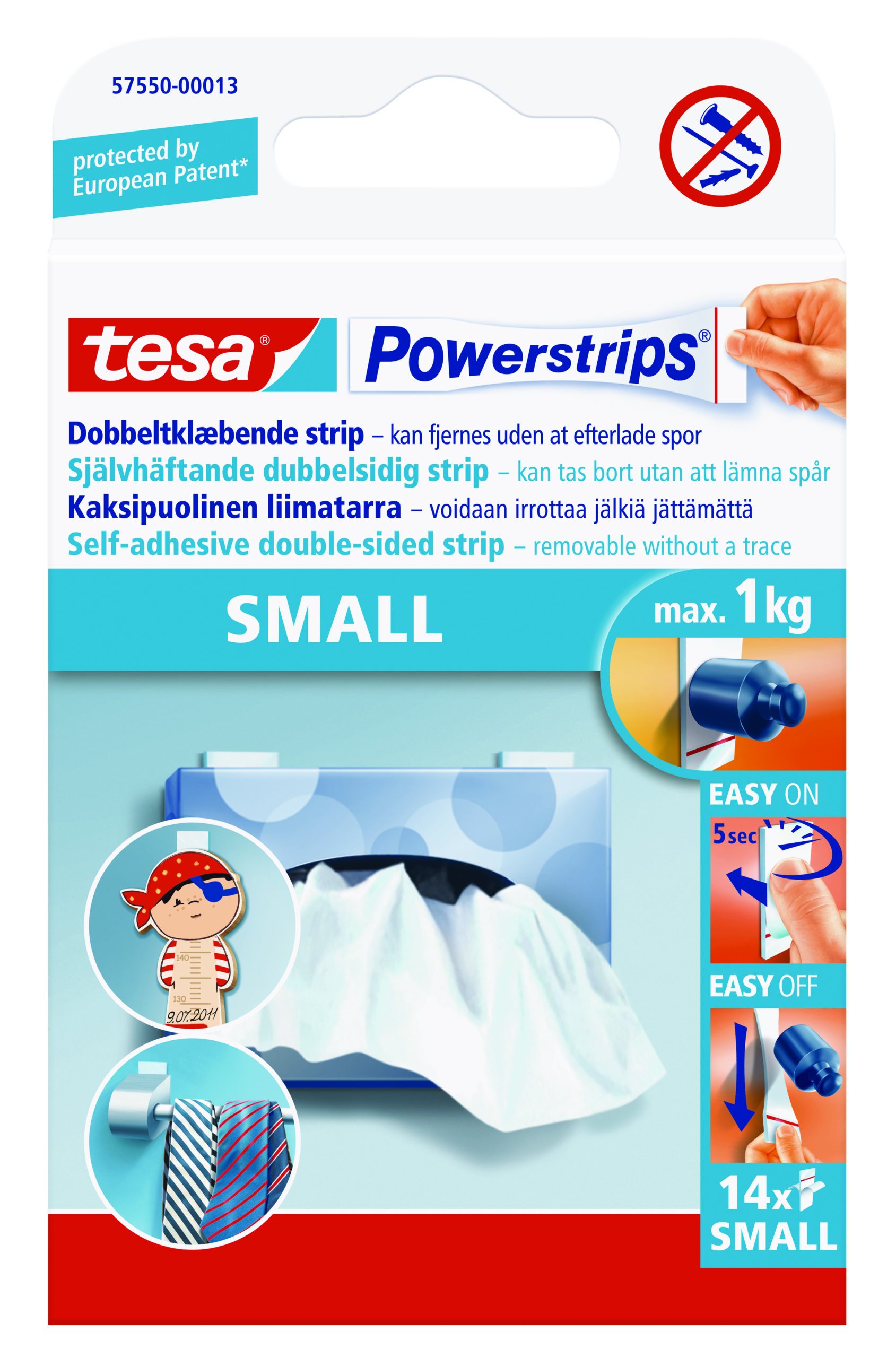 Tesa Powerstrips er praktiske klæbepuder med en høj bæreevne på de fleste overflader som f.eks. glas, fliser, træ og de fleste typer plastik. Limen virker ikke på vinyltapet eller non-stick overflader. Klæbepuden kan fjernes igen uden den efterlader spor. En klæbepude kan bære op til 1 kg.