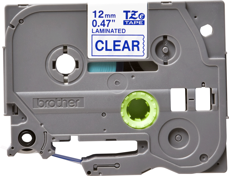 12 mm bred, blå tekst på gennemsigtig lamineret tape, 8 m.