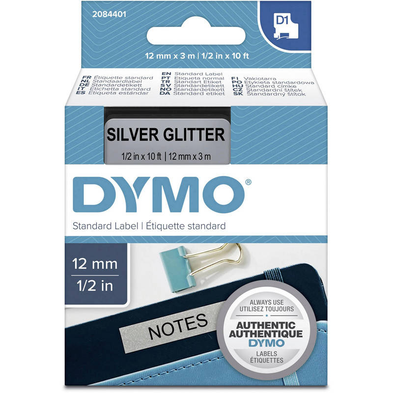 Sølvfarvet prægetape med sort skrift til Dymo D1. Indeholder 3 meter tape, der er 12 mm bredt.