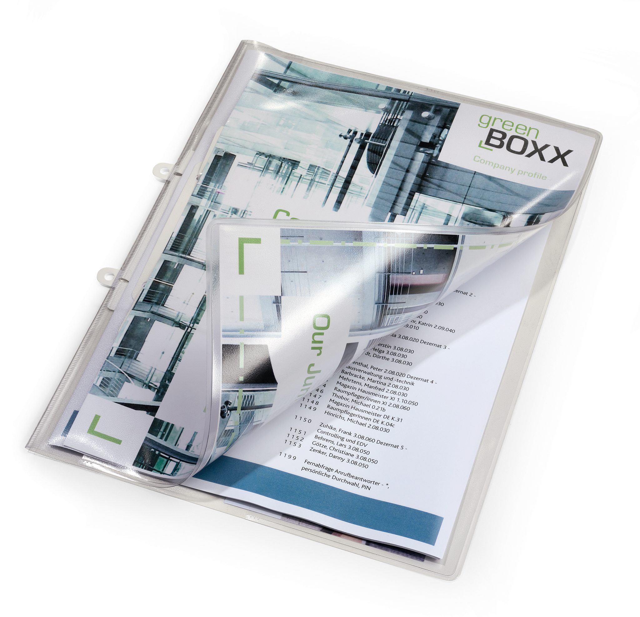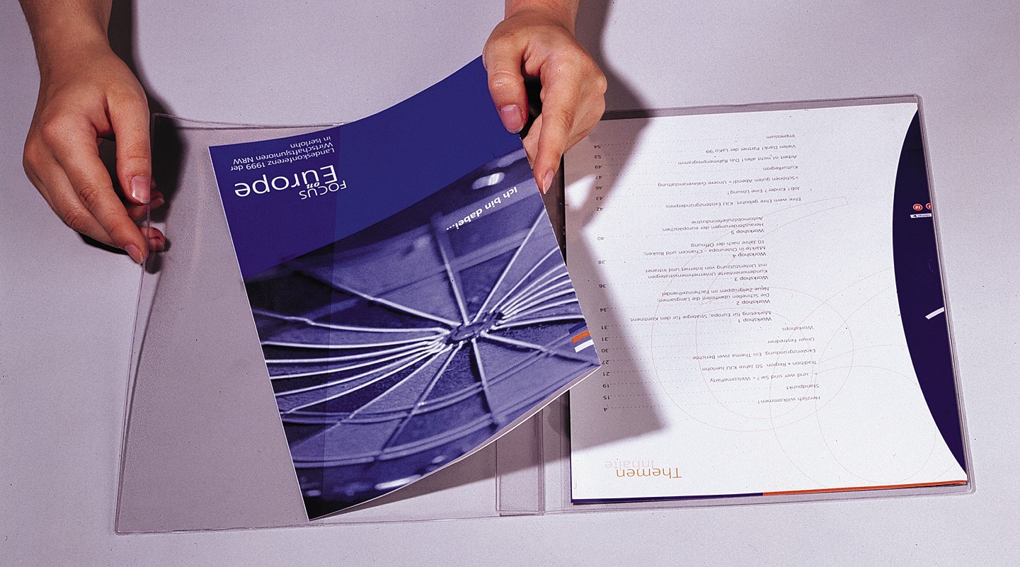 Præsentationsmappe i glasklar plast til visning af dokumenter Opbevaring af ikke-hullede dokumenter i lommer på indersiden af forsiden og bagsiden Kan også sættes i brevordnere og ringbind vha. den udtrækkelige arkiveringsstrip Ideel til forsendelse af salgs- og præsentationsmateriale Til A4-format