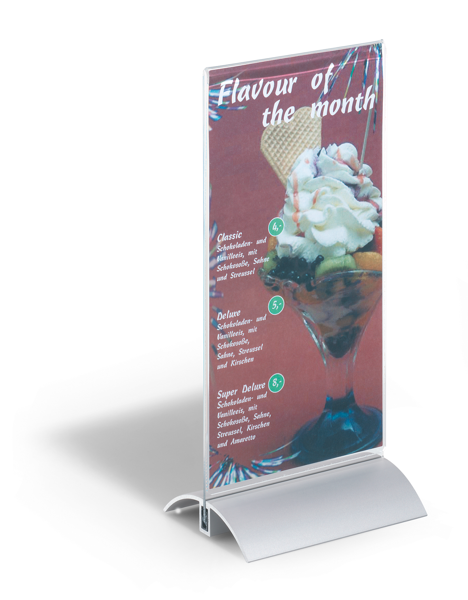 Presenter 1/3 a4stilren bordskilte i klar akryl, læseligt fra begge sider. Fod af aluminium.