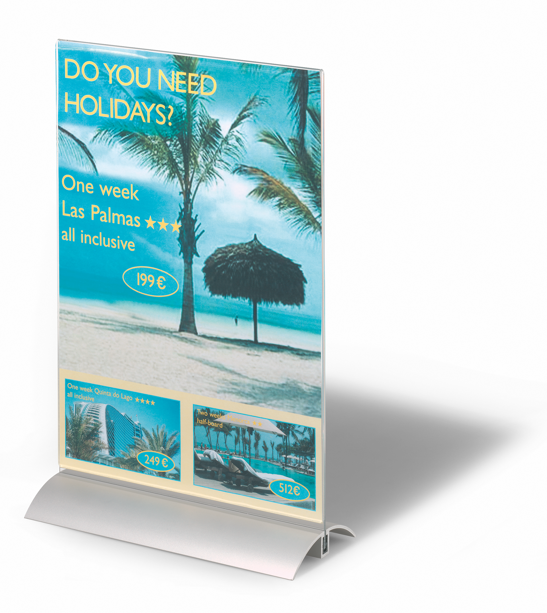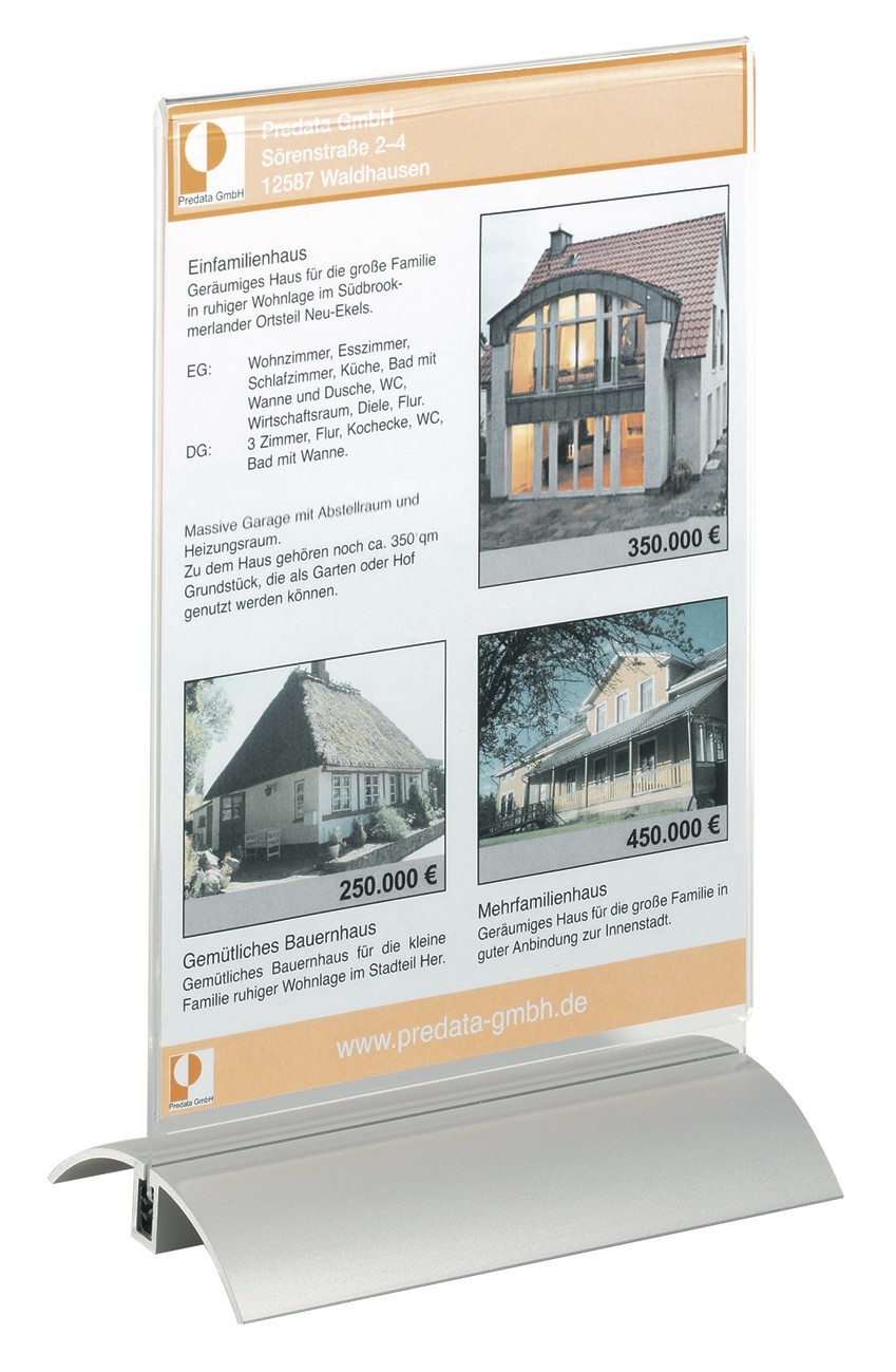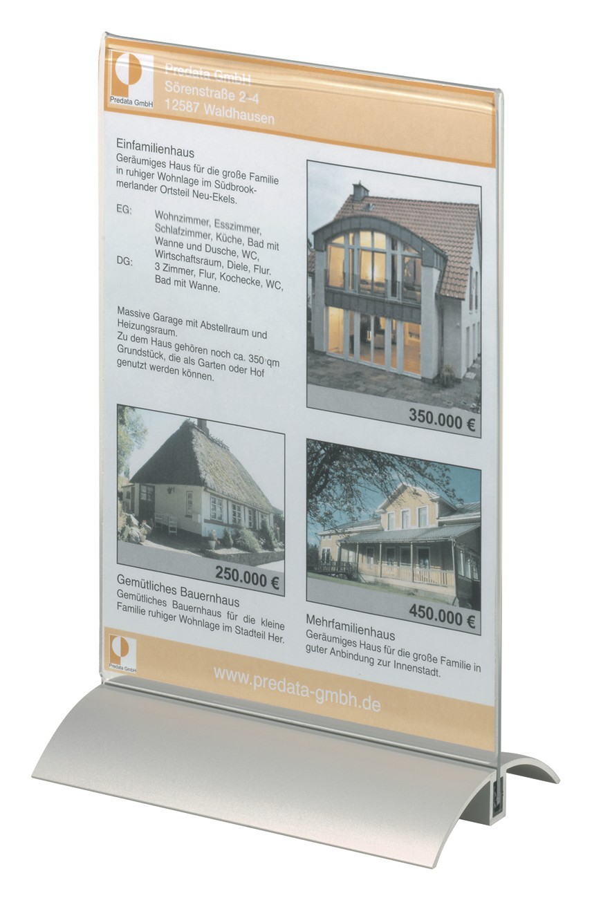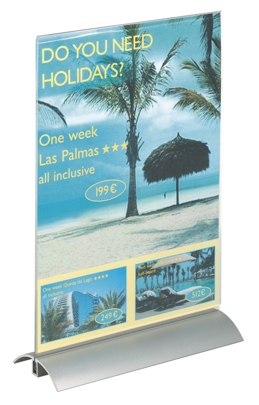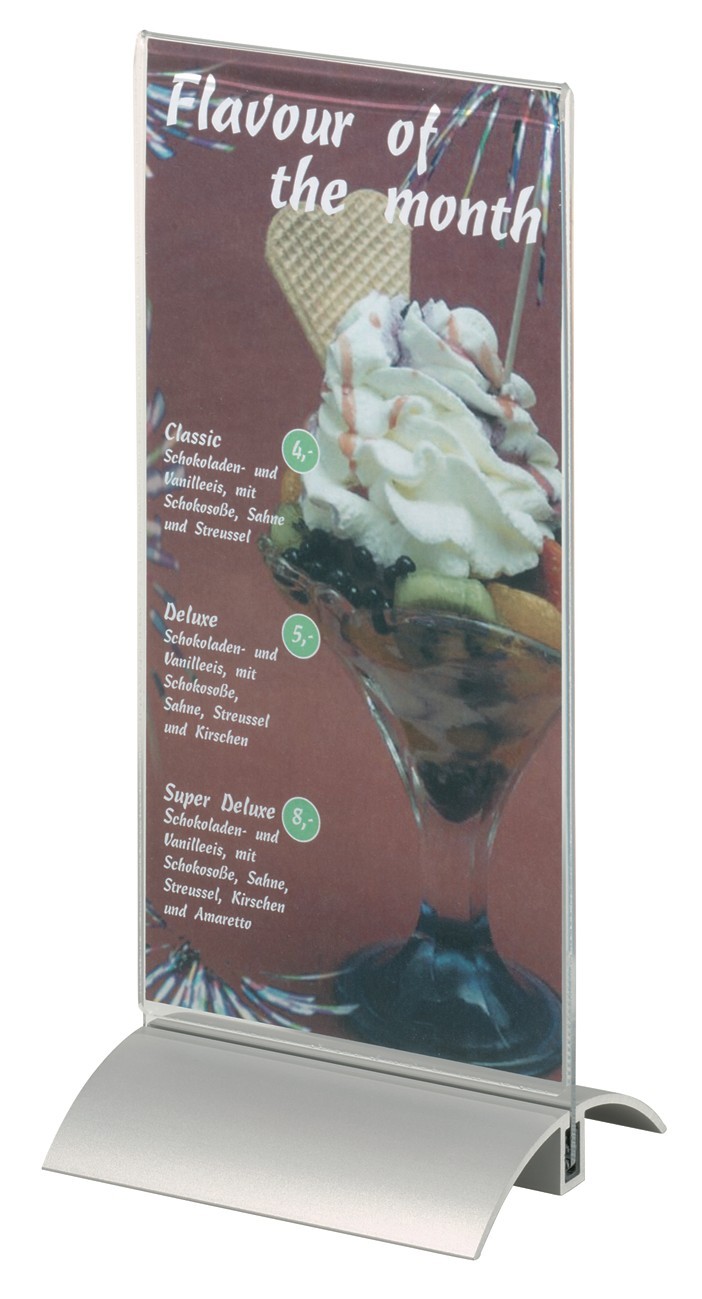 stilren bordskilte til konferencer, møde, prisskilte, receptioner, menuholder i kantiner m v. Skilte i klar akryl, læseligt fra begge sider. Fod af aluminium. Et unikt bremsesystem i foden gør at selve skiltet altid holdes på plads. Til dokumenter i A4 format. Mål skilte: 212x323x85mm (BxHXD)