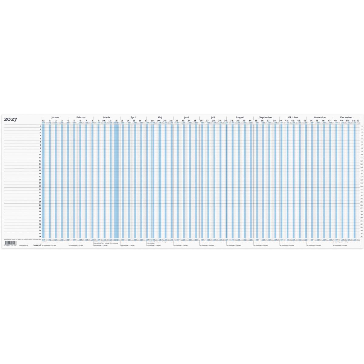 Format: A4. Layout: Tværformat. År/blad. Kalendarium: 2027-01-01 – 2027-12-31. Sideantal: 2. Miljøoplysninger: FSC®. Varemærke: Mayland.