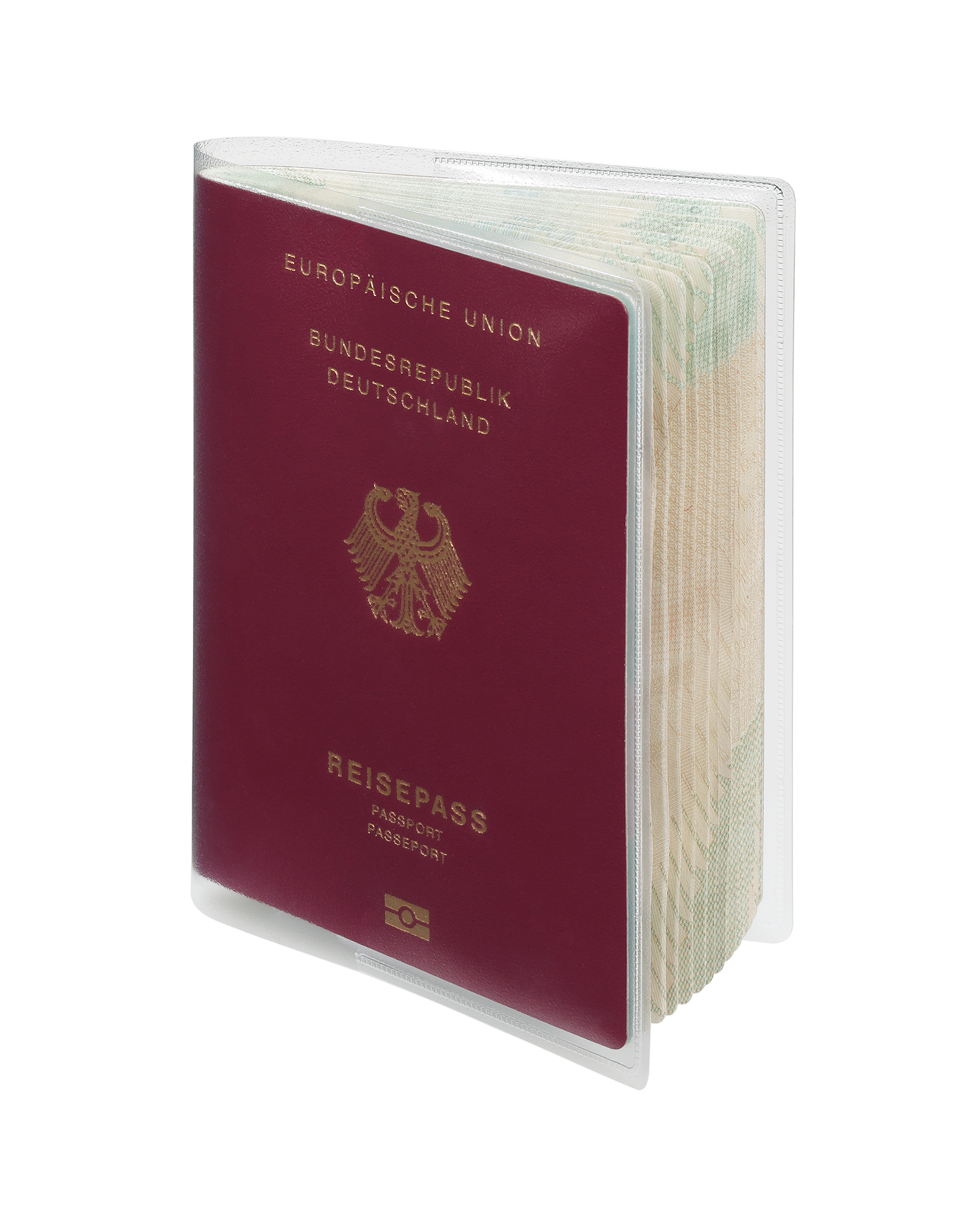 Udstanset dobbeltlomme til nationale og internationale pas. Indstikningsflap til højre og venstre Fremstillet af ekstra stærk, slidstærk plastik Rivefast Indvendige mål: 189 x 129 mm