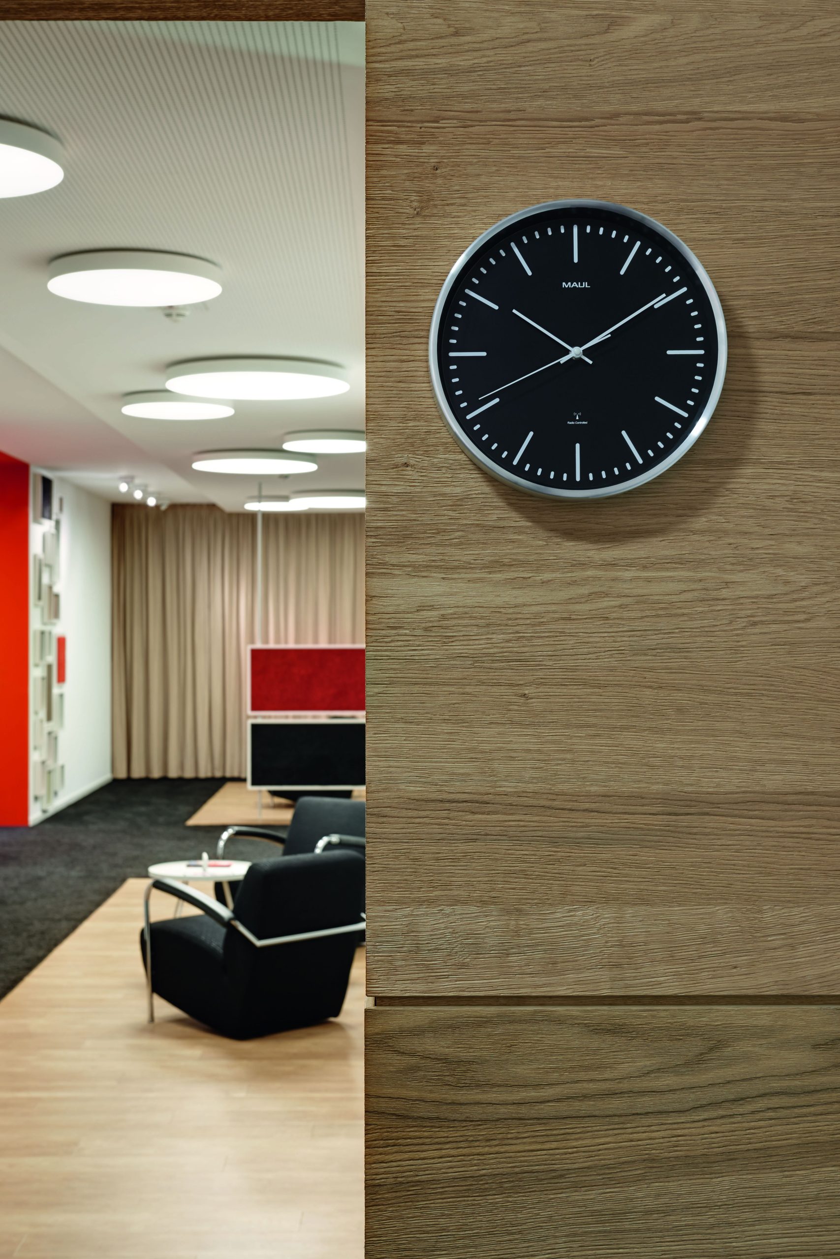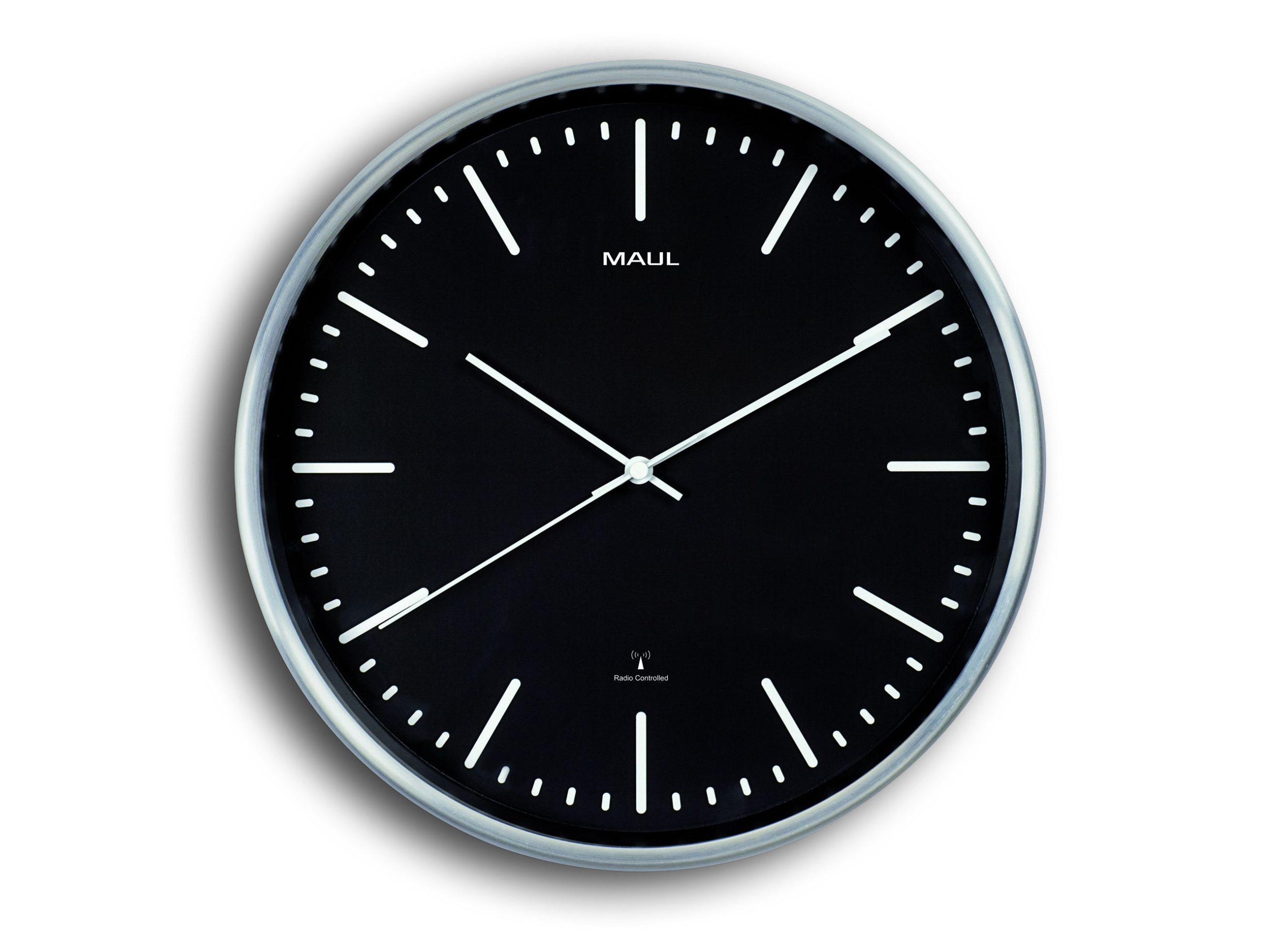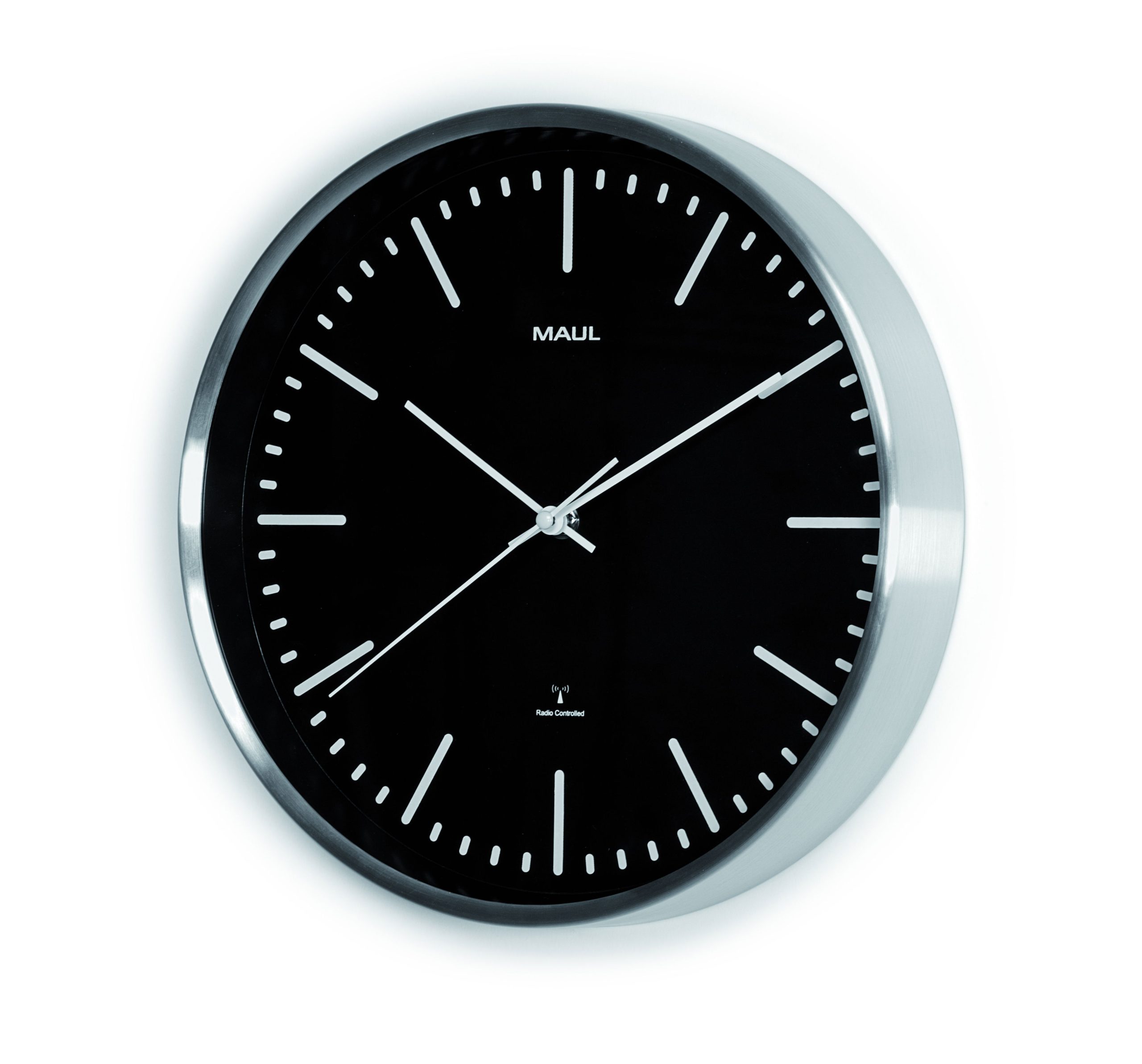 Radiostyret Vægur Sort MAULfly Ø30,5 cm MAULfly er et stilrent og moderne vægur i sort med sølvfarvet ramme. Den smalle, børstede aluminiumsramme giver uret et eksklusivt og let udtryk, som passer perfekt ind i moderne kontormiljøer og mødelokaler. Uret har en sort urskive med tydelige time- og minutmarkeringer samt slanke, diskrete visere, der sikrer optimal aflæsning på afstand. Den har en flad front i mineralglas. Væguret er radiostyret og synkroniserer automatisk tiden via DCF77-signal. Uret justerer selv mellem sommer- og vintertid og modtager signalet op til ca. 1.500 km fra senderen i Mainflingen, Tyskland. Ved eventuel signalforstyrrelse, eksempelvis i bygninger med meget metal, kan tiden justeres manuelt. Leveres inkl. 1 x AA batteri. Mål: Ø 30,5 cm, dybde 5 cm