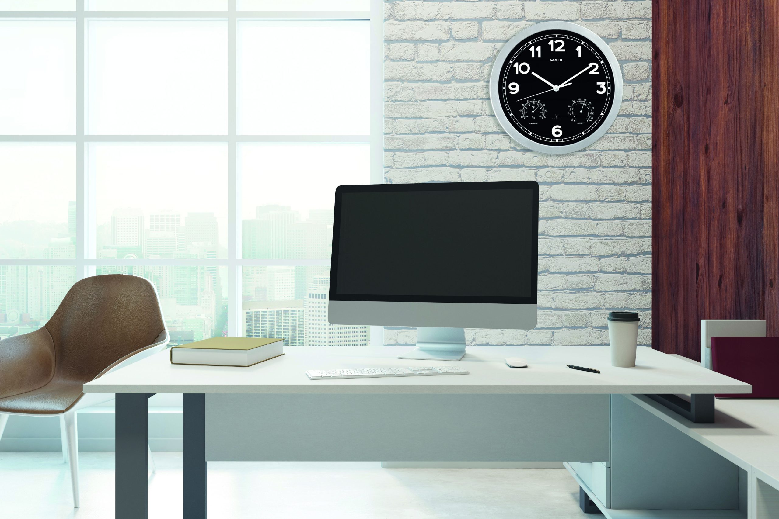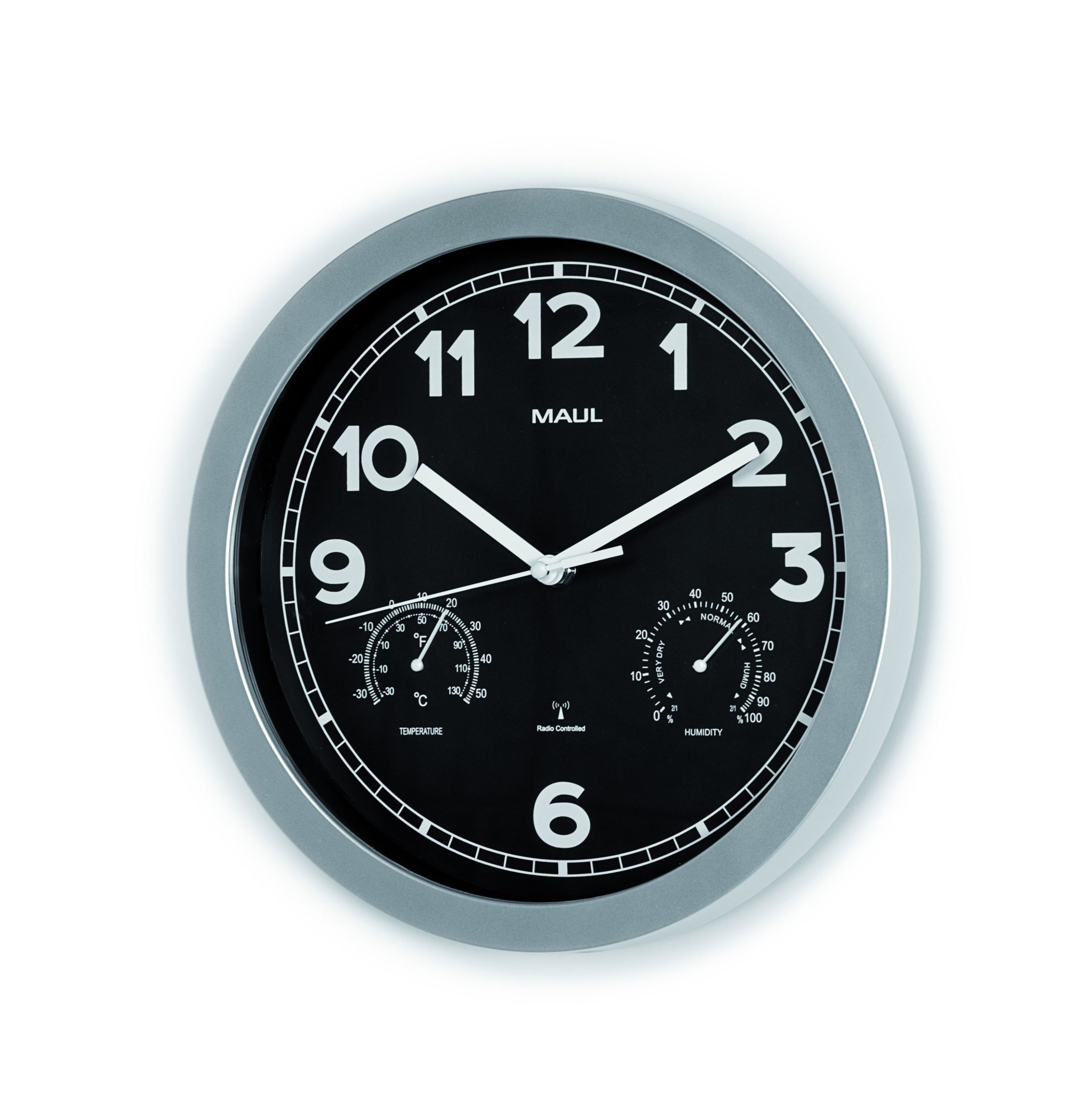 Radiostyret Vægur med termometer og hygrometer Sølv MAULdrive Ø30 cm MAULdrive er et elegant og funktionelt vægur, der kombinerer præcis radiostyret tid med praktisk overvågning af indeklimaet. Væguret har et stilrent design med sort urskive og sølvfarvet ramme. Den sorte urskive med hvide, brede arabertal giver optimal kontrast og sikrer nem aflæsning – også på afstand. Minut- og timemarkeringer er tydeligt angivet, og tallene har en højde på 2,5 cm for ekstra god synlighed. Uret er radiostyret og synkroniserer automatisk tiden via DCF77-signalet fra Mainflingen i Tyskland med en rækkevidde på op til ca. 1500 km. Det betyder, at uret selv justerer til korrekt tid samt automatisk skifter mellem sommer- og vintertid. Ved eventuel signalforstyrrelse, eksempelvis i bygninger med meget metal, kan tiden justeres manuelt. MAULdrive er udstyret med både termometer og hygrometer, så du nemt kan holde øje med temperatur og luftfugtighed i rummet. Det gør uret ideelt til kontorer, undervisningsmiljøer og hjem, hvor et sundt indeklima er vigtigt. Temperaturmåling: -30° til +50 °C Luftfugtighed: 0–100 % Uret leveres inkl. 1 x AA-batteri og er klar til brug. Monteres på væggen via integreret ophæng. Produktmål: Ø 30 x D 5 cm