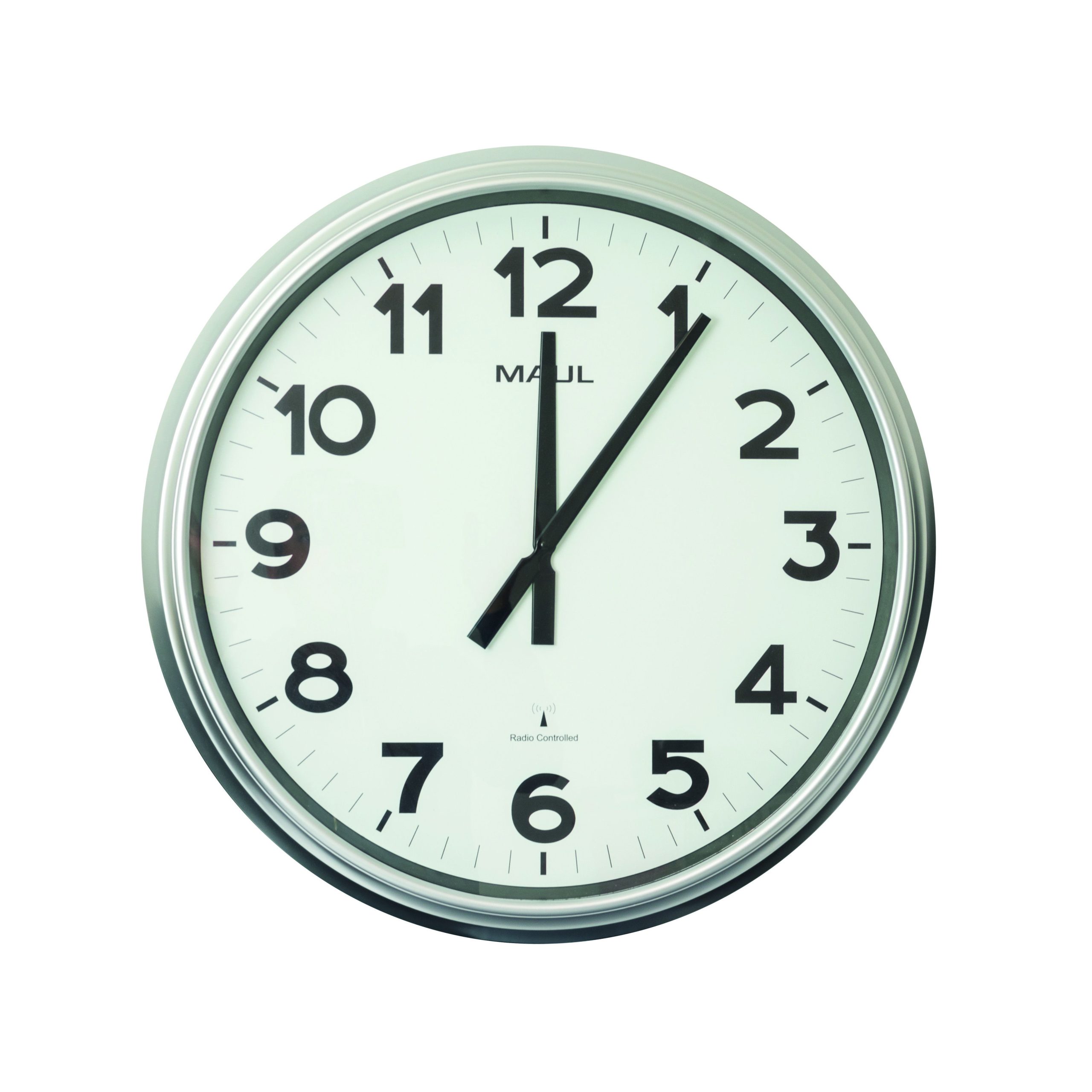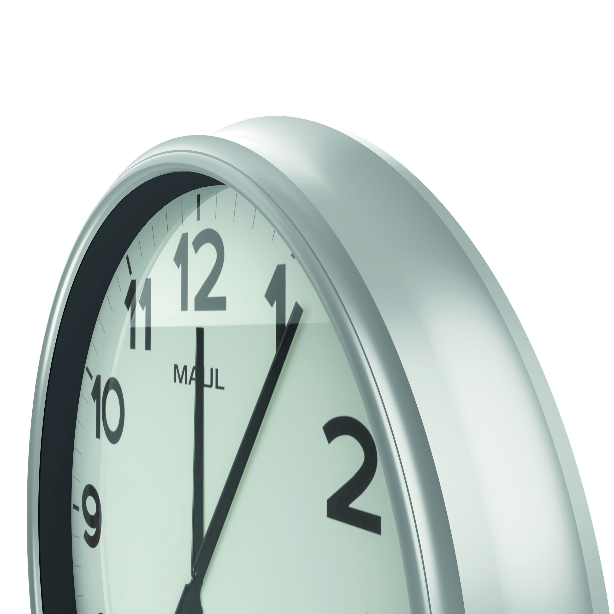 Radiostyret Vægur Sølv MAULride Ø61 cm Ekstra stort vægur med en diameter på 61 cm, designet til store rum, hvor tiden skal kunne aflæses tydeligt på afstand. Uret har hvid urskive med sorte arabertal og sorte minut- og timeinddelinger, som sikrer høj kontrast og optimal læsbarhed selv op til 50 meter væk. Ideelt til haller, auditorier, foyerer og andre større fællesområder. Den radiostyrede funktion synkroniserer automatisk tiden via DCF77-signalet fra Mainflingen i Tyskland med en rækkevidde på op til ca. 1500 km. Det betyder, at uret selv justerer til korrekt tid samt automatisk skifter mellem sommer- og vintertid. Ved eventuel signalforstyrrelse, eksempelvis i bygninger med meget metal, kan tiden justeres manuelt. Den brede, sølvfarvede ramme i brudsikker plast giver uret et markant og professionelt udtryk. Fronten er beskyttet af fladt mineralglas i 1,3 mm tykkelse, som sikrer en klar og holdbar overflade. Uret leveres inkl. 1 stk. AA-batteri. Produktmål: Ø 61 x D 7,1 cm