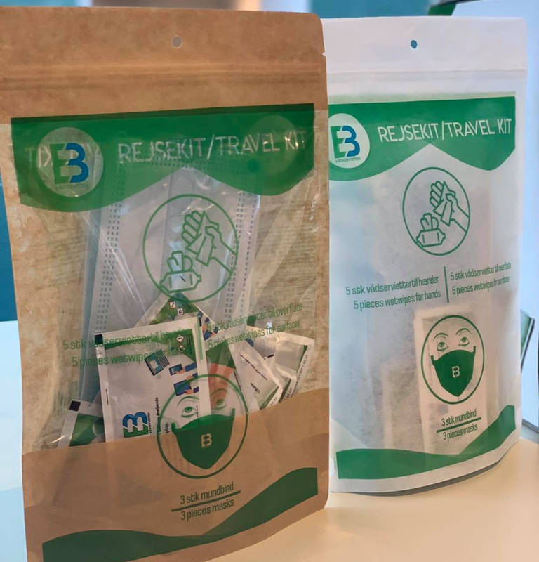 3 stk. mundbind, 5 stk. vådservietter til overflader og 5 stk. vådservietter til hænder i en praktisk lynlåspose, der sikrer at mundbindene ikke bliver beskidte. Posen fylder ikke ret meget, og er derfor nem at have med i kufferten, handskerummet eller rygsækken.